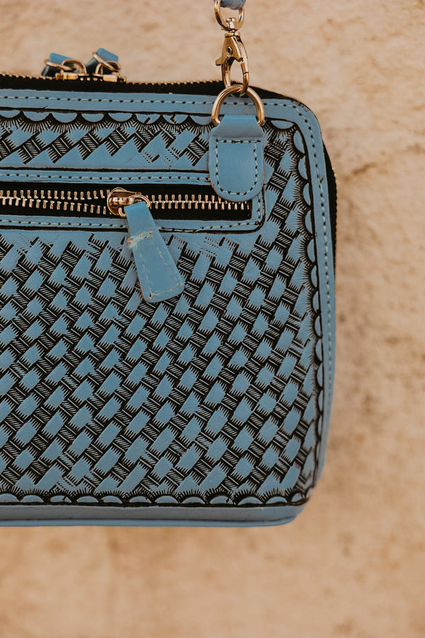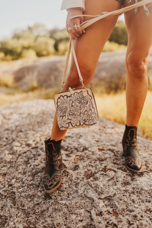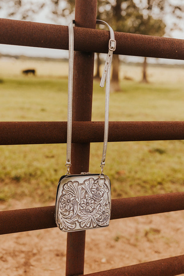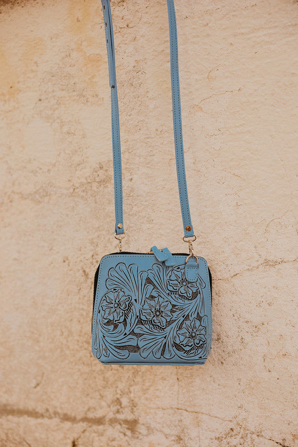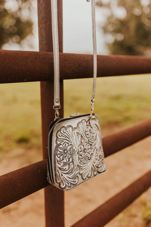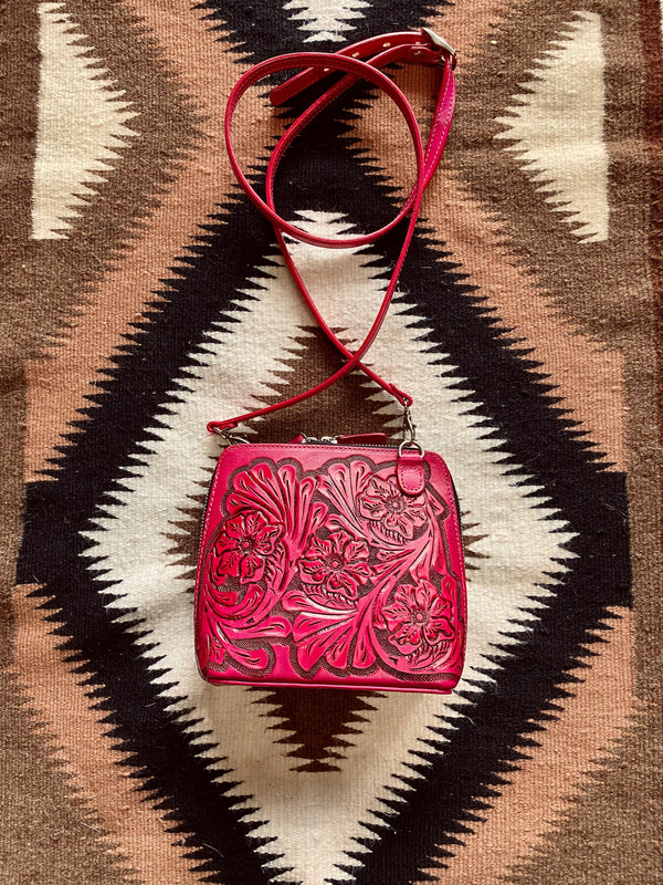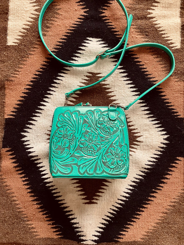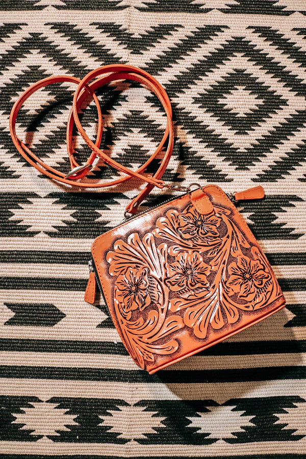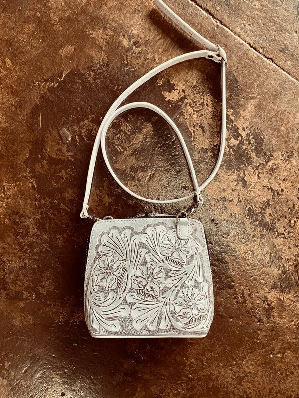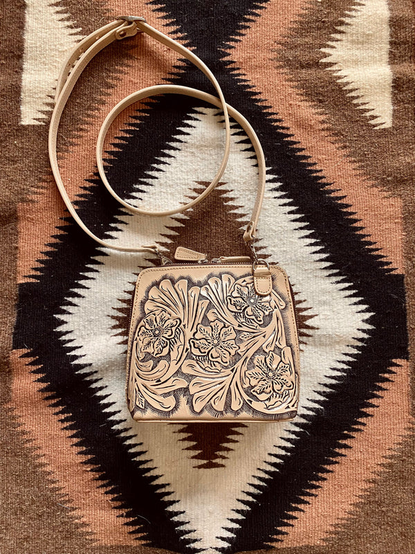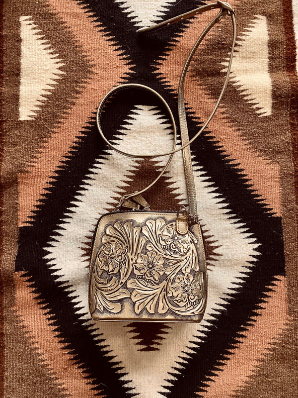 Tooled Leather Crossbody Purse 8" x 7" x 3" Zipper closure Perfect compact size