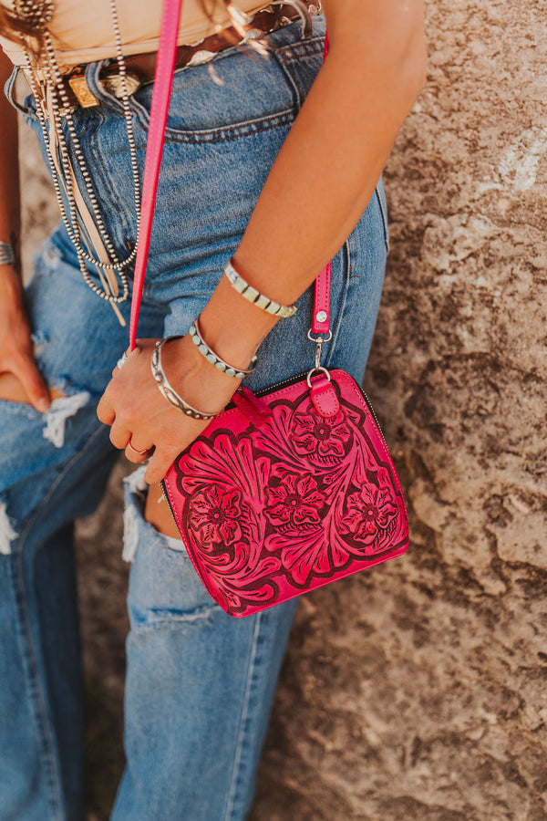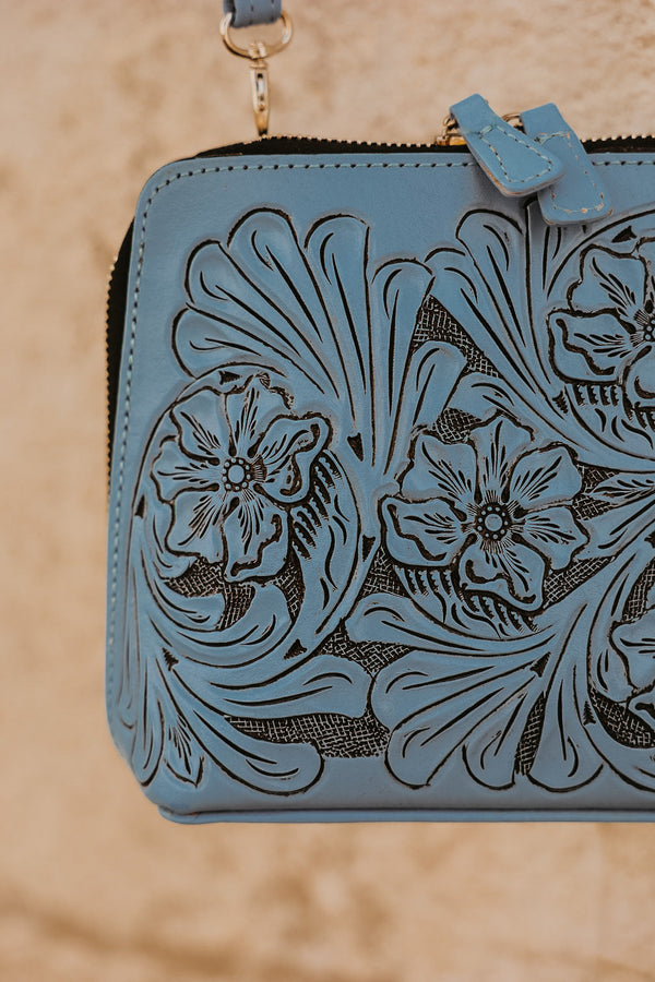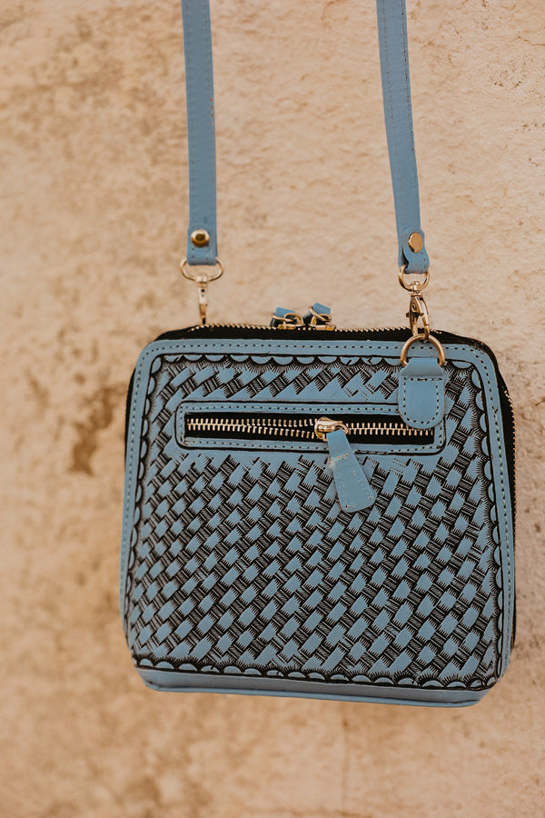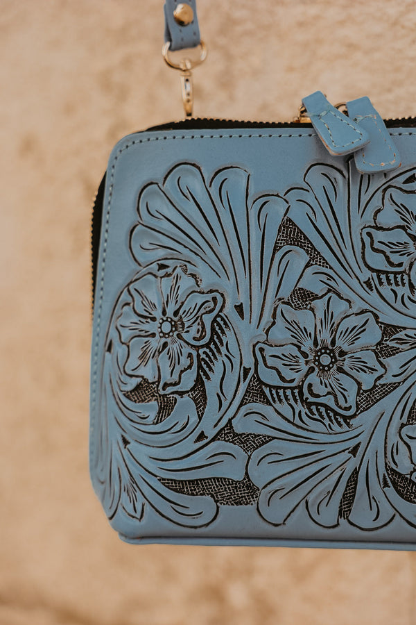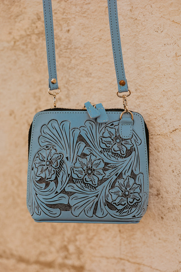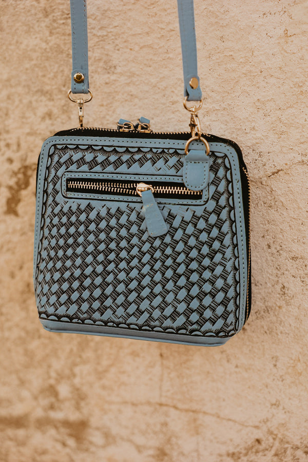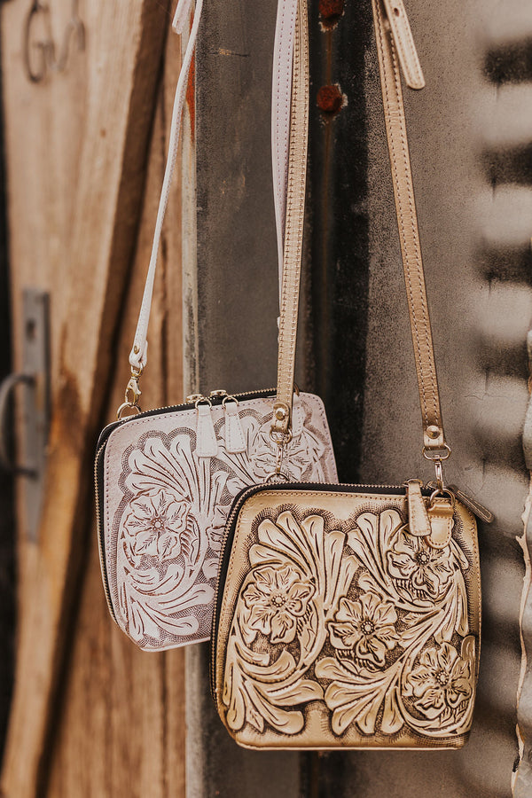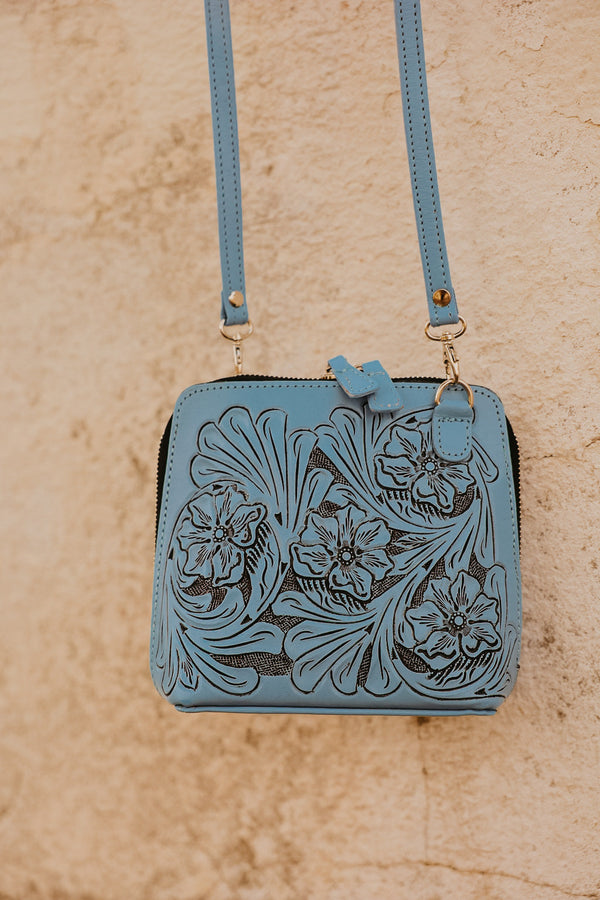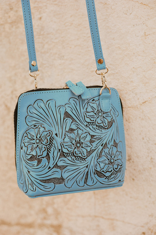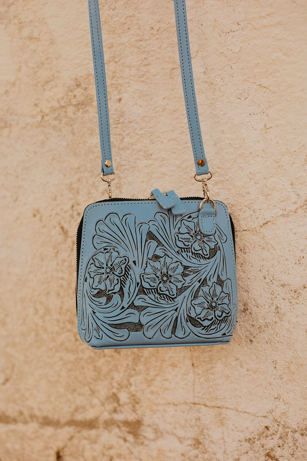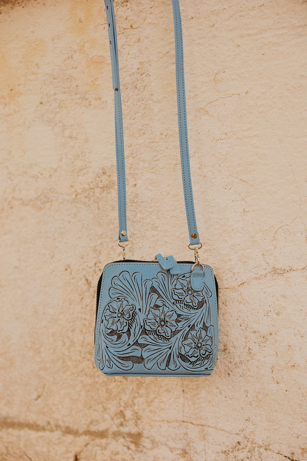 Tooled Leather Crossbody Purse 8" x 7" x 3" Zipper closure Perfect compact size