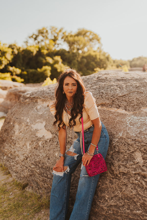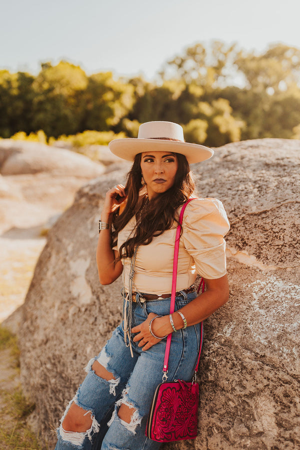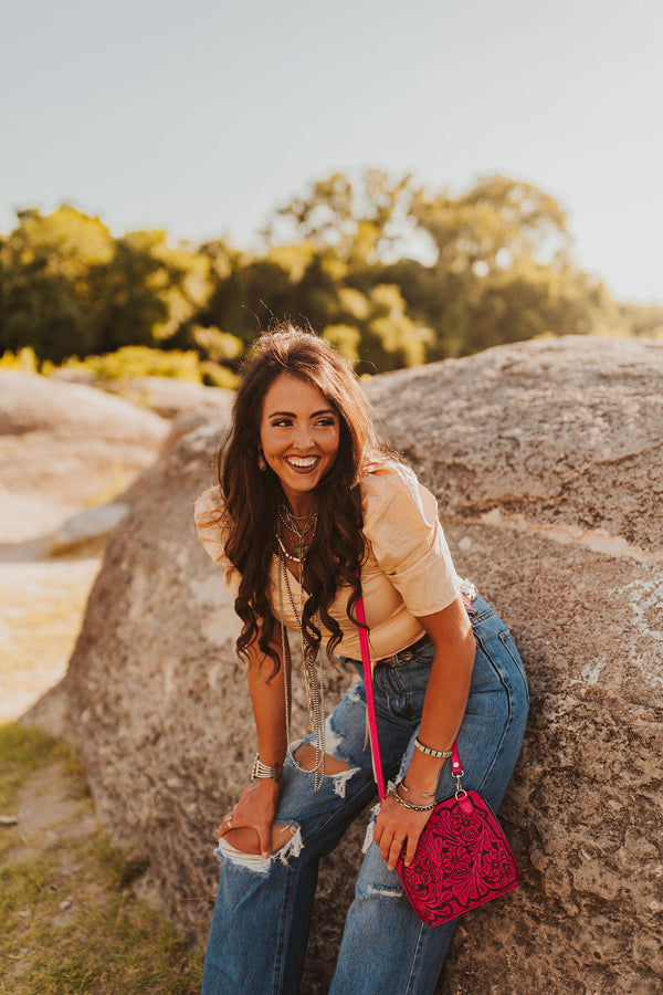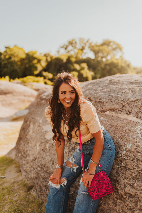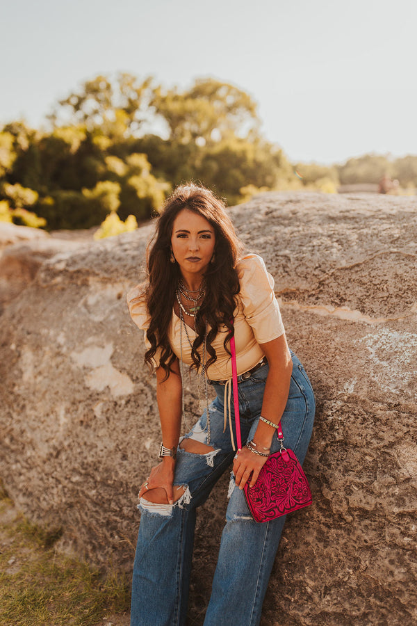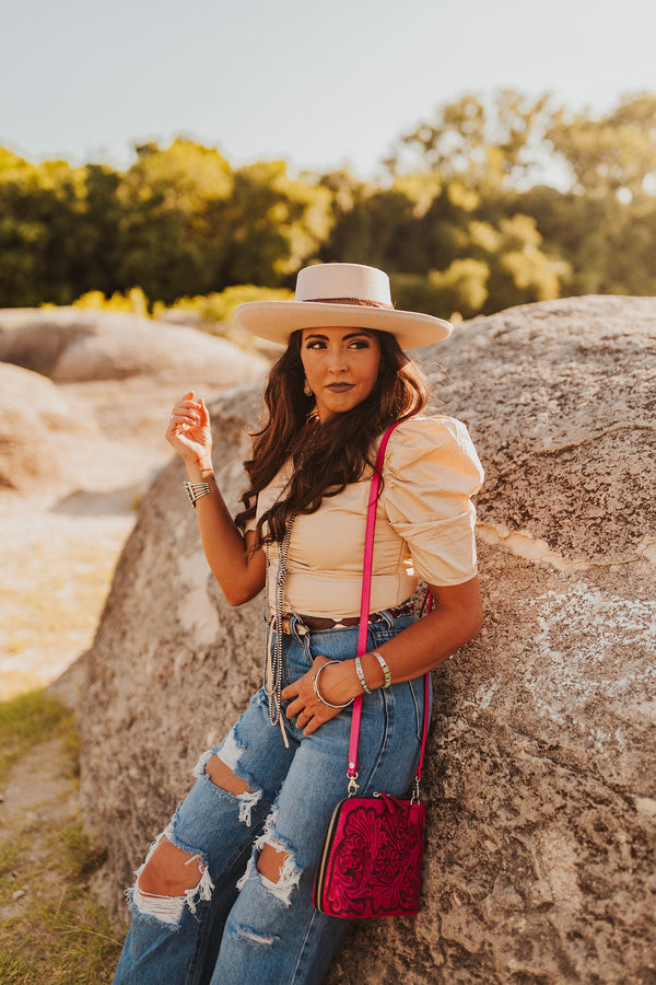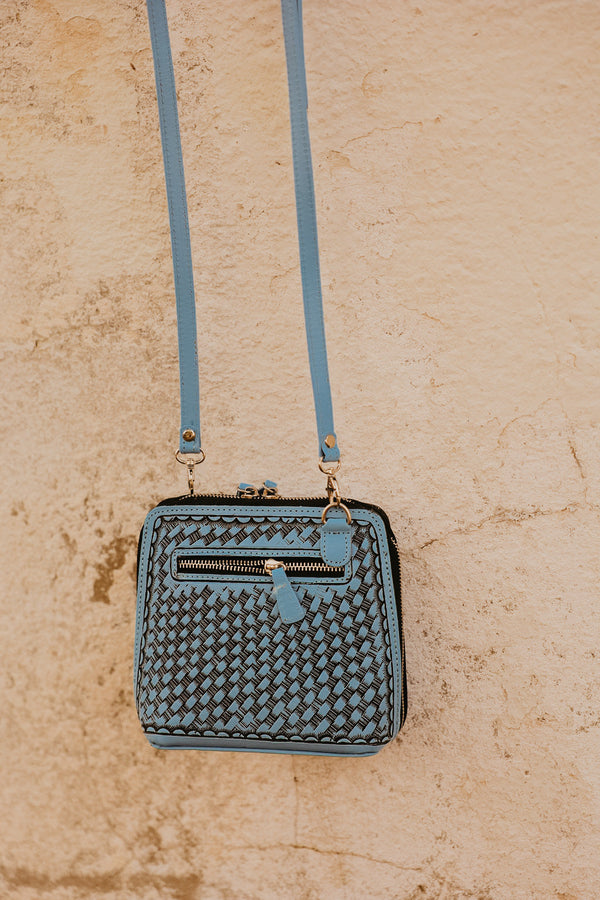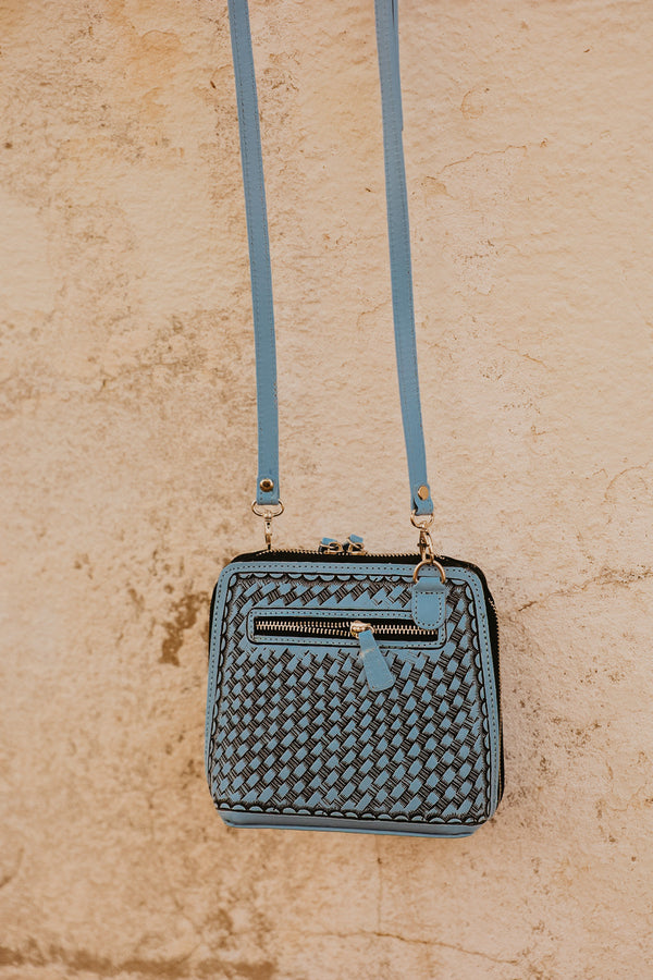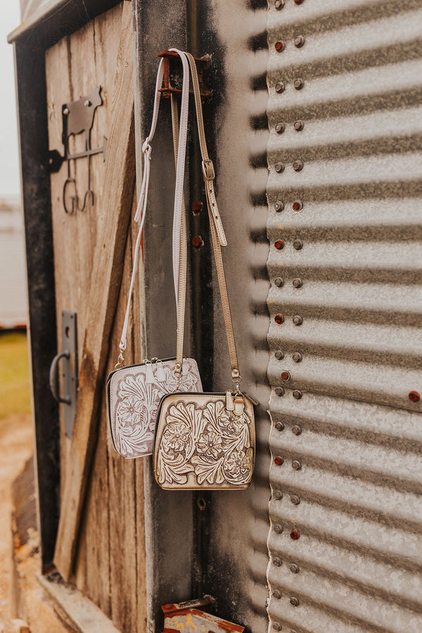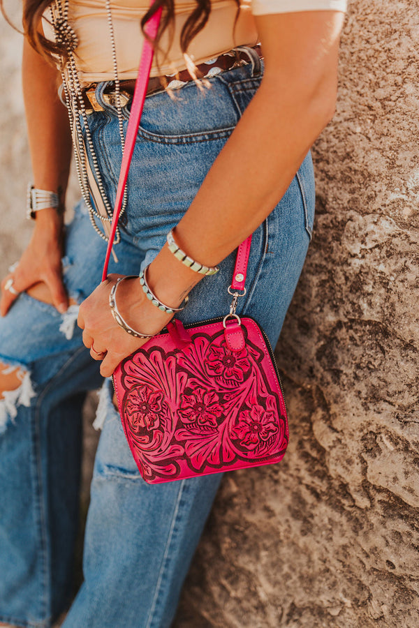 Tooled Leather Crossbody Purse 8" x 7" x 3" Zipper closure Perfect compact size
