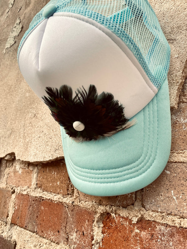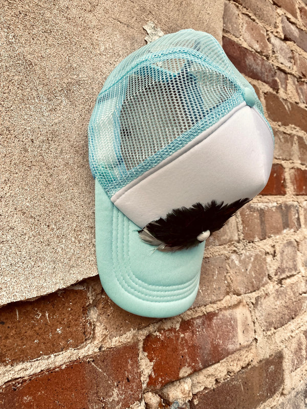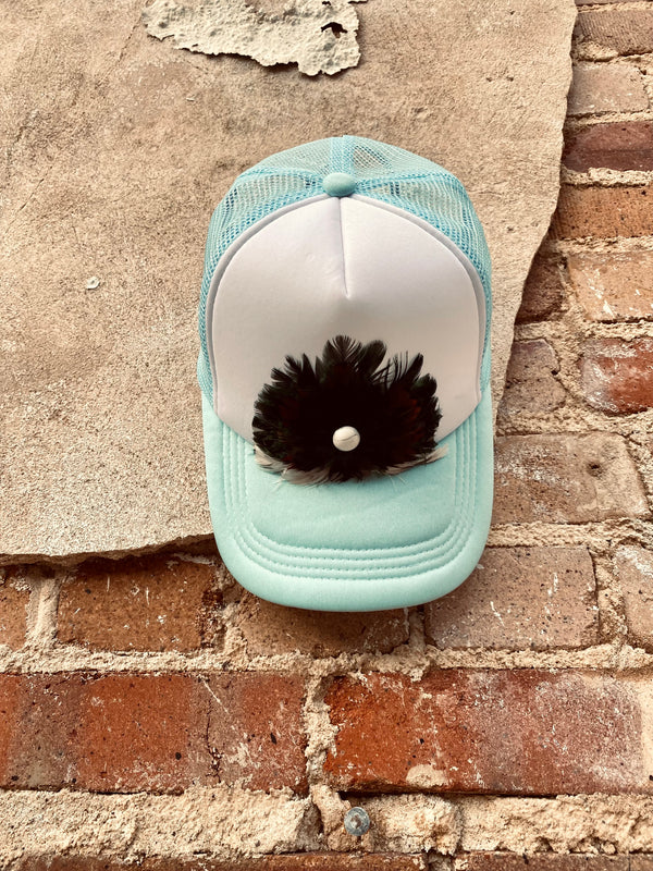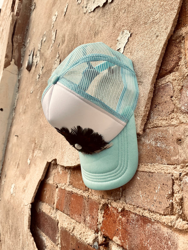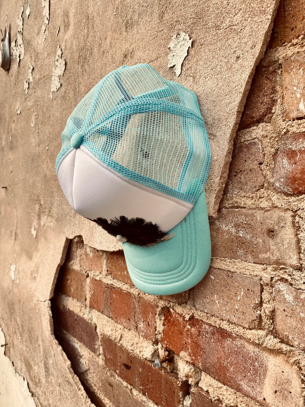 Feather Medallion & Stone Embellished Ice Blue/White Trucker Hat