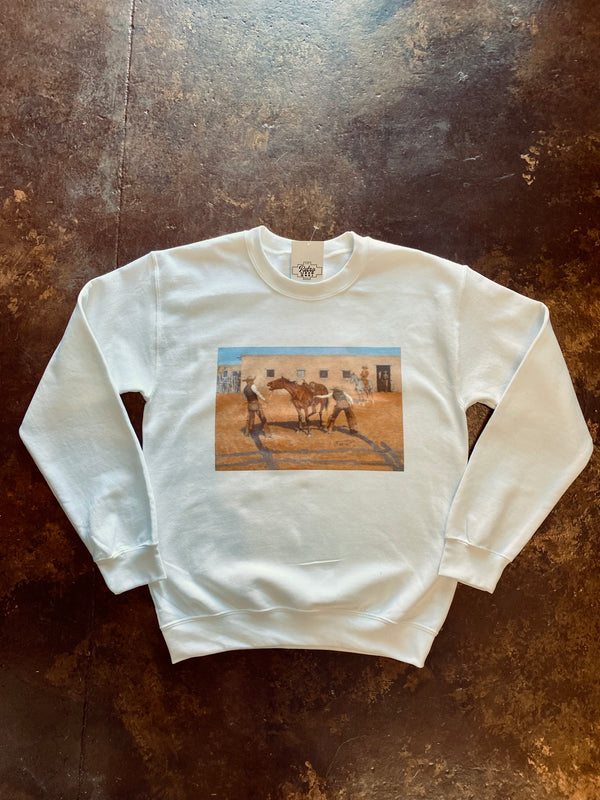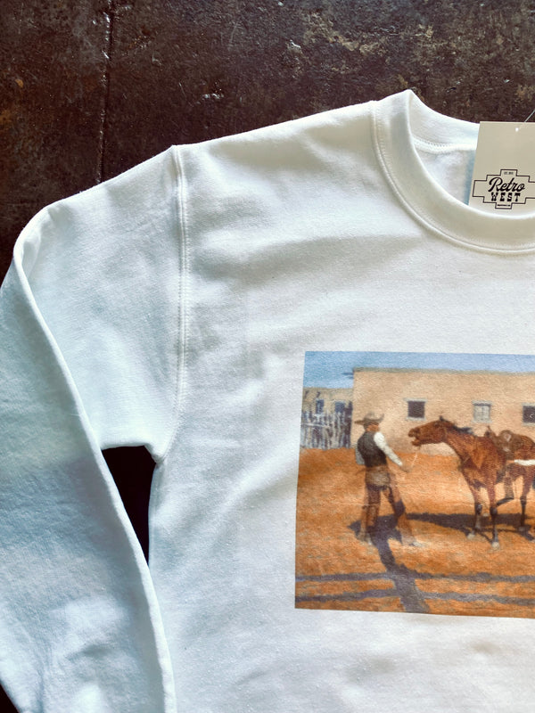 Licensed Graphic Cowboy & Horse Western Painting Scene Printed on White Sweatshirt  *FULLY LICENSED GRAPHIC* Heavy blend Gildan  50% Cotton 50% Polyester