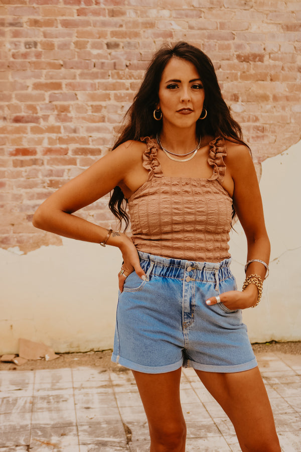 Mocha Tan Bubble Tube Tank Top with Ruffle Straps Super stretchy Lightweight ***Model is wearing a Medium***