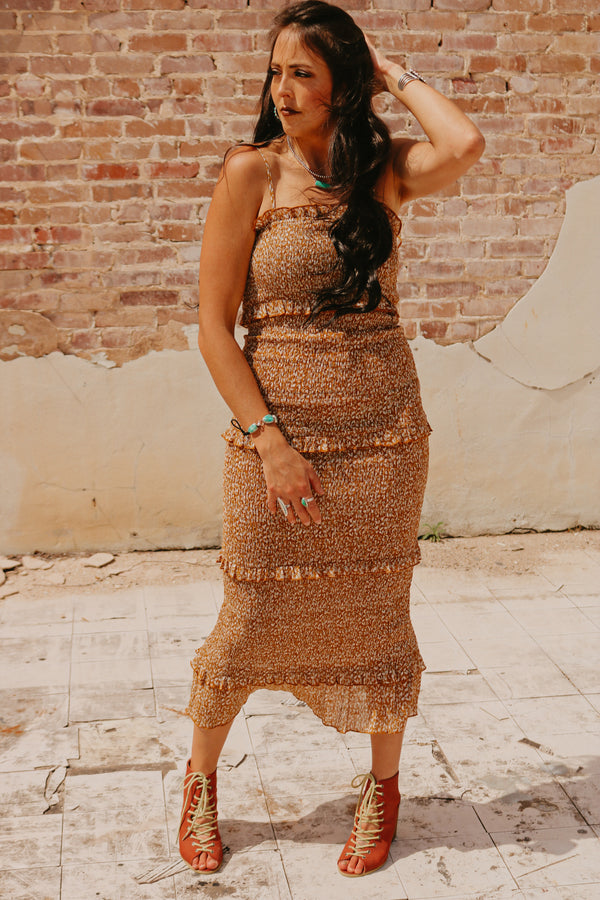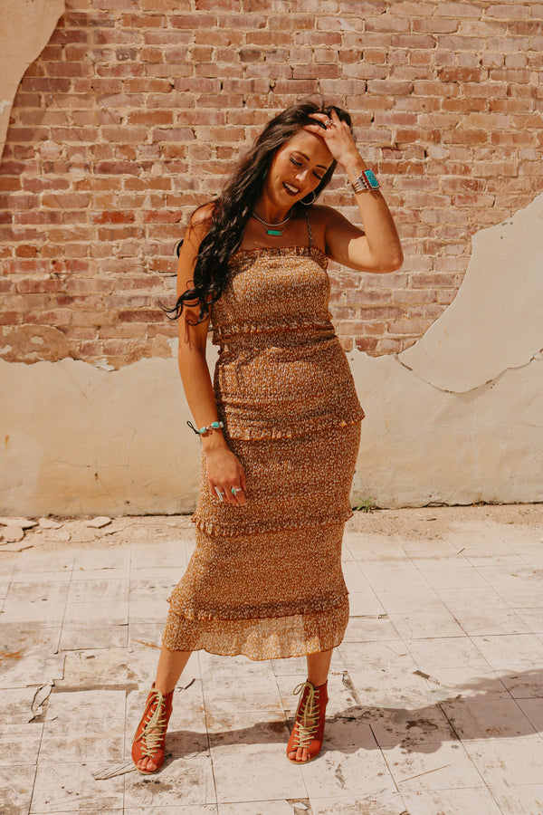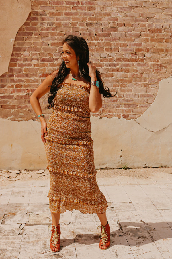 Caramel Smocked Ruffle Mid Length Fitted Dress Adjustable straps 100% Polyester