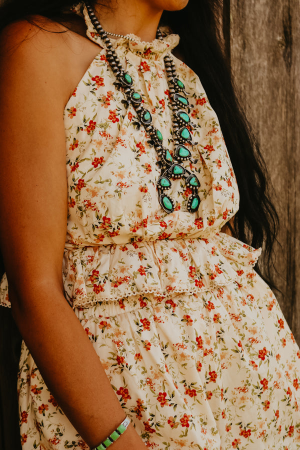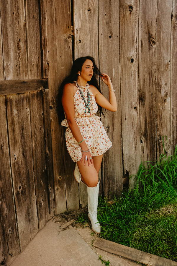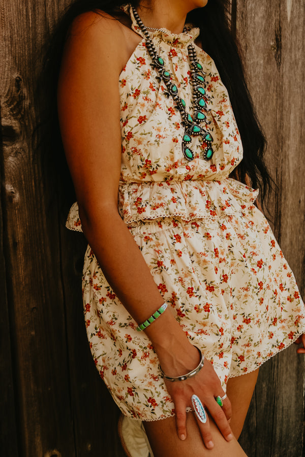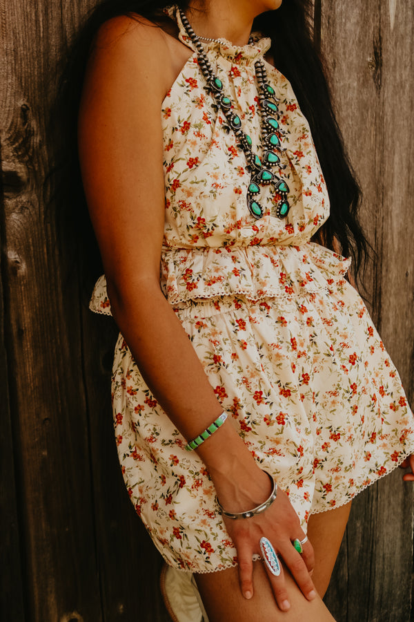 Cream Halter Top and Short Floral Set Ruffle trim Pockets Elastic waistband