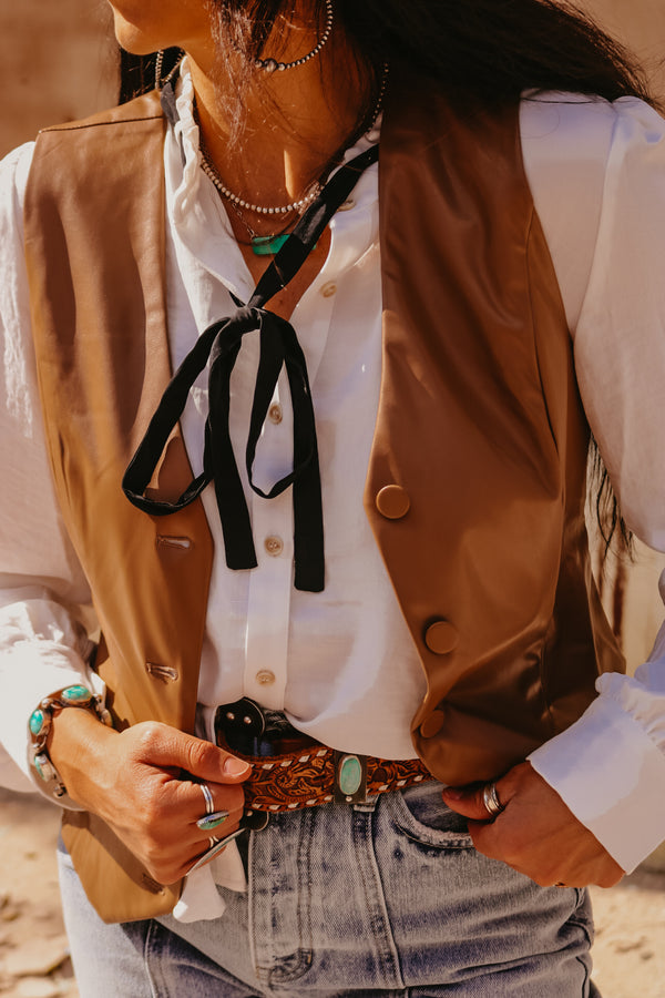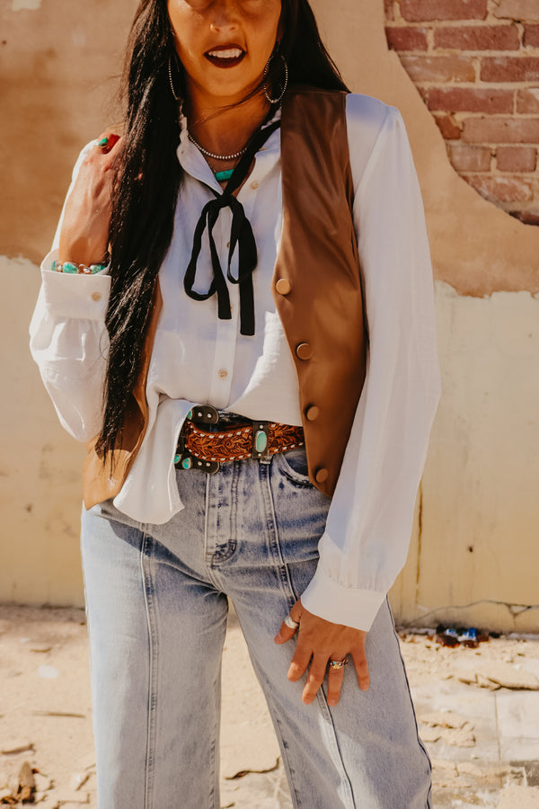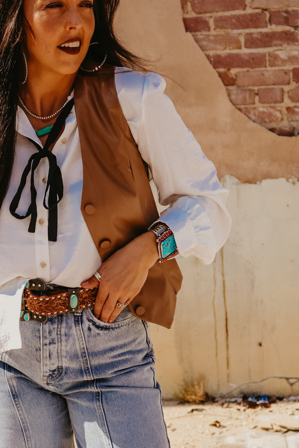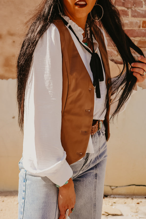 Brown Faux Leather Fitted Button Down Vest