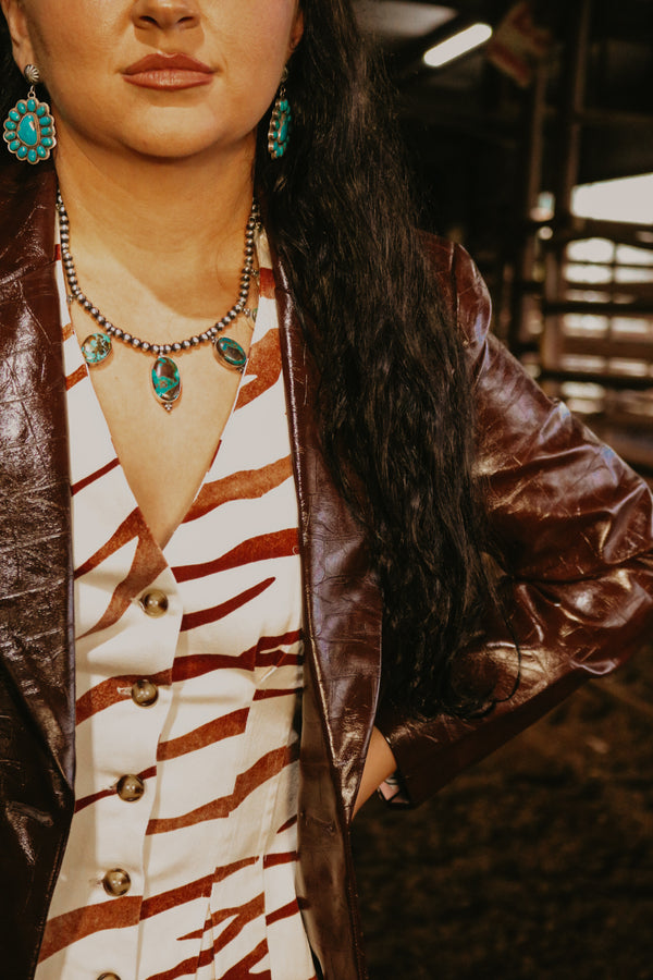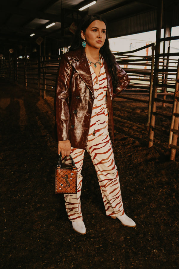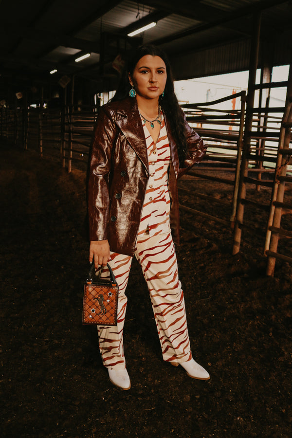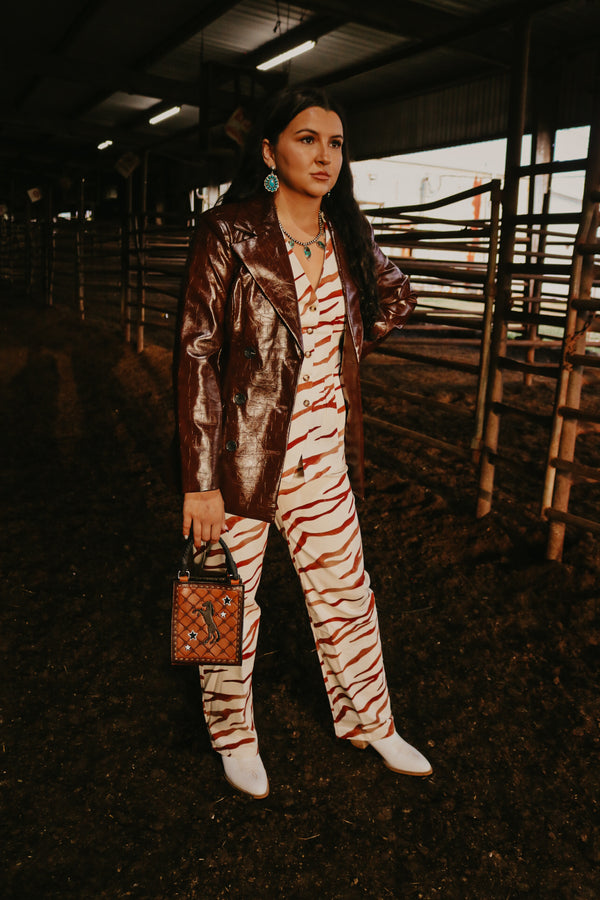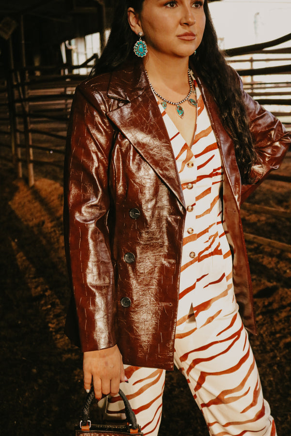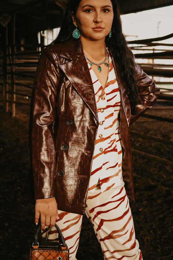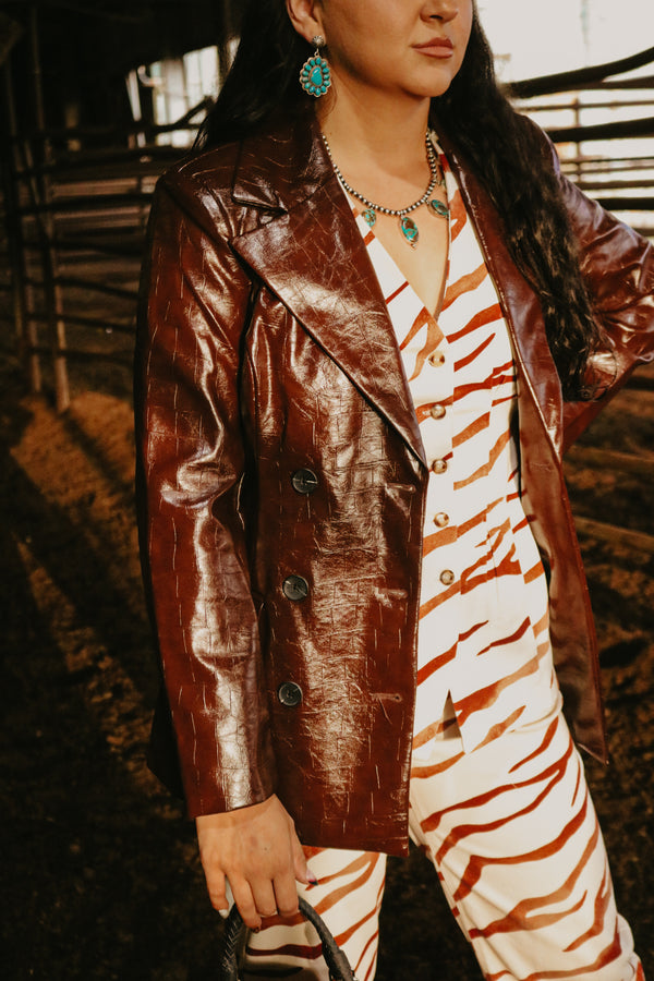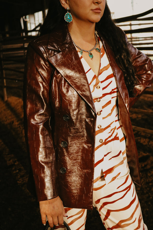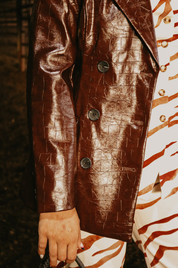 Chocolate Faux Crocodile Leather Blazer Double Buttons Has Pockets 100% Polyurethane