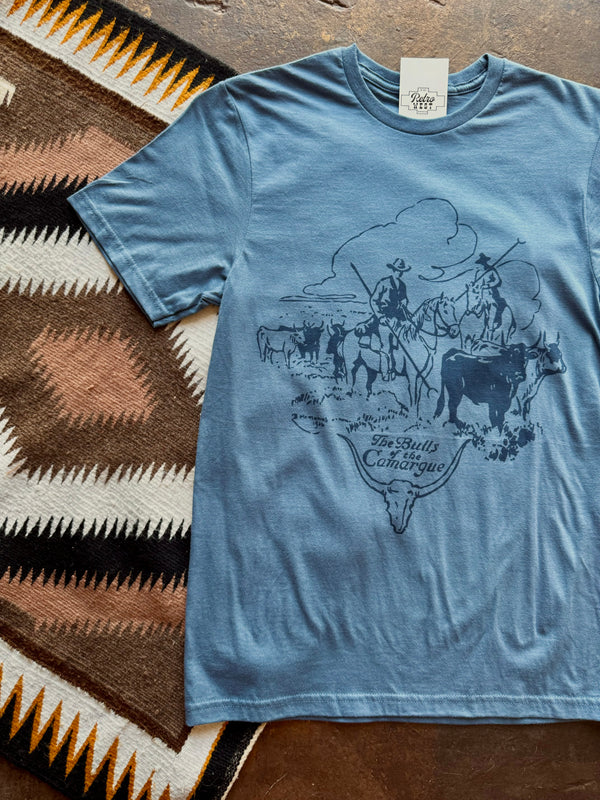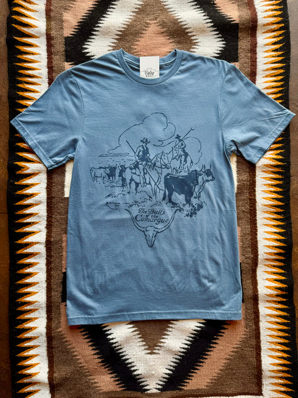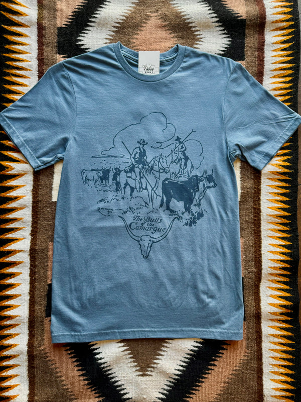 ‘The Bulls of Camargue” Western Scene Blue Graphic Tee 100% Cotton