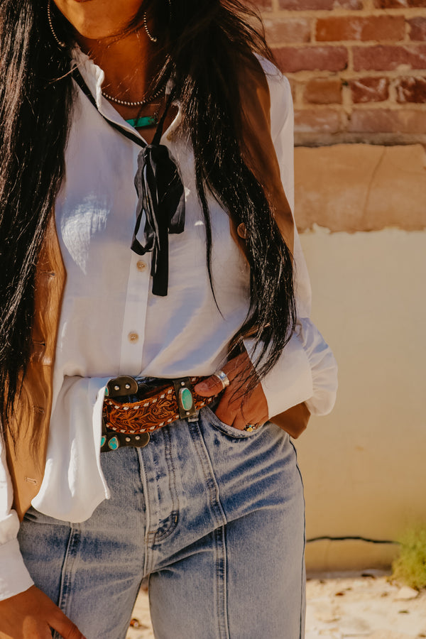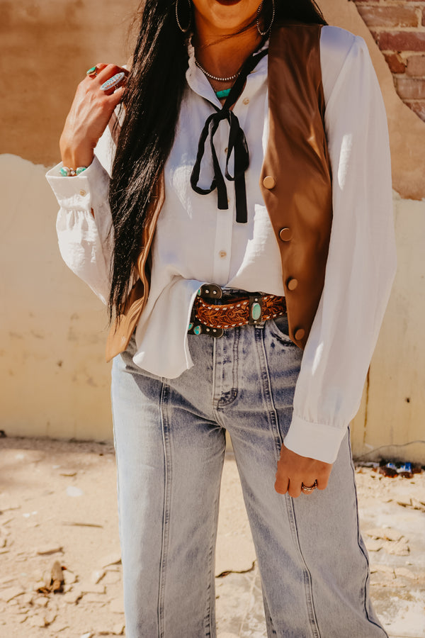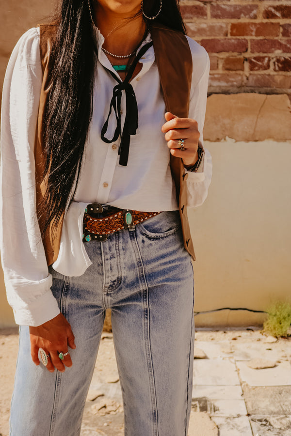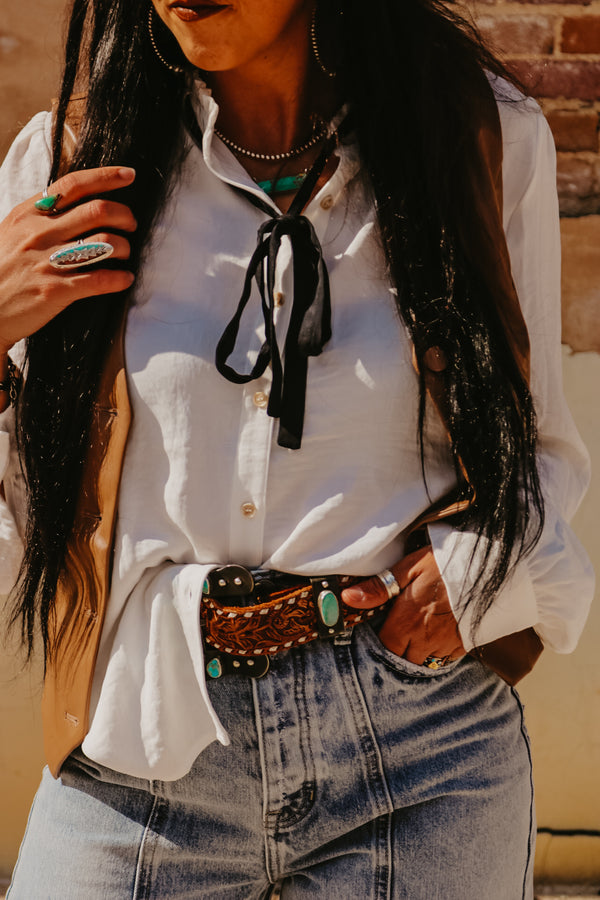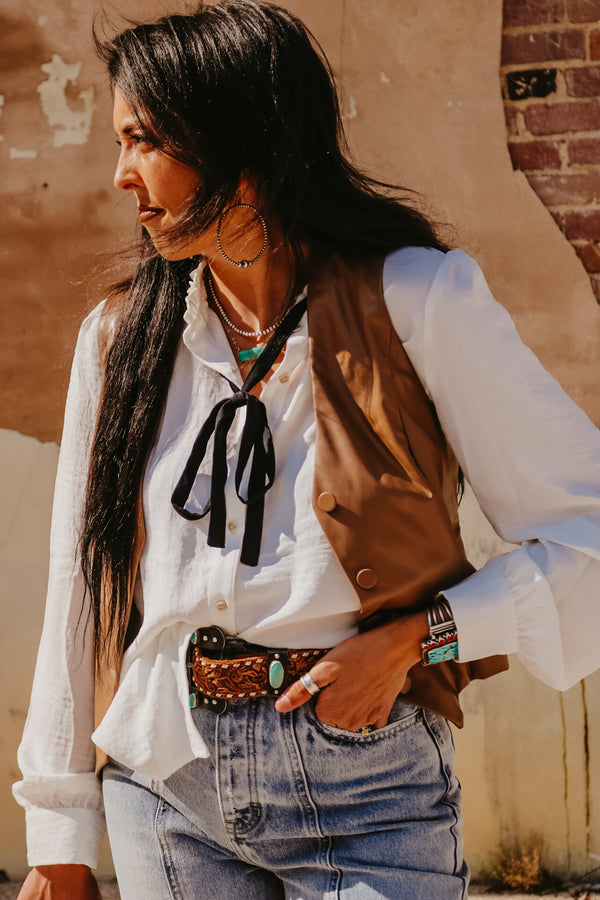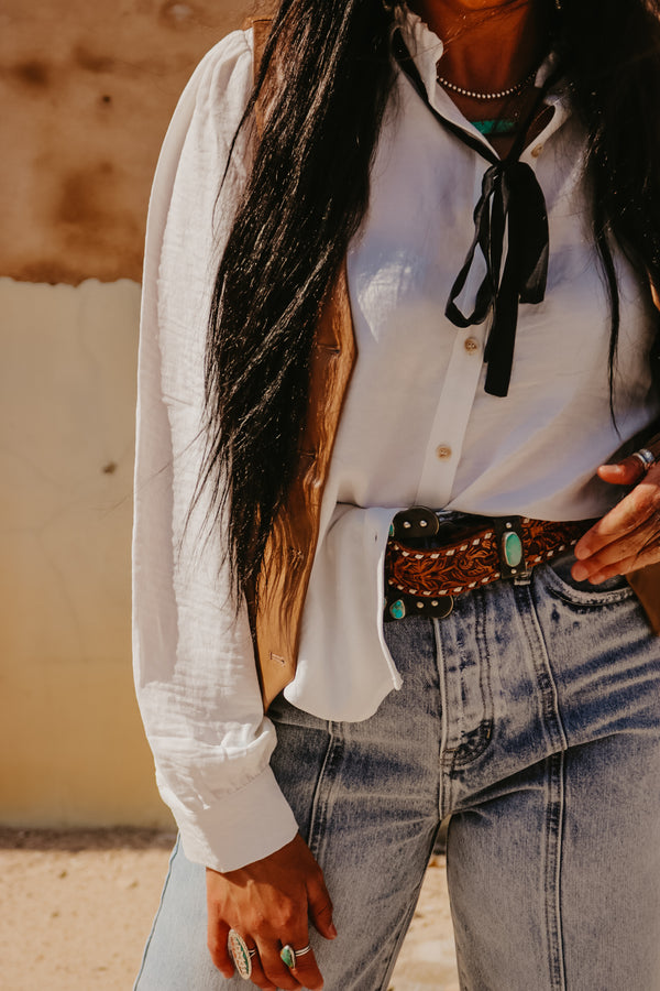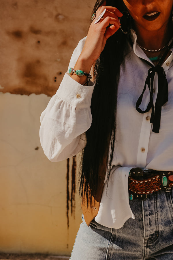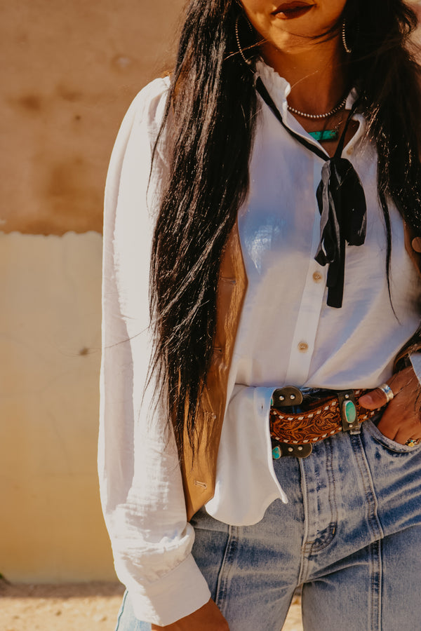Off White Vintage Style Neck Ribbon Tie Button Up Blouse Ruffle collar & shoulders 100% Polyester