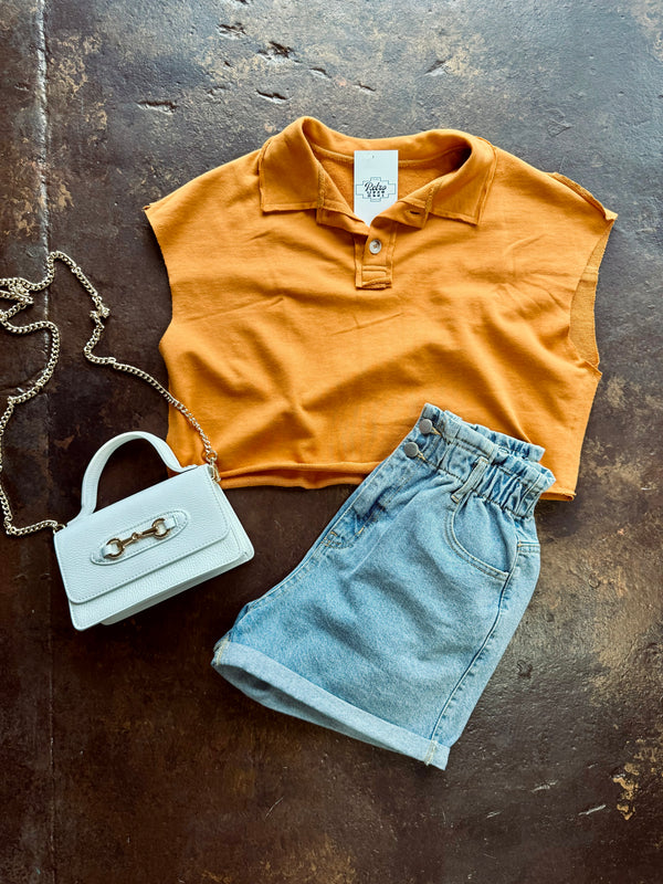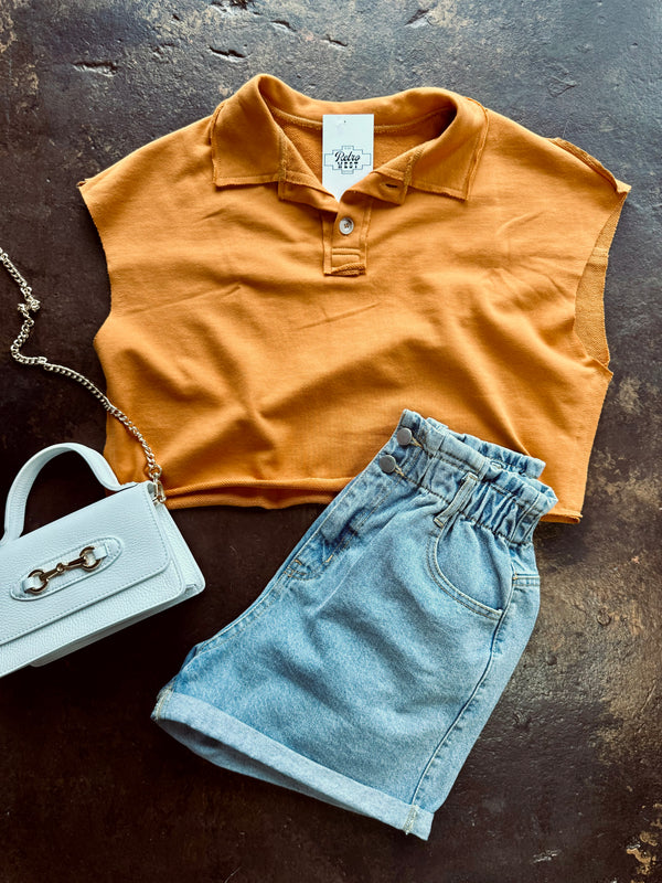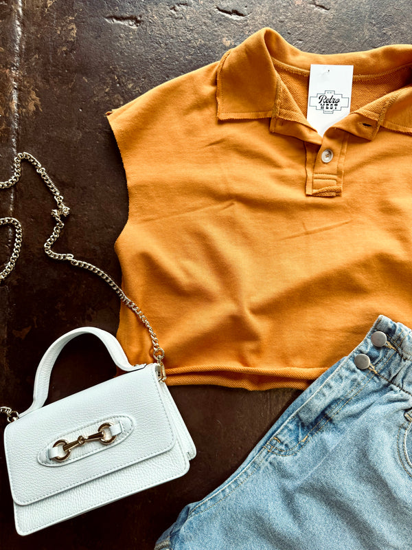 Mustard Raw Edge Trim Polo Collar Cropped Tee
