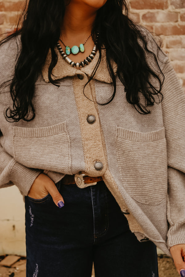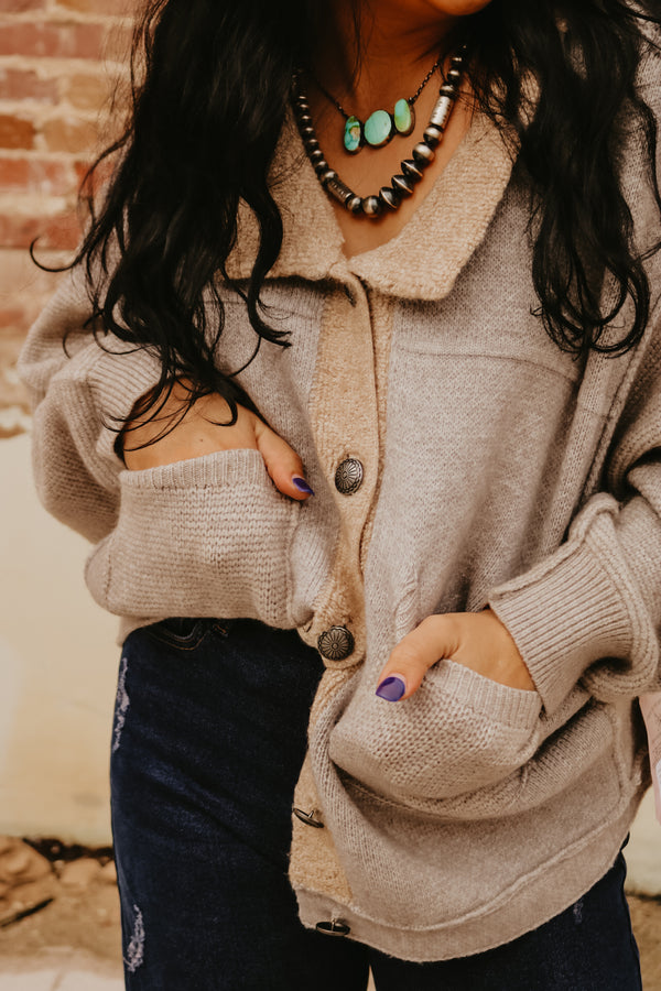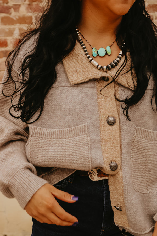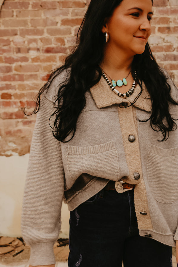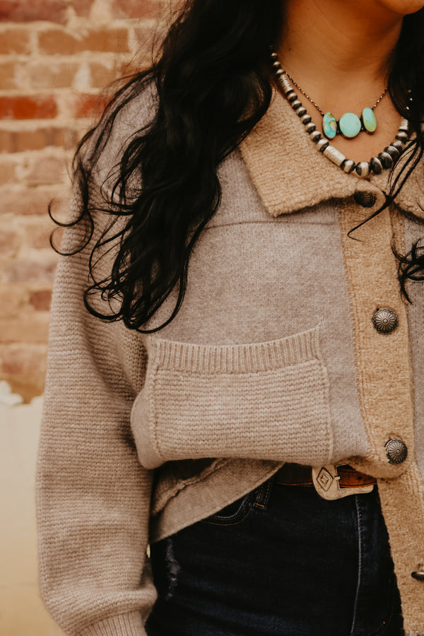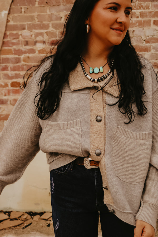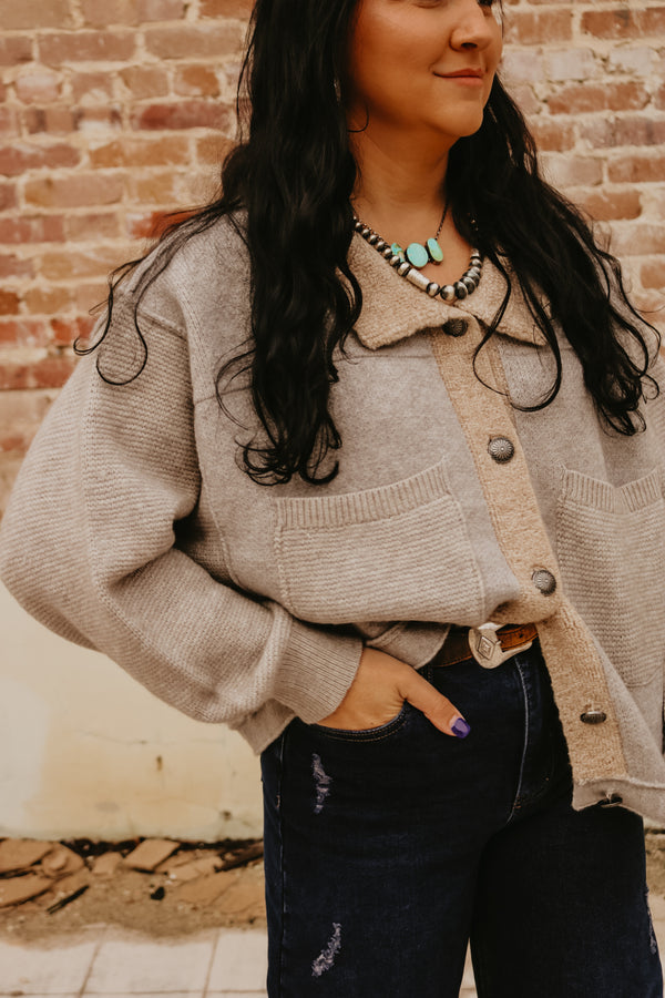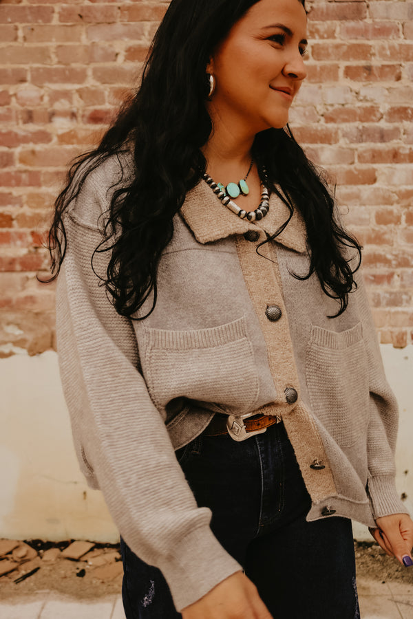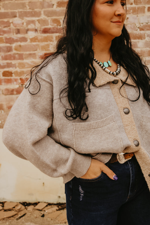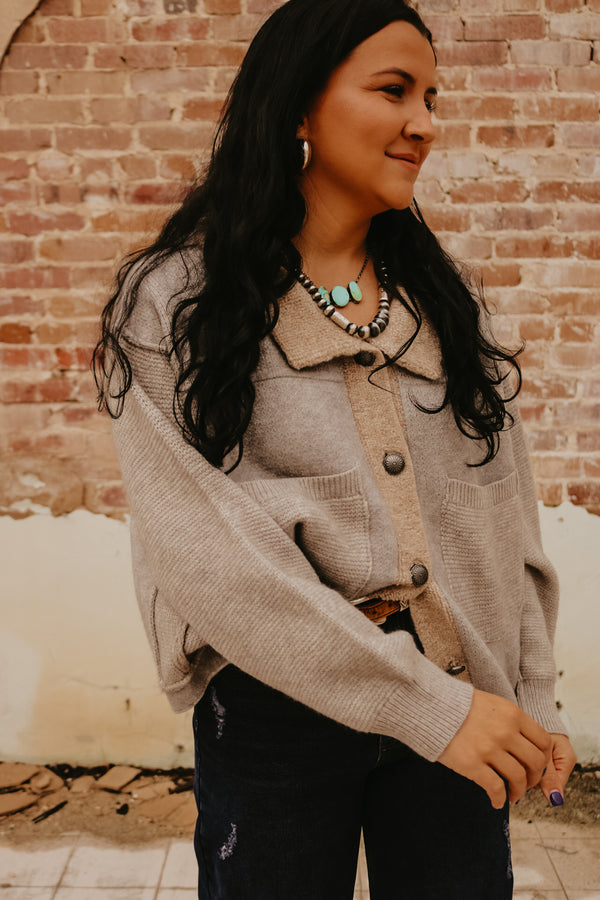 Grey/ Tan Western Cut Collared Knit Cardi with Concho Button Detail Box style fit Front pockets 52% Acrylic 28% Cotton 20% PBT