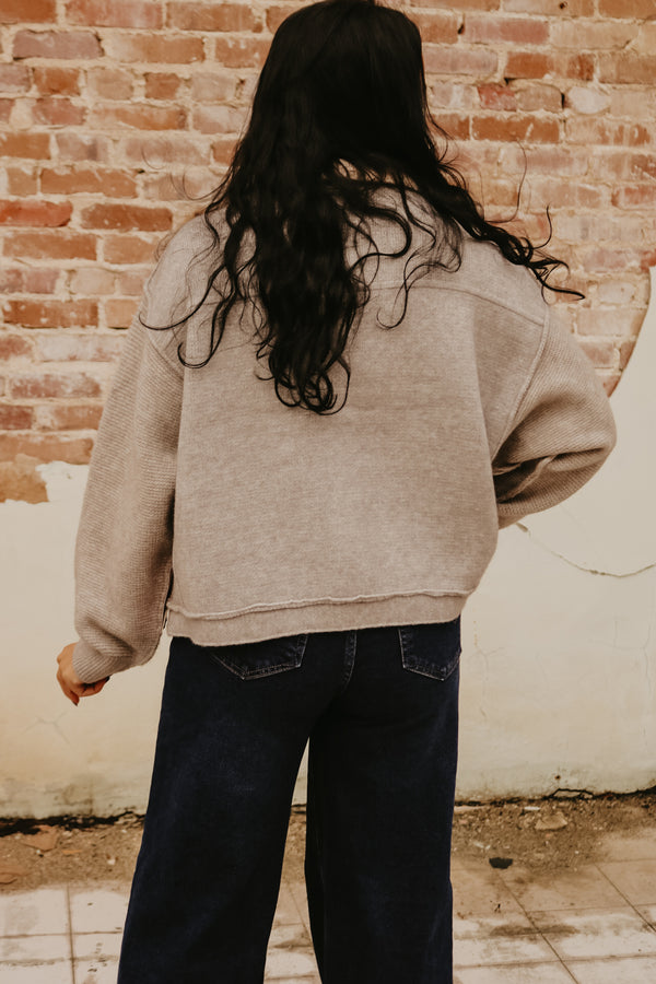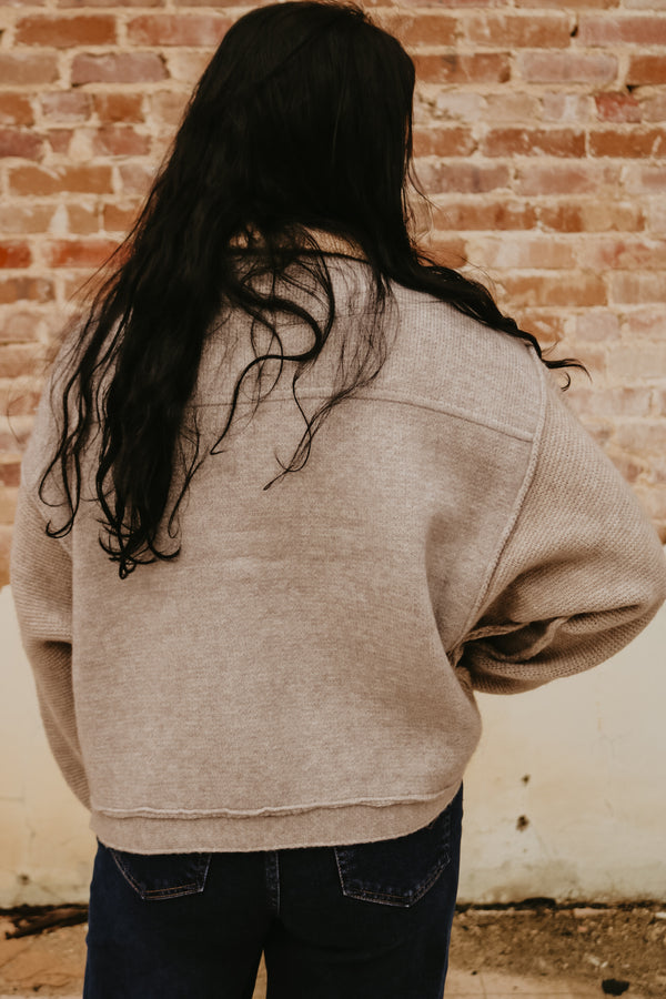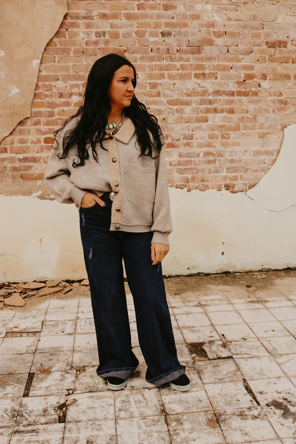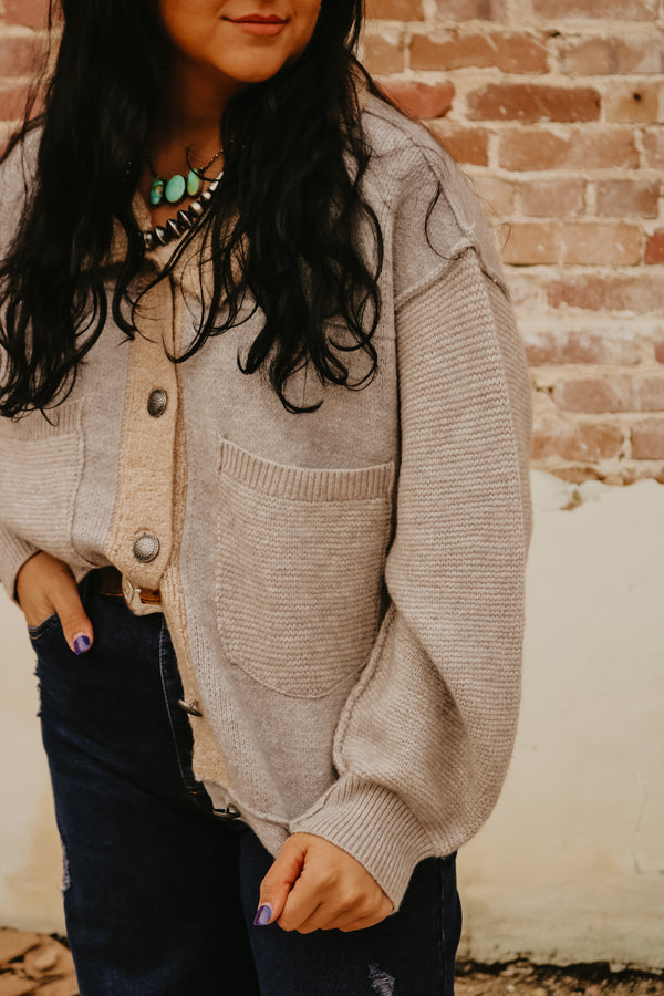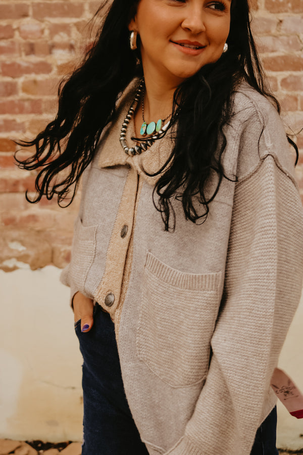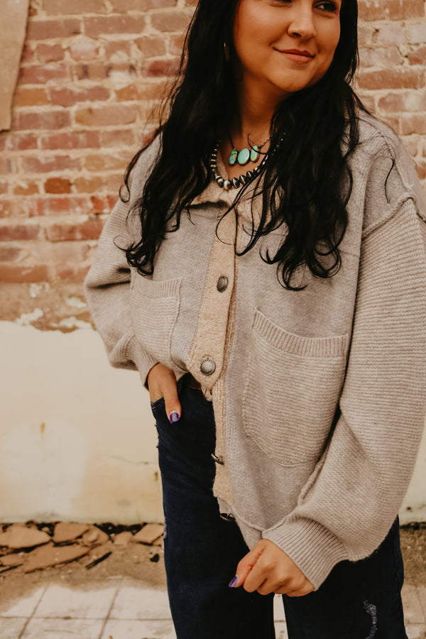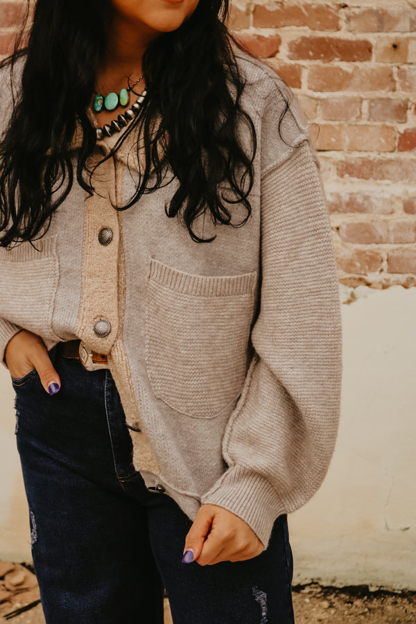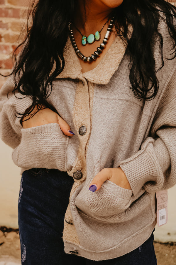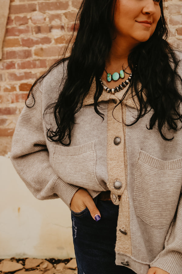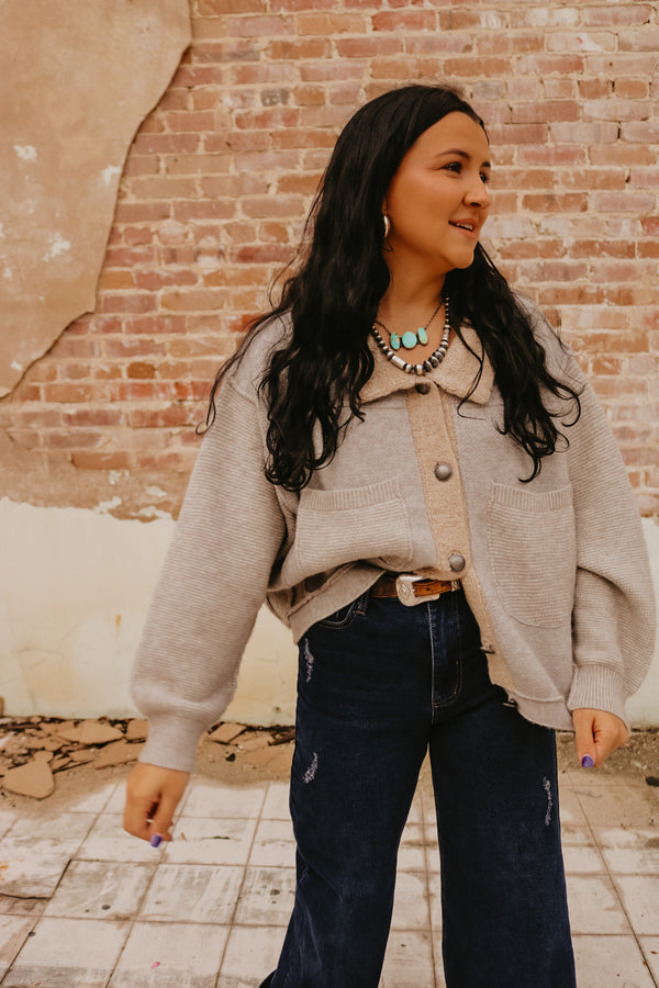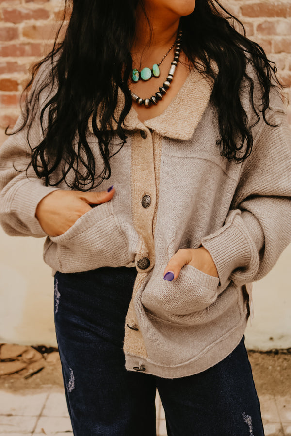 Grey/ Tan Western Cut Collared Knit Cardi with Concho Button Detail Box style fit Front pockets 52% Acrylic 28% Cotton 20% PBT