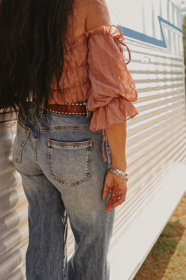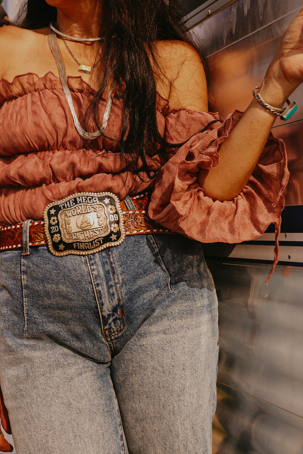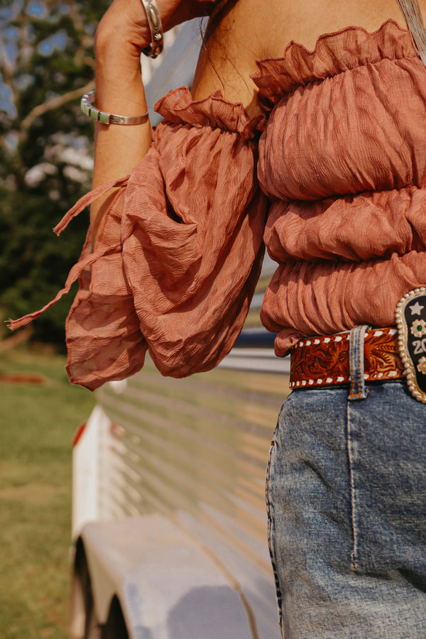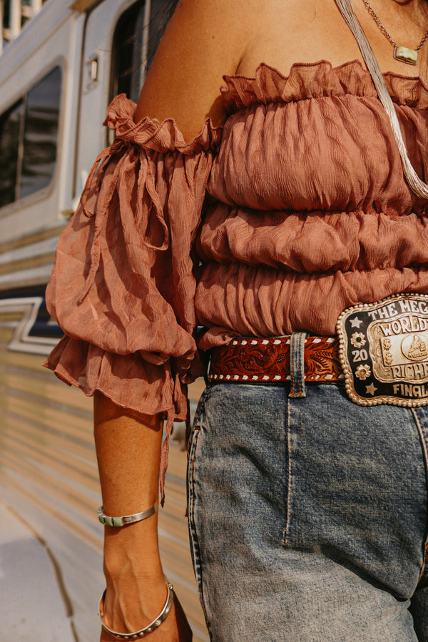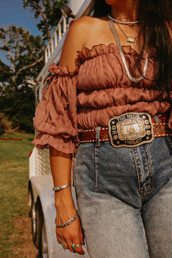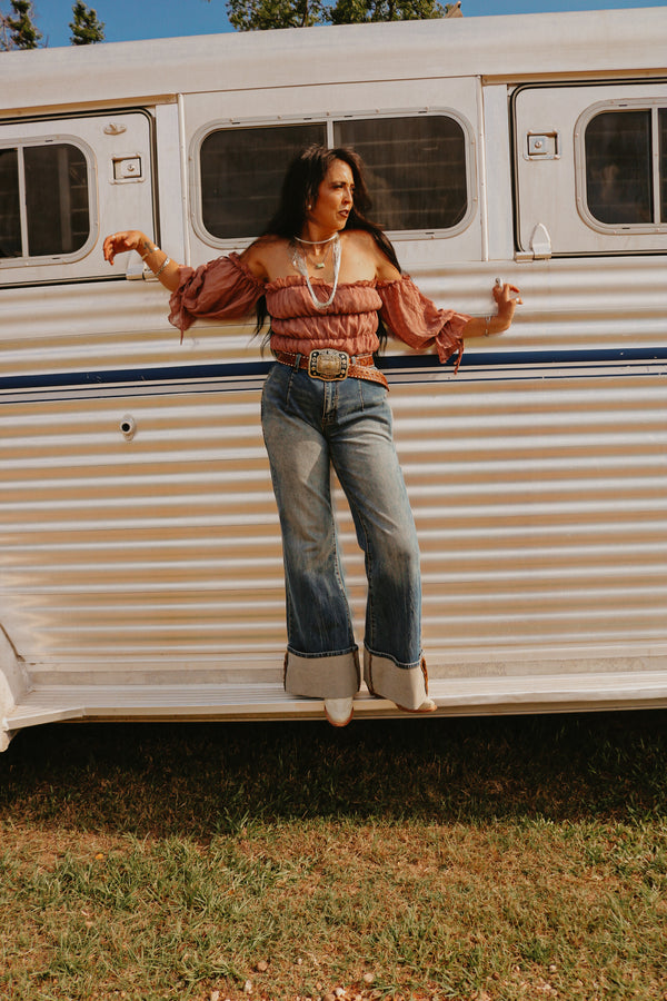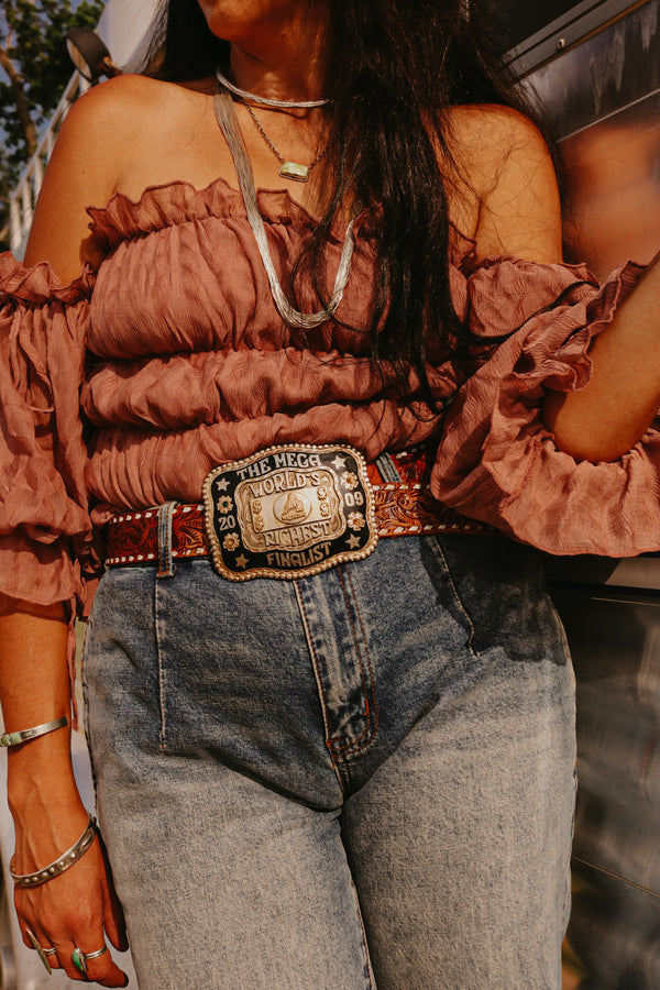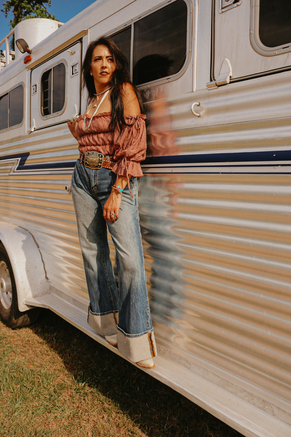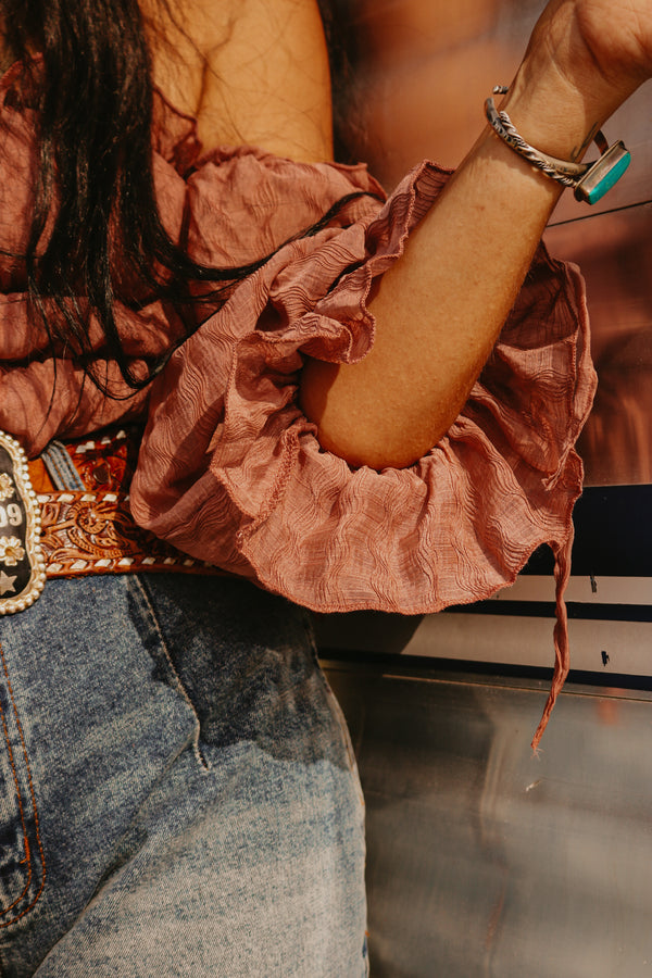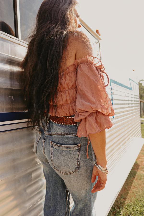 Mauve Off-the-Shoulder 3/4 Ribbon Tied Sleeve Smocked Bodysuit Lightweight fabric Lined Double snap closure