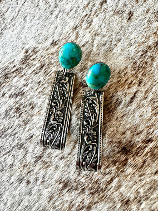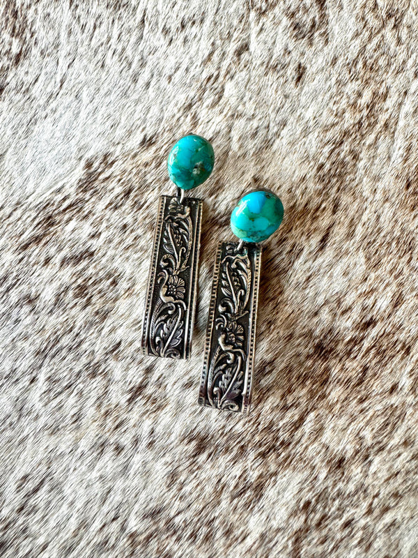 Turquoise Stud with Tooled Teardrop Accent Dangle  Approximately 2”
