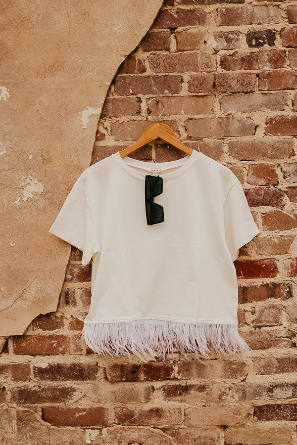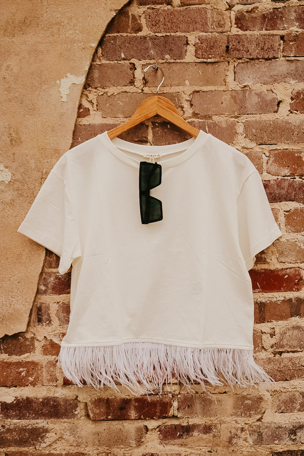 White Short Sleeve Box Top with Feather Hem Detail Boxy oversize fit Soft stretch material & feel  Thicker weight fabric 80% Polyester 20% Rayon