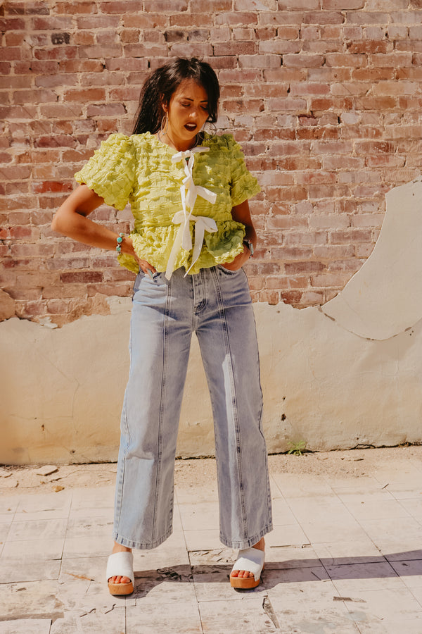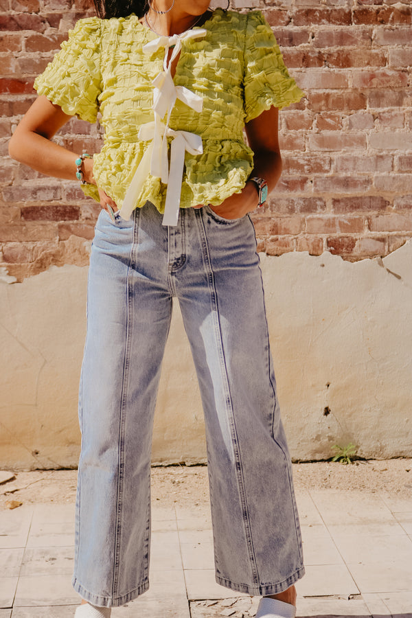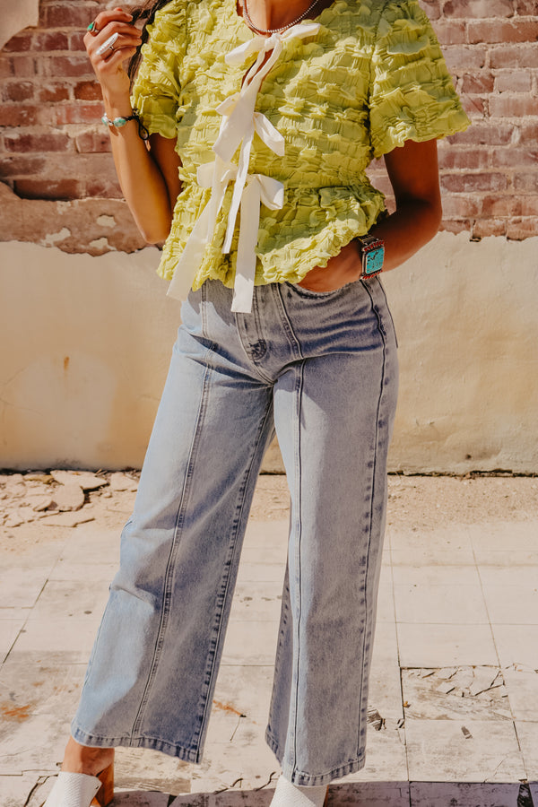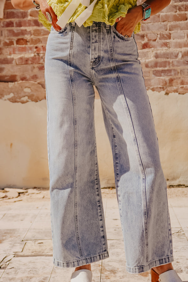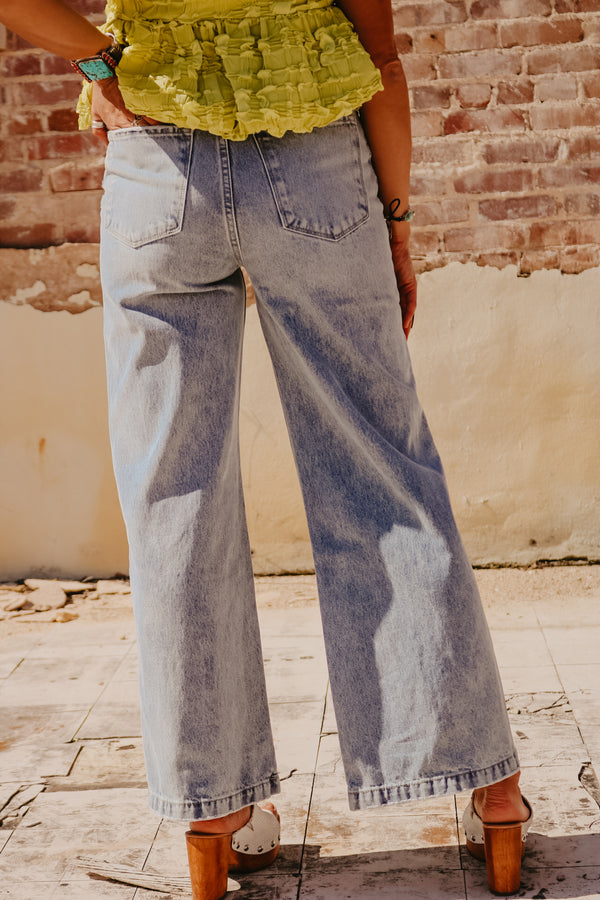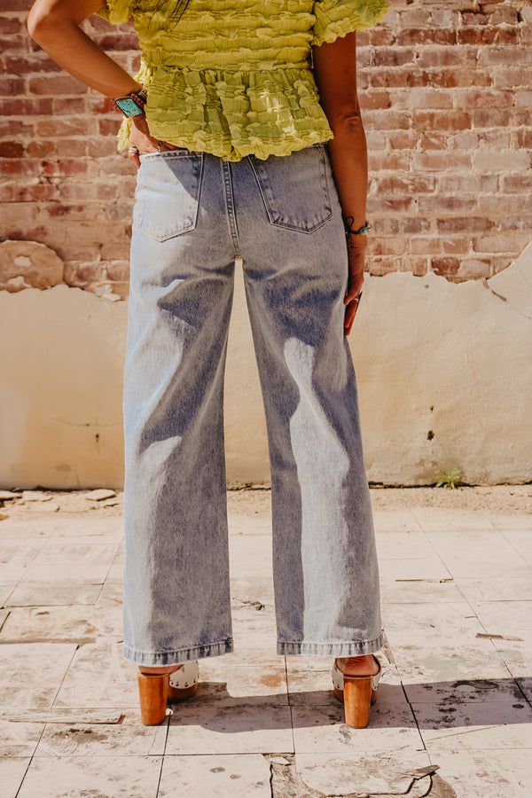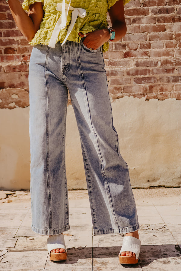 Light Stone Wash Wide Leg Cropped Flare Jean High rise Top stitched center seam detailing  100% Cotton