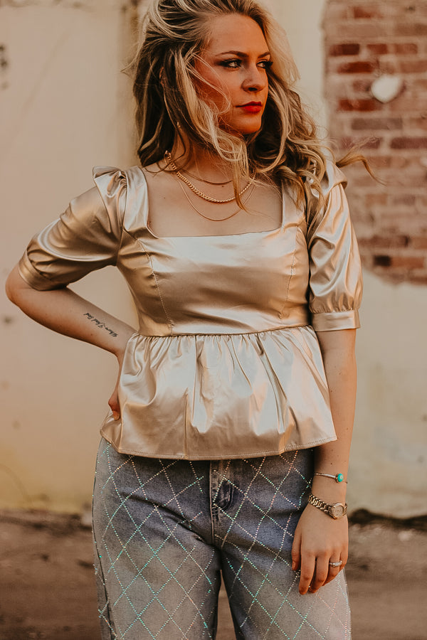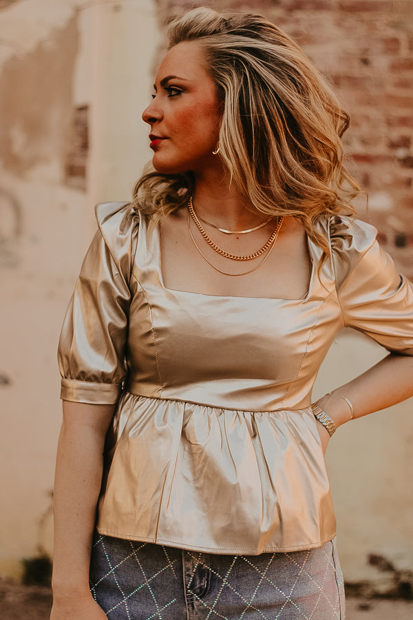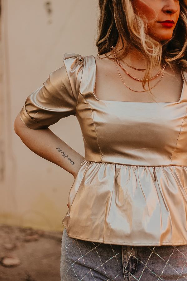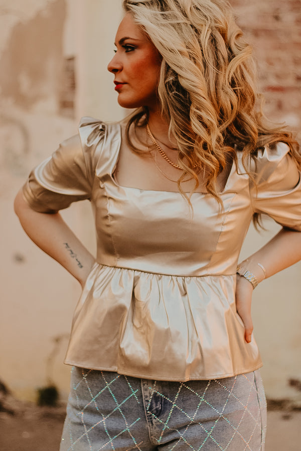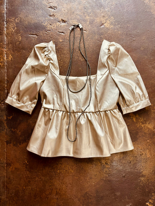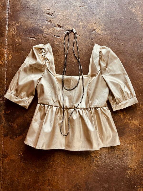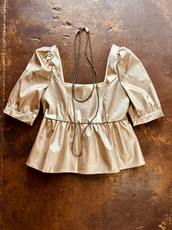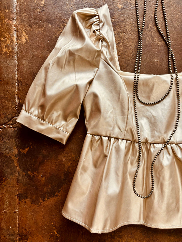 Gold Faux Leather Square Neckline Top Half puff sleeves and ruffled hem Hidden zipper on back