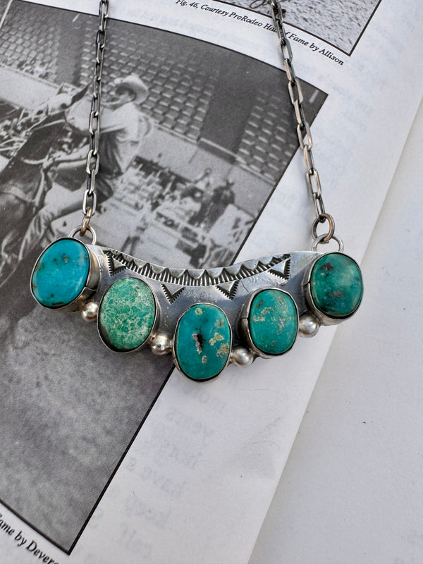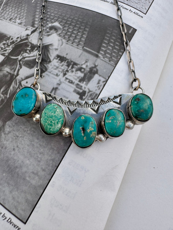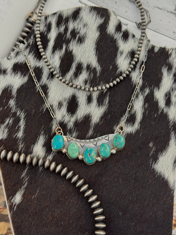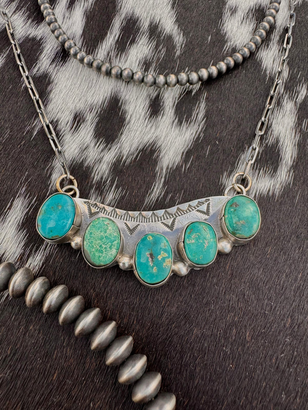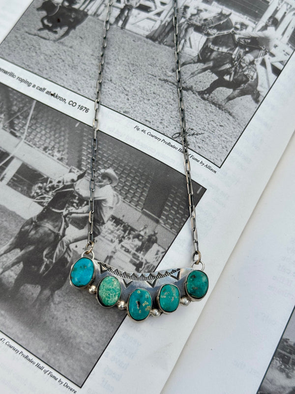 Large 5 Multi-Turquoise Stone Southwest Stamped Bar Necklace 2.25” Bar  22” in total length  Stamped sterling silver  Signed “BJA”