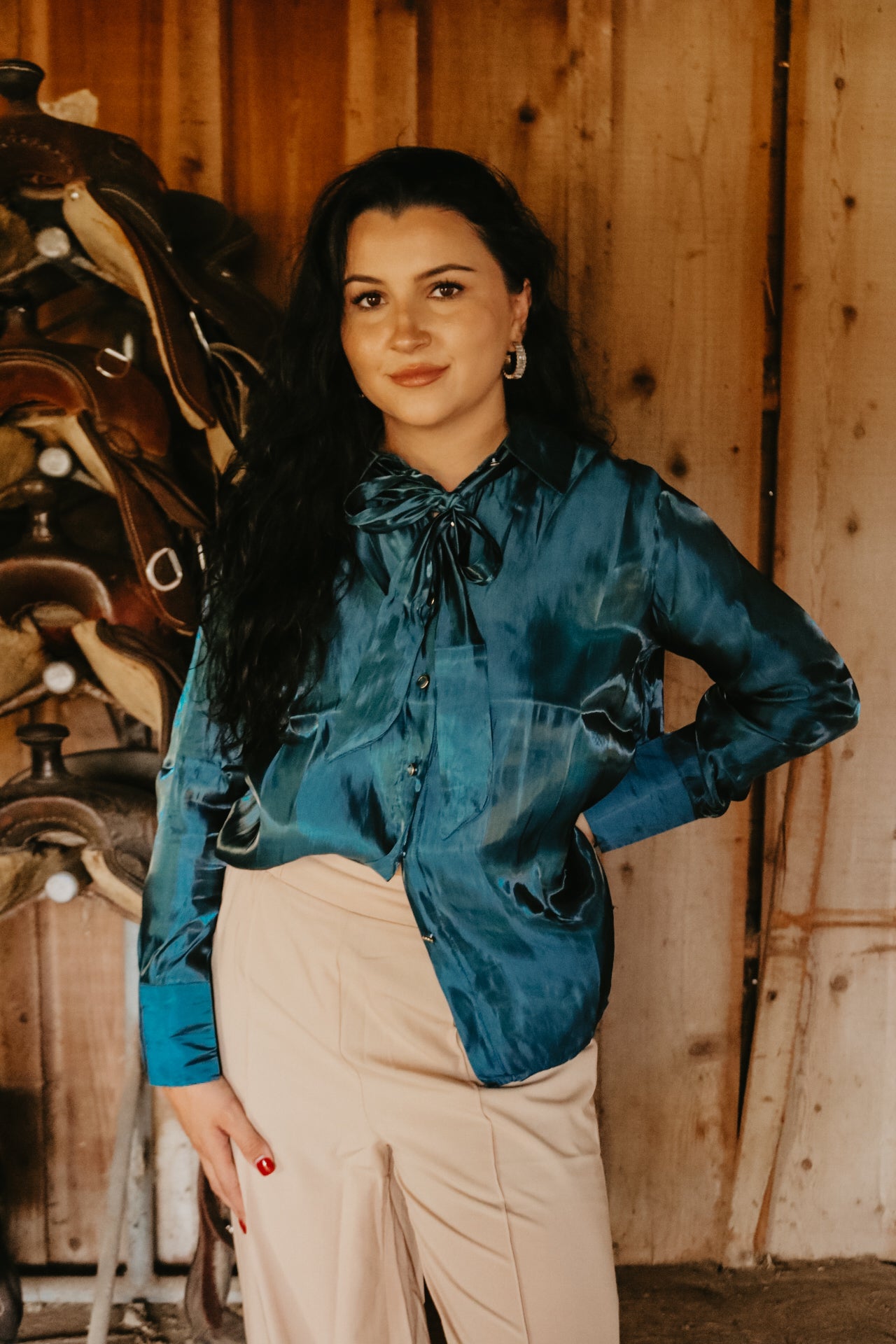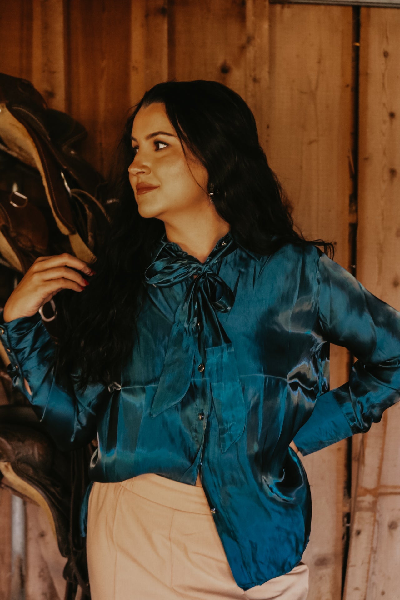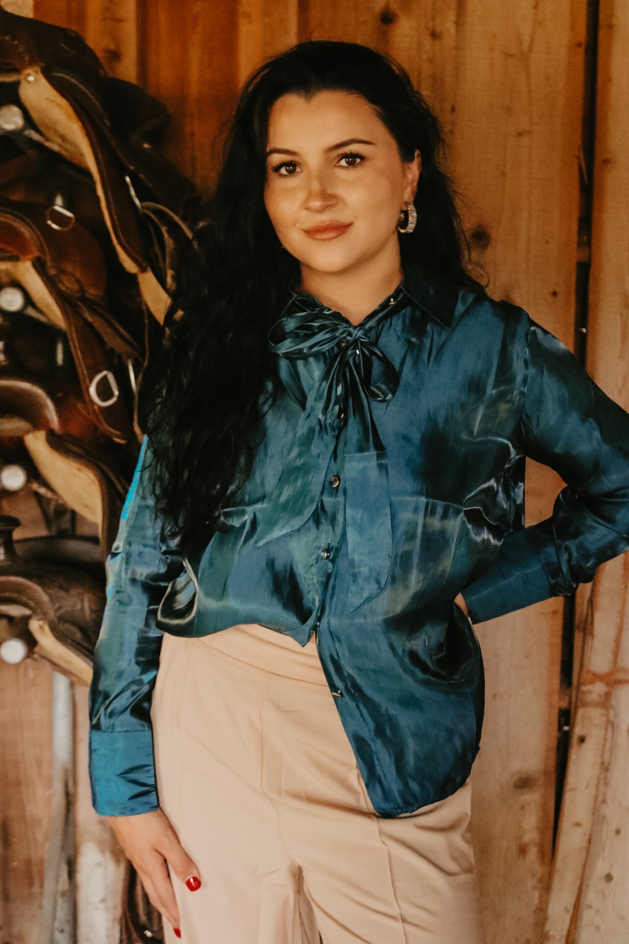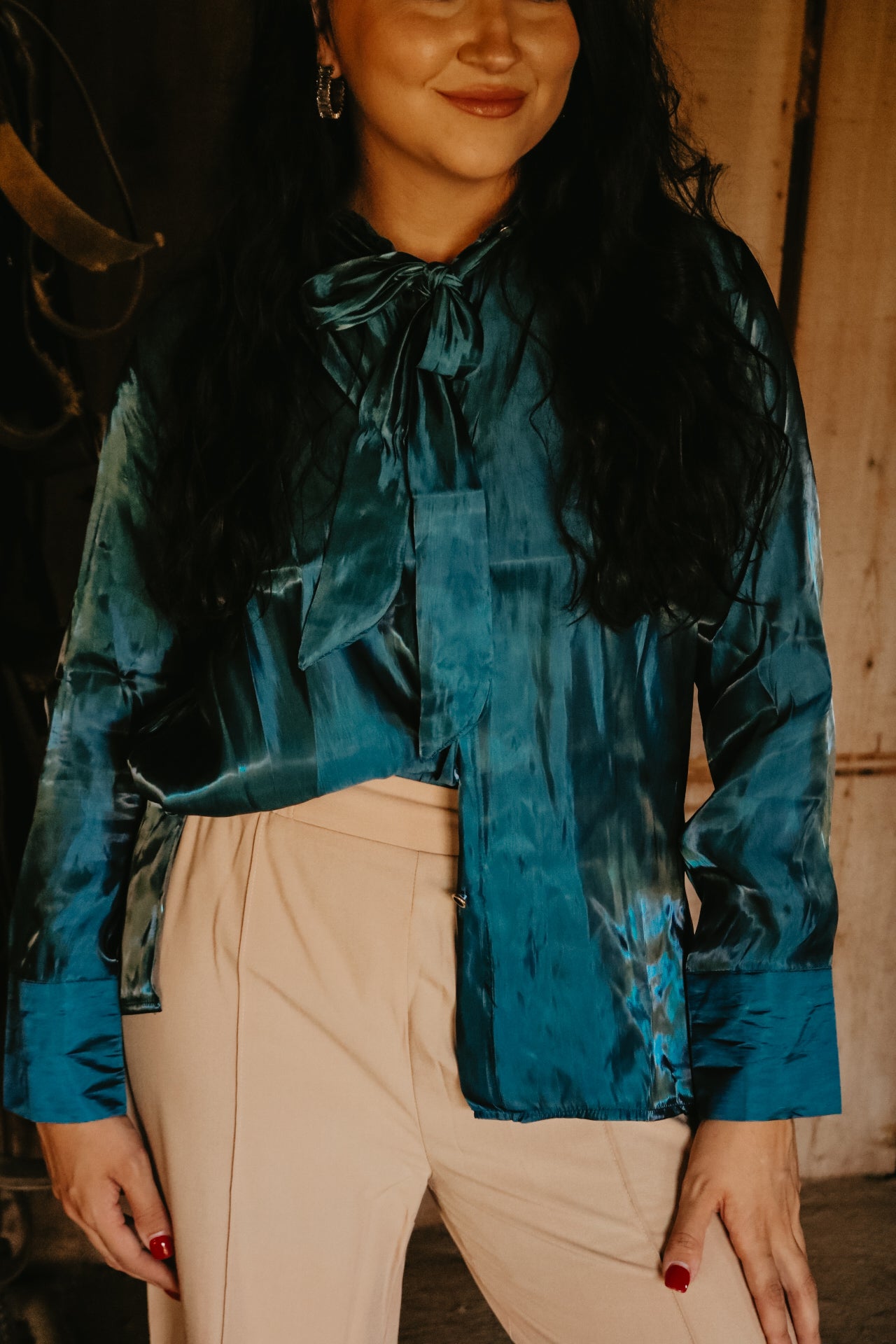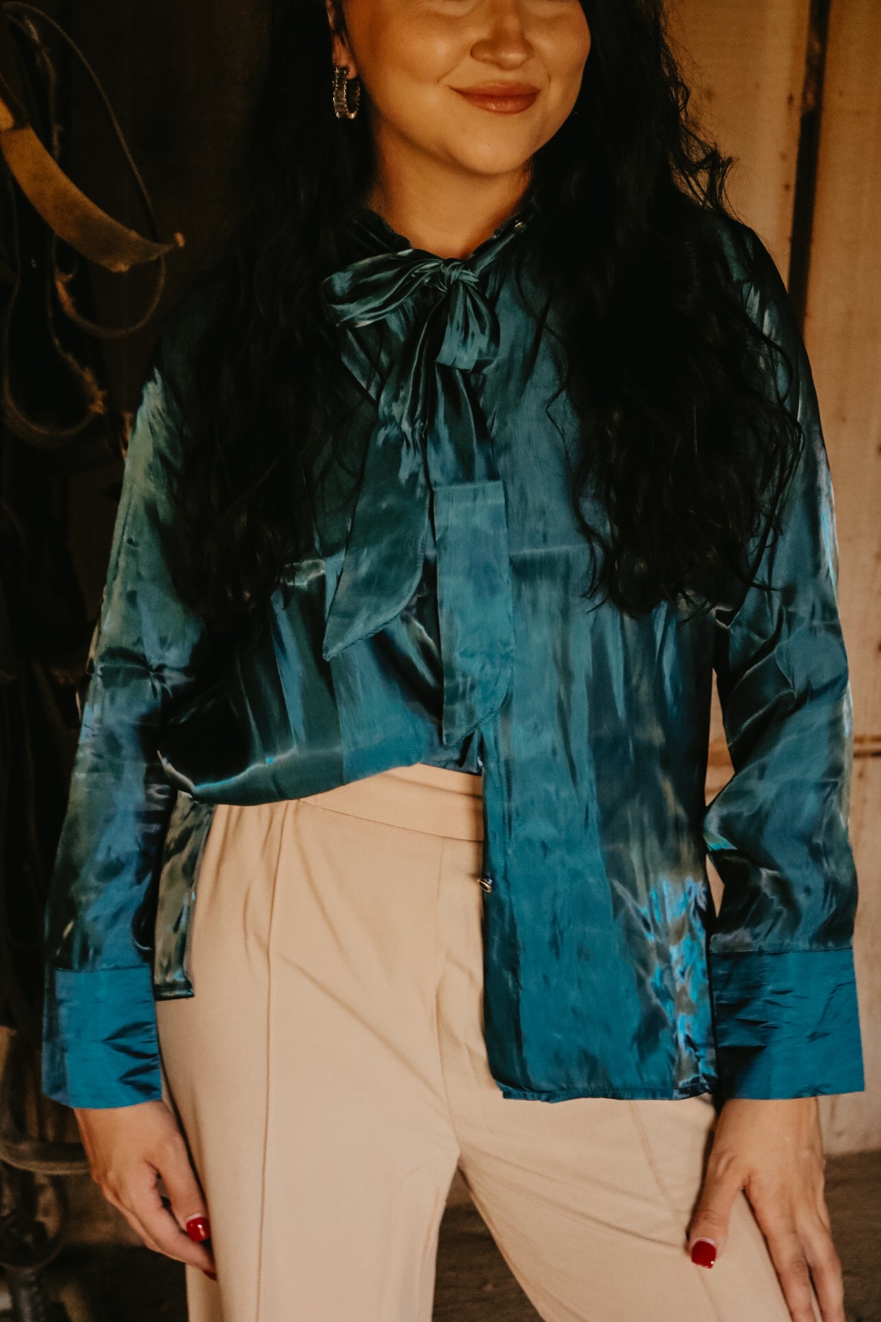 Deep Teal Long Sleeve Button Down Ribbon Neck Tie Top