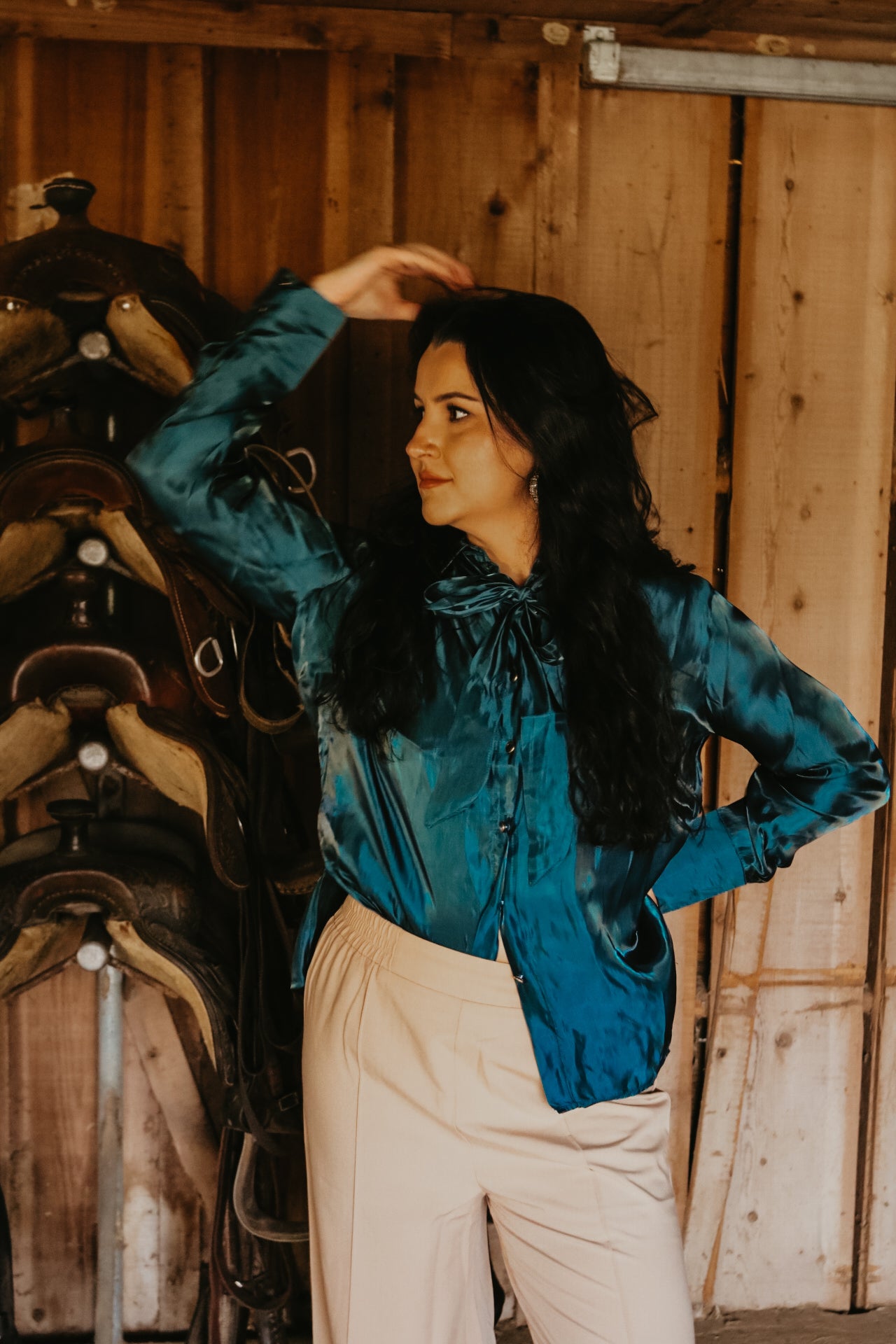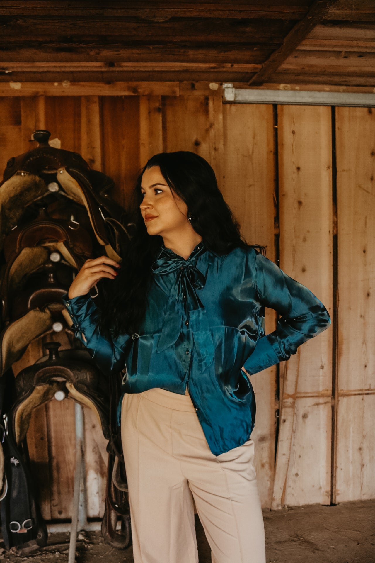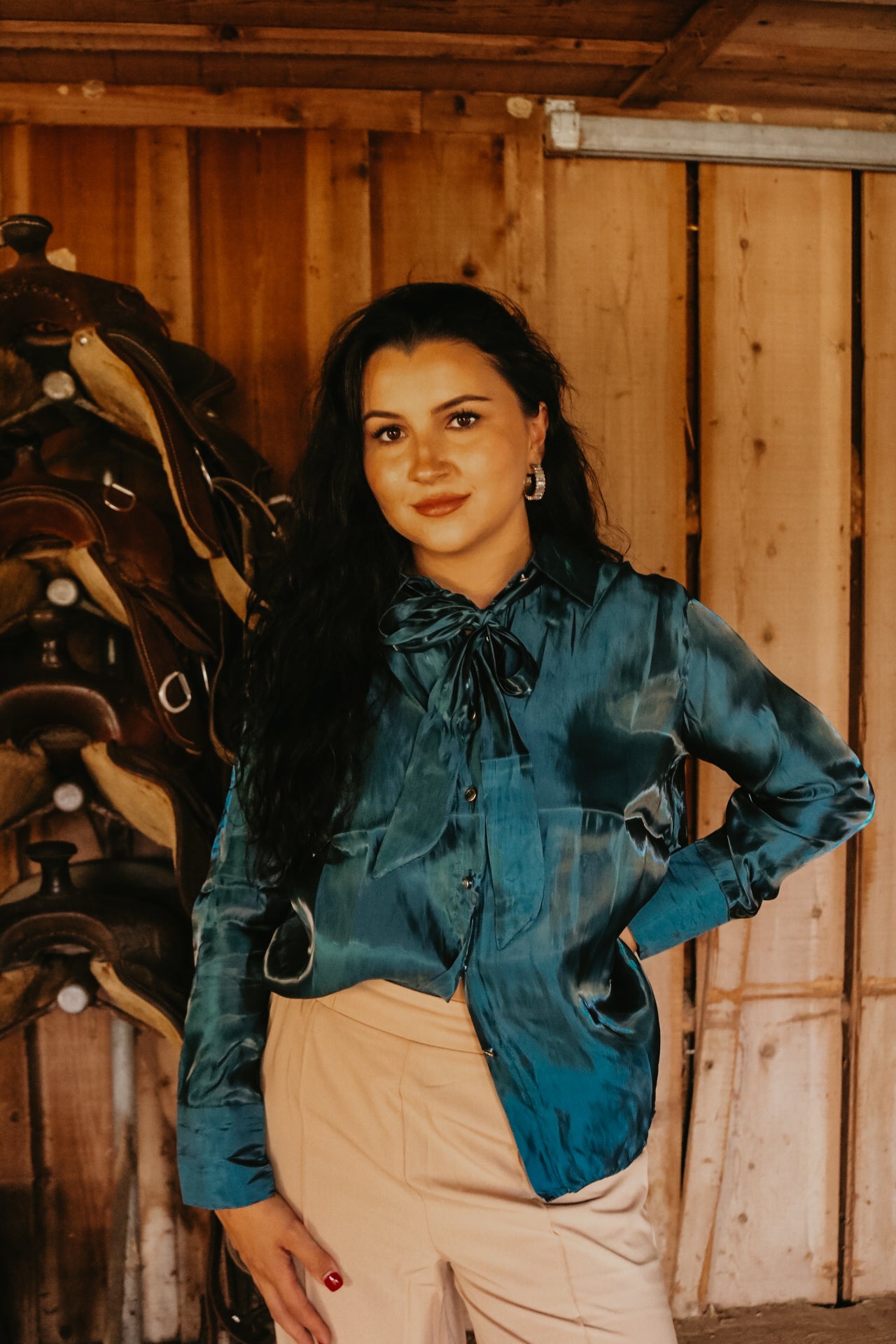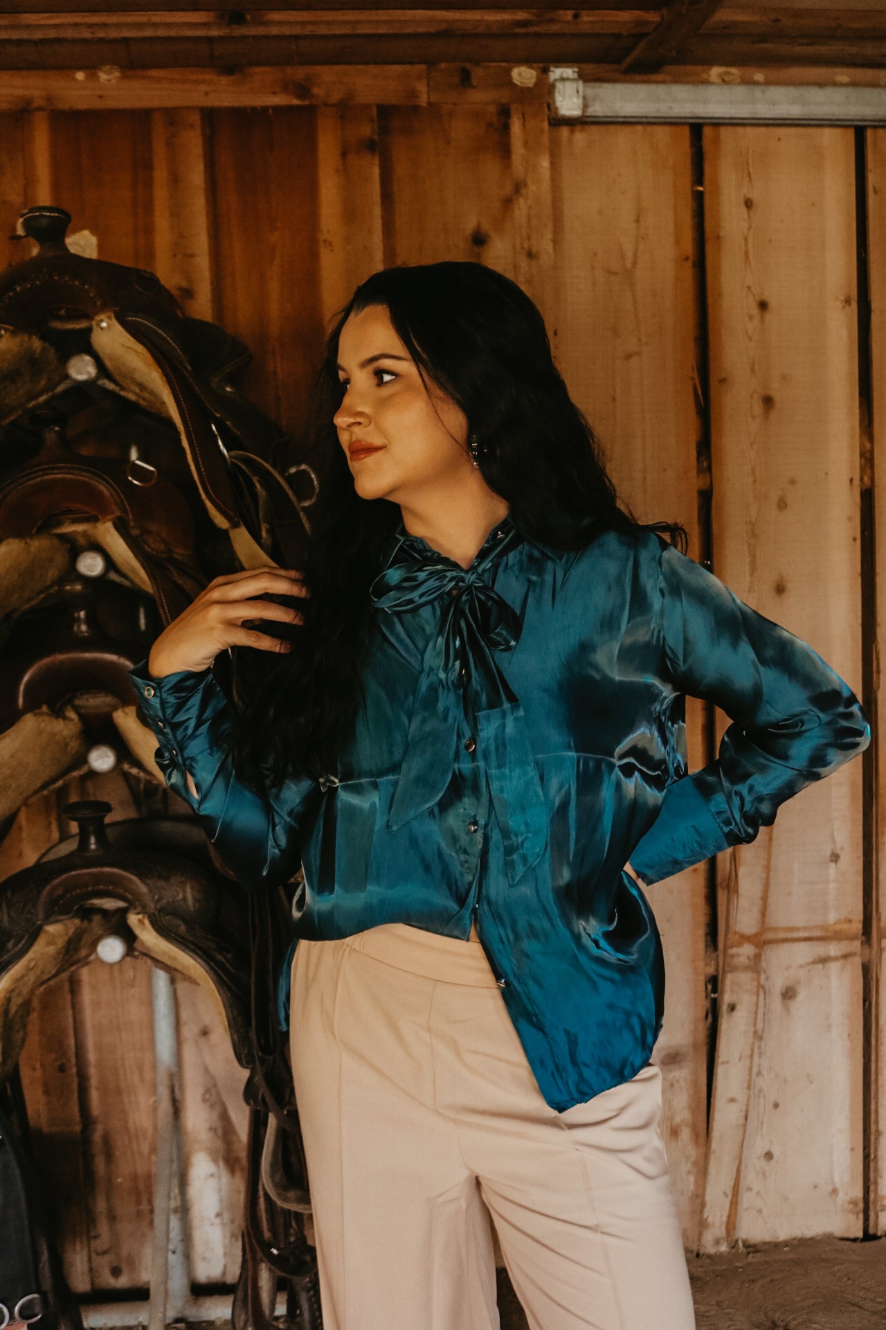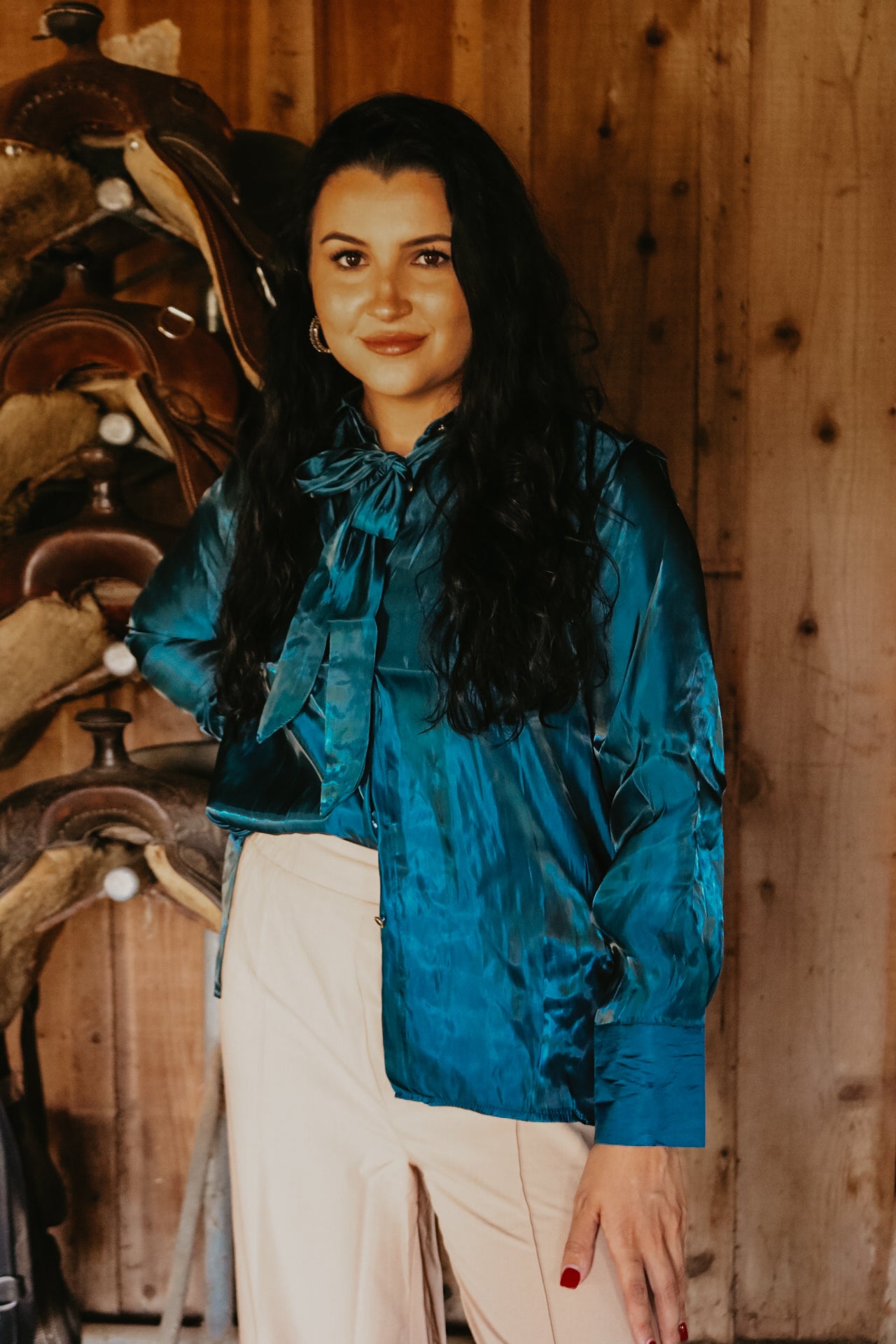 Deep Teal Long Sleeve Button Down Ribbon Neck Tie Top