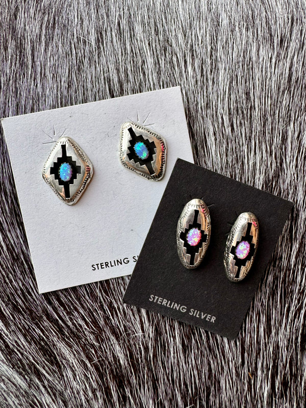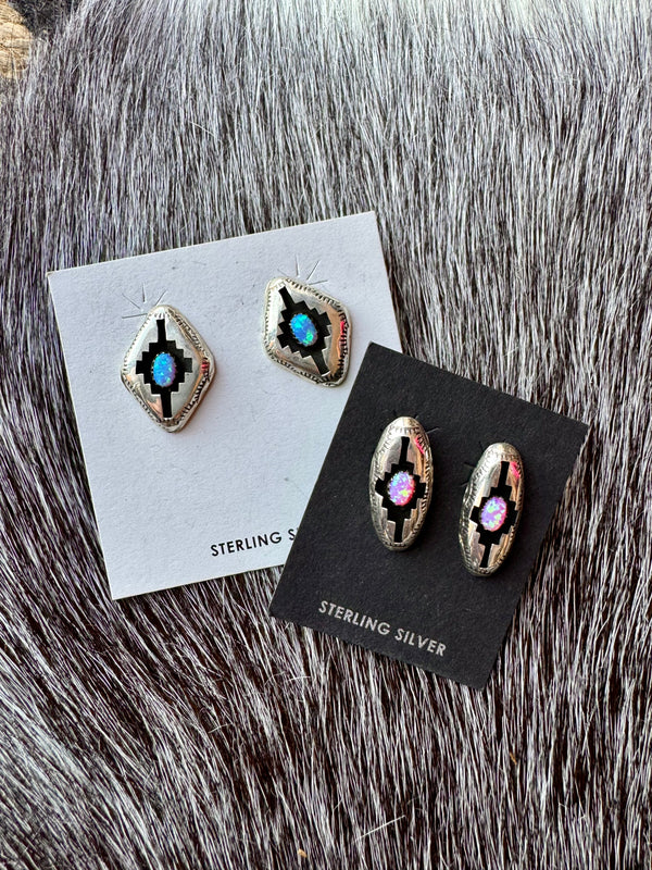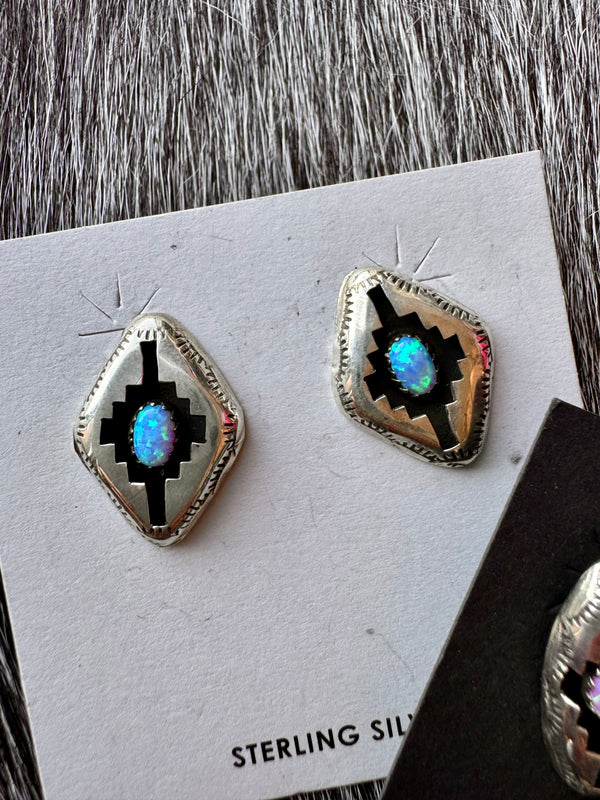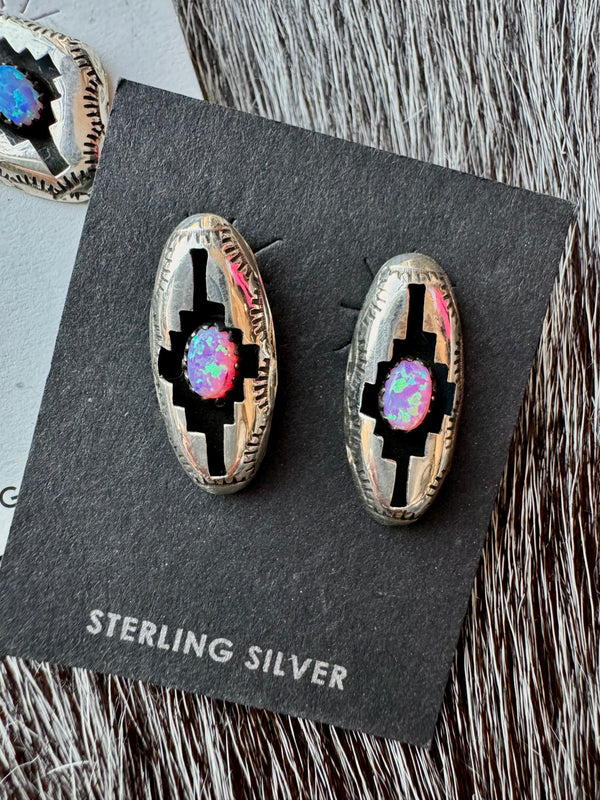 Southwest Stamped Sterling Silver & Opal Stud Earring  approximately 1” x 1/2”