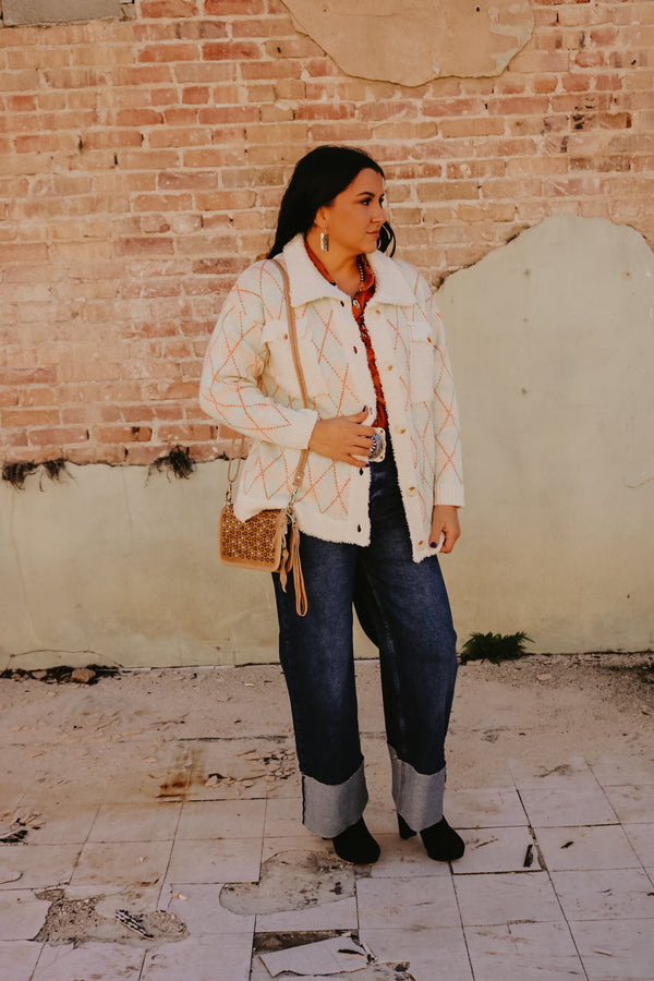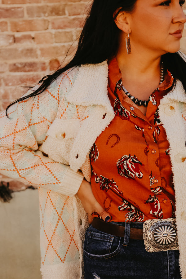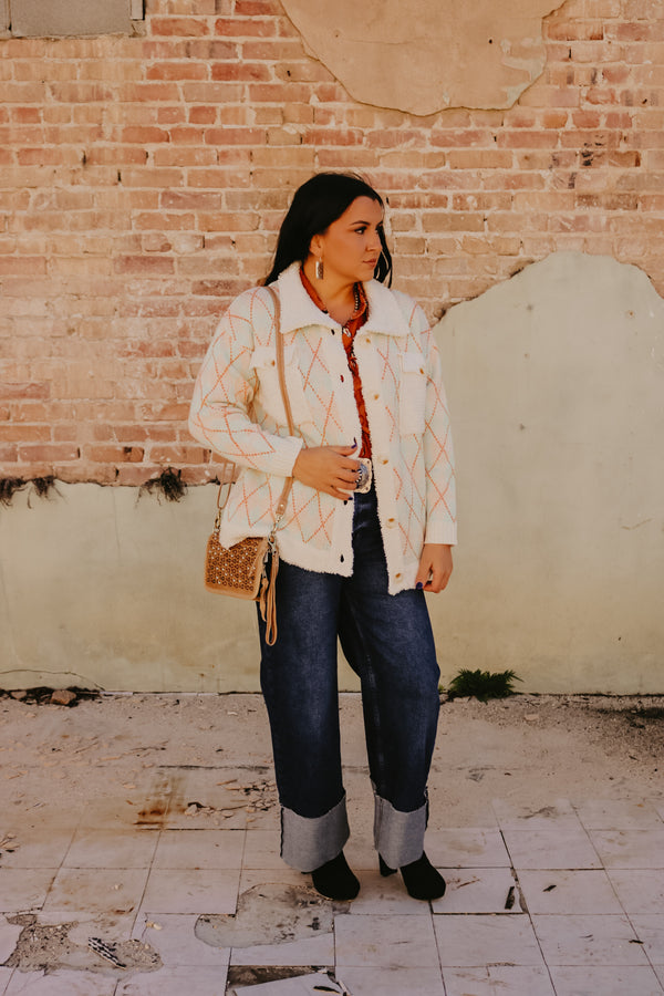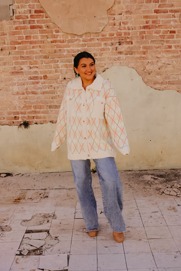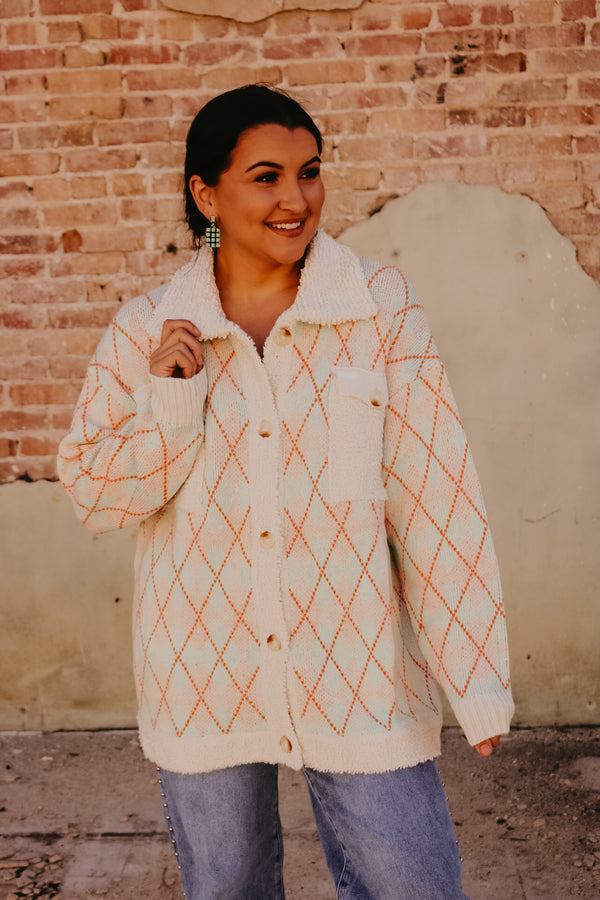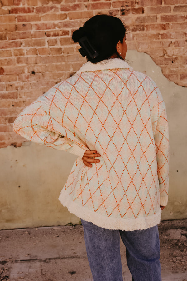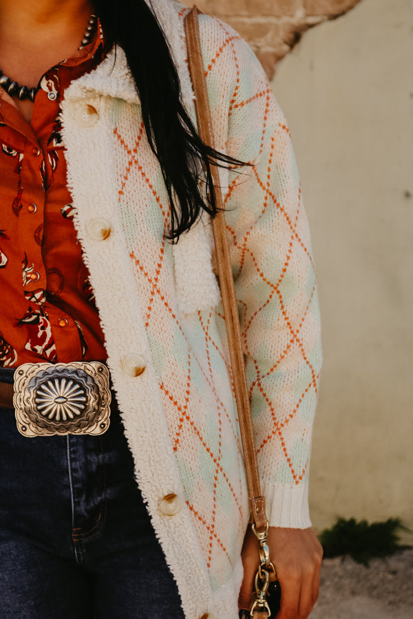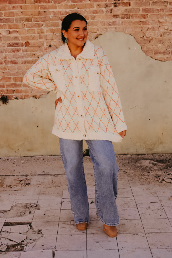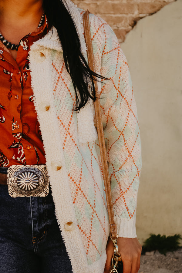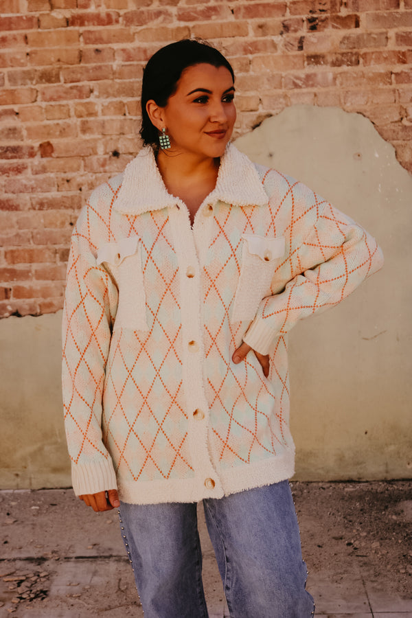 Festive Long Sleeve Argyle Knit Button Down Collared Cardigan &/or Sweater with Sherpa Collar, Trim Detail, & Hem