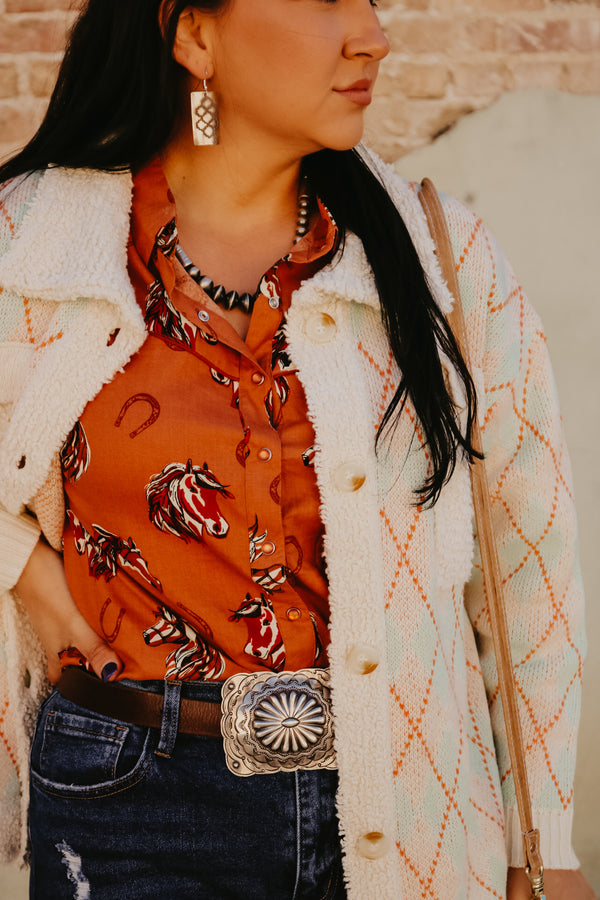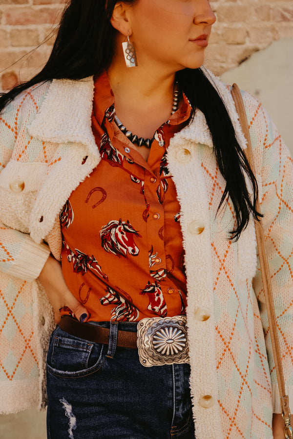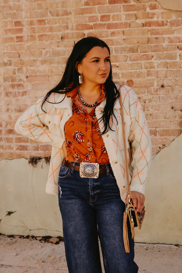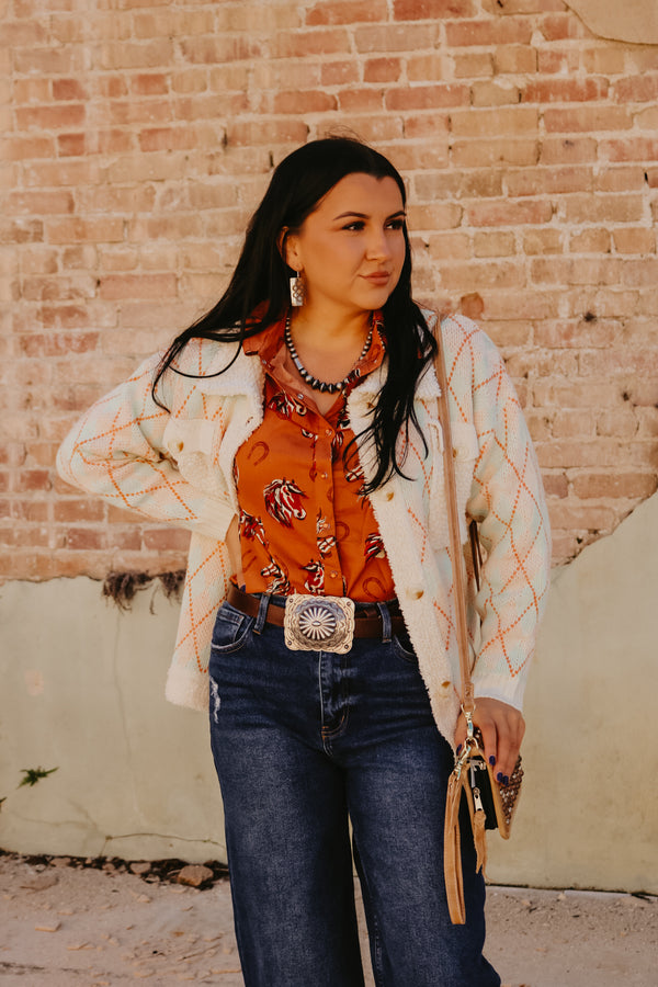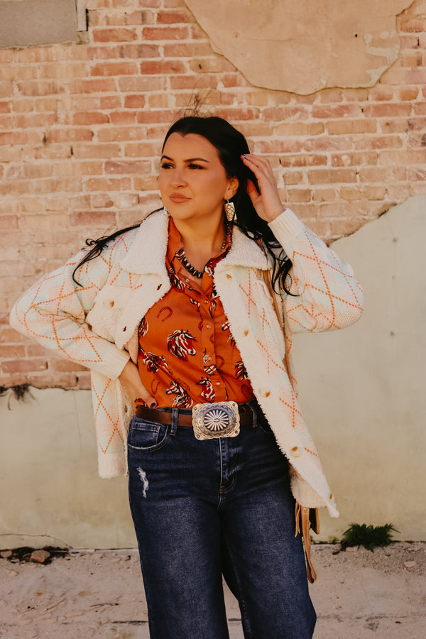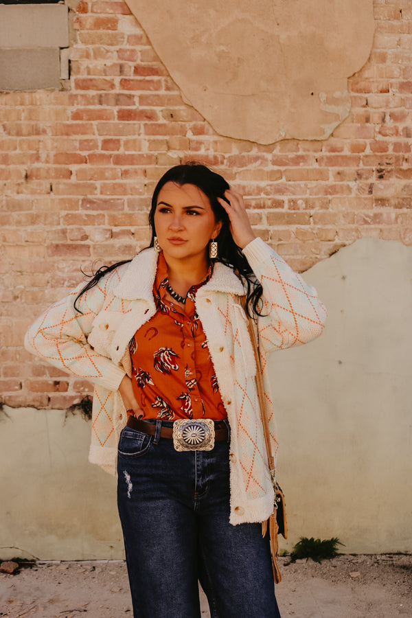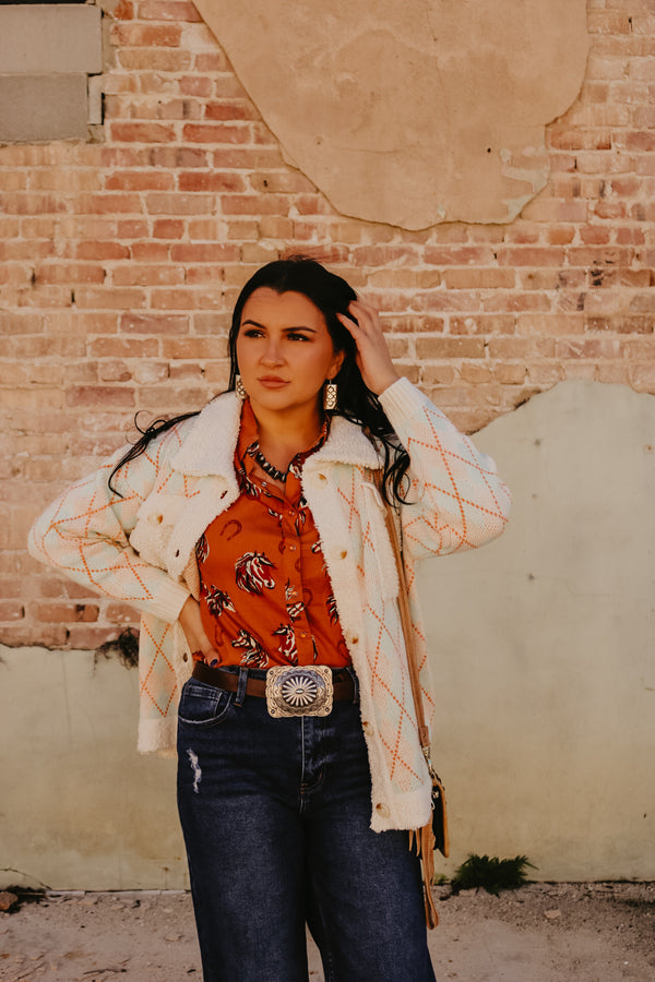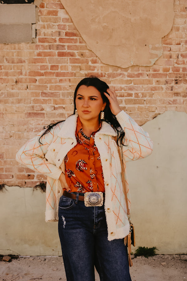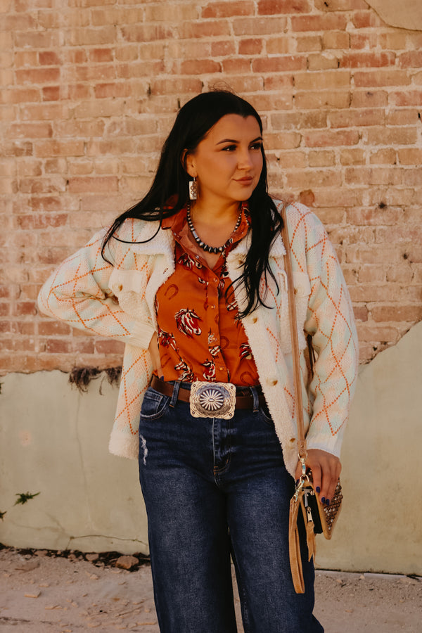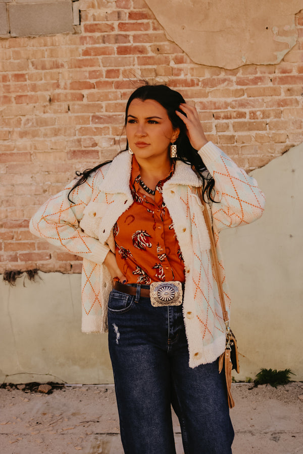 Festive Long Sleeve Argyle Knit Button Down Collared Cardigan &/or Sweater with Sherpa Collar, Trim Detail, & Hem