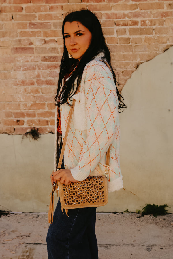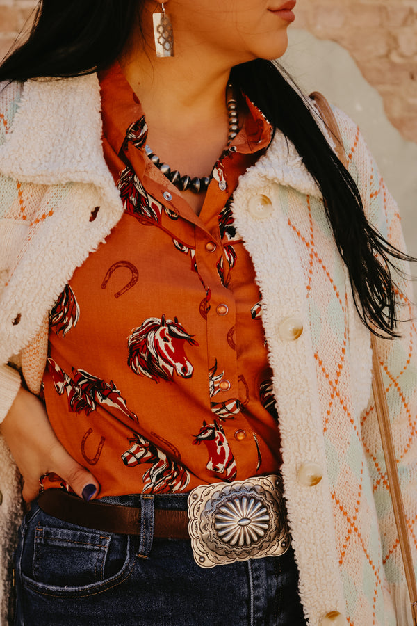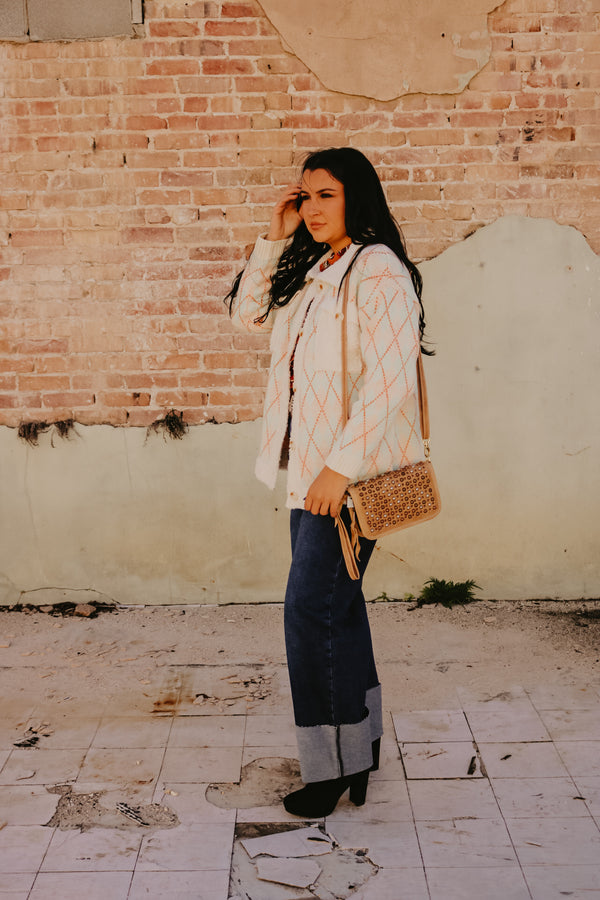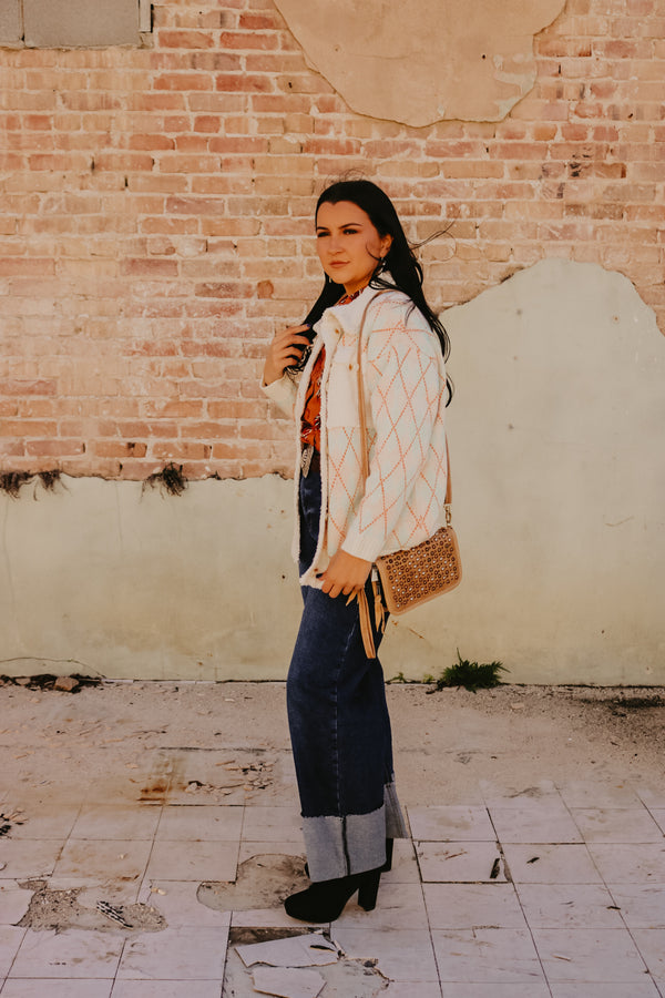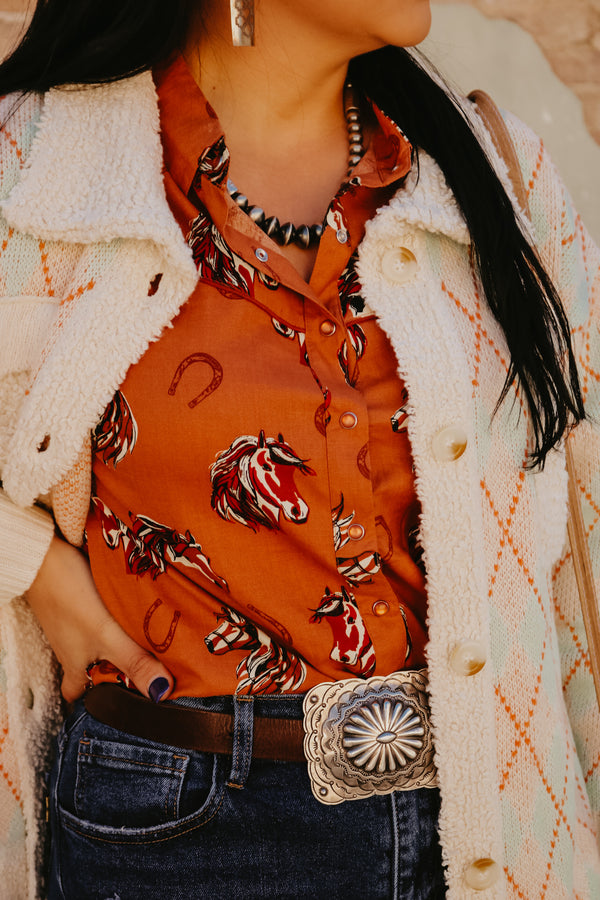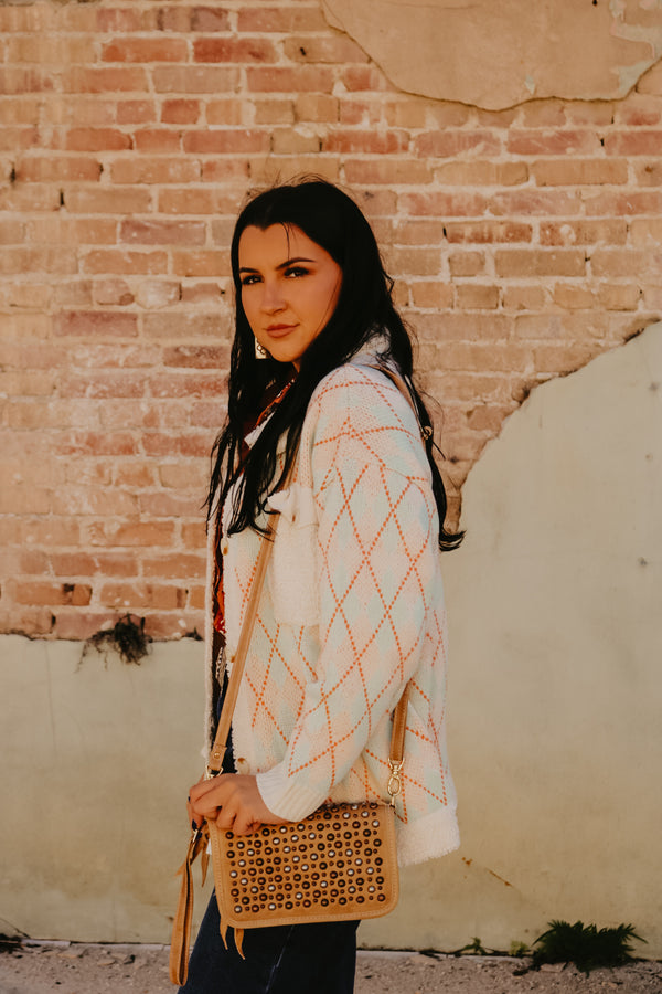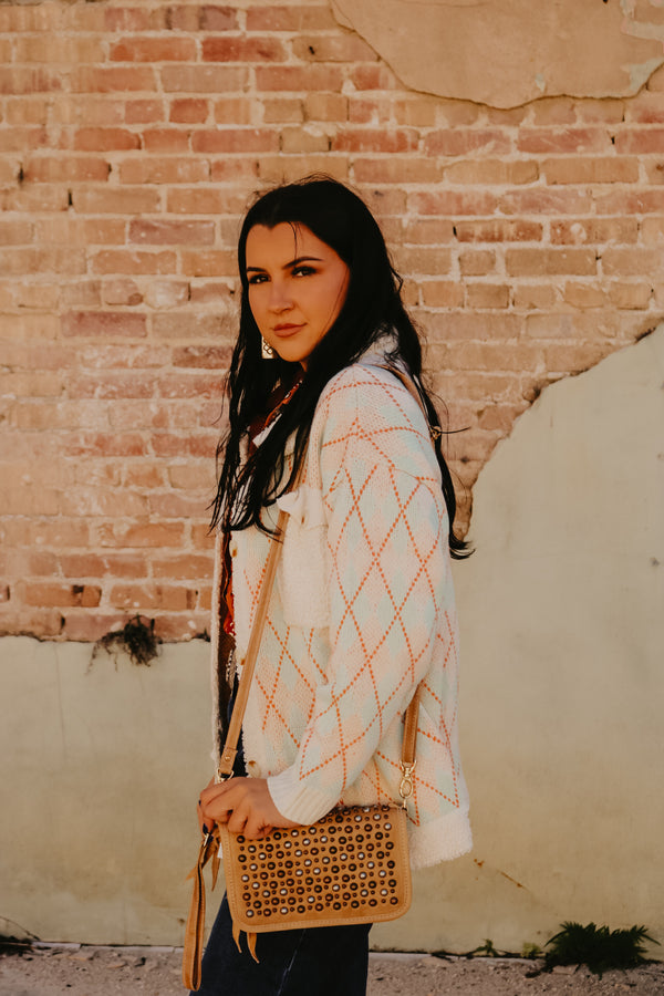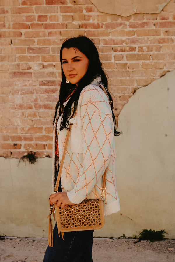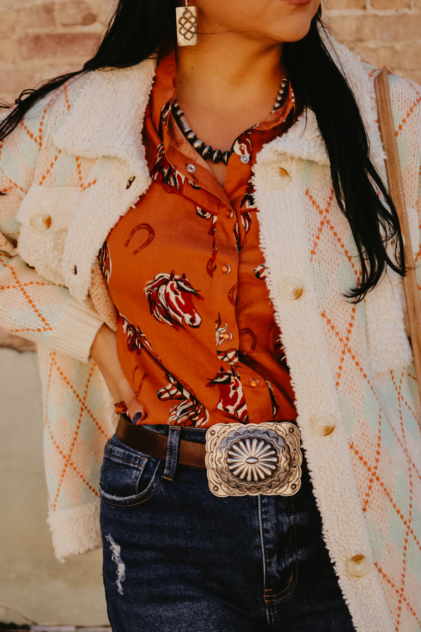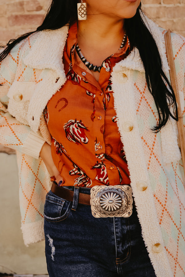Festive Long Sleeve Argyle Knit Button Down Collared Cardigan &/or Sweater with Sherpa Collar, Trim Detail, & Hem