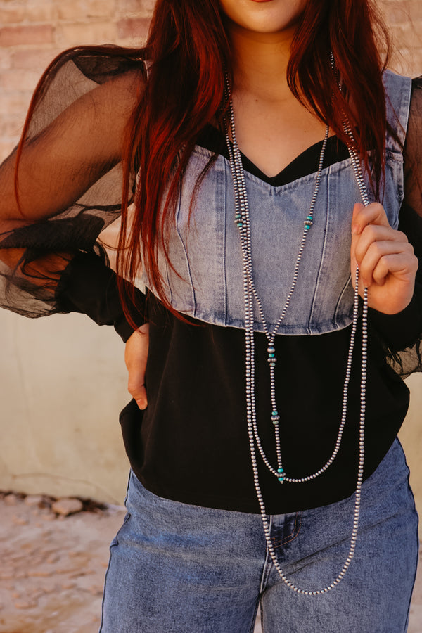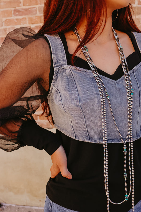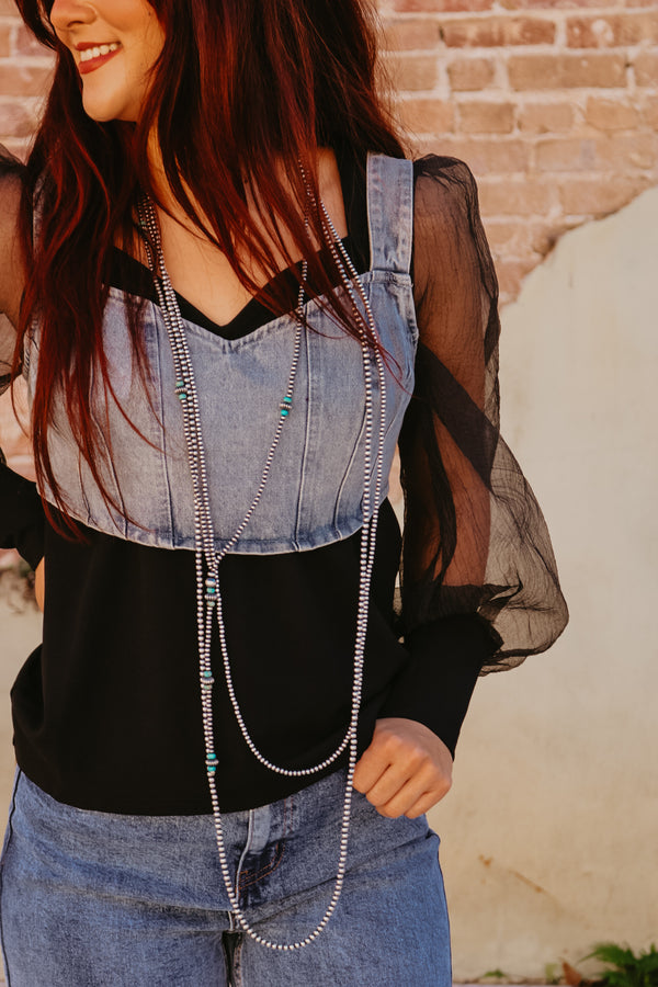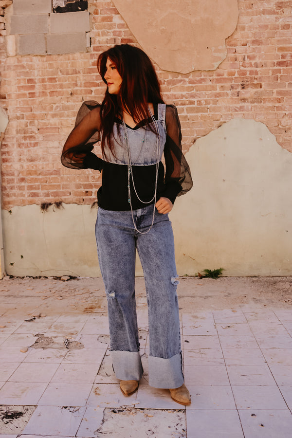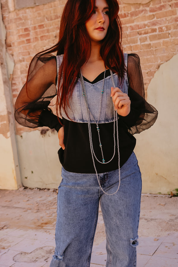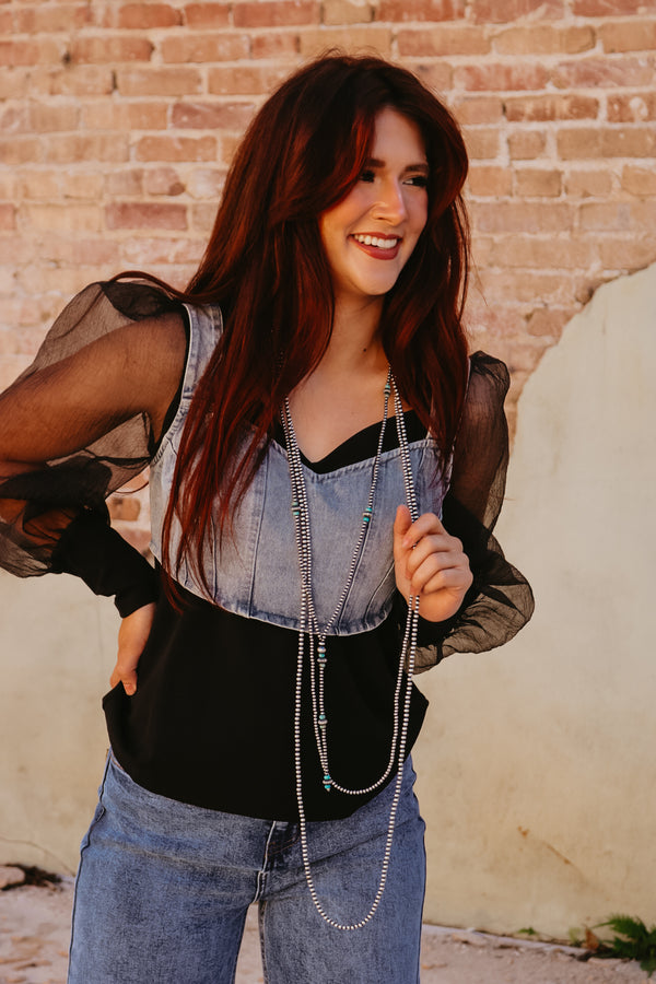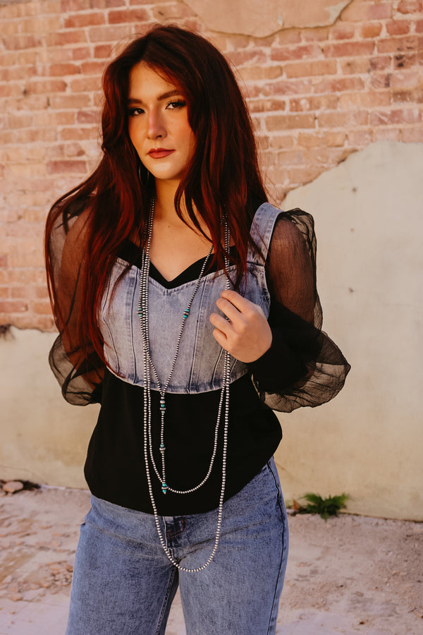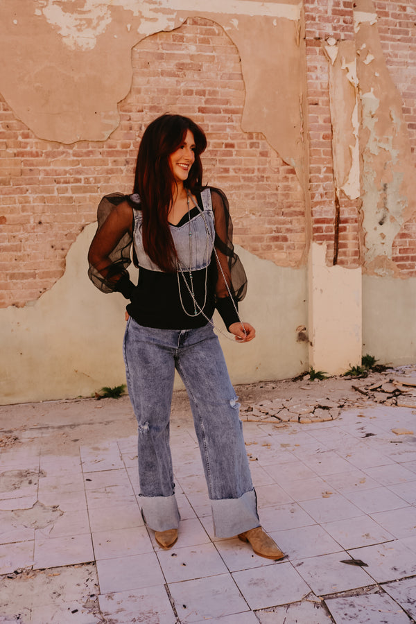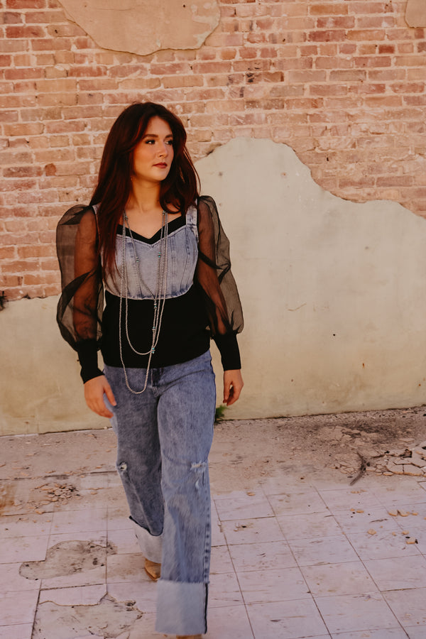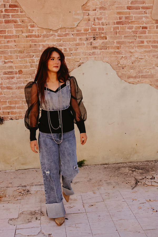 Black Sheer Puff Long Sleeve Top  Sweetheart neckline