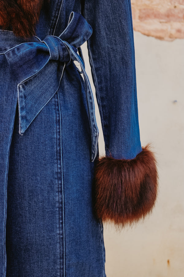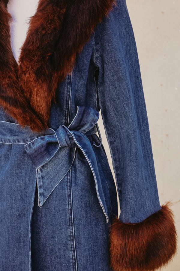 Retro Style Denim and Chocolate Fur Shearling Collar and Cuff Coat with Tie Waist Belt