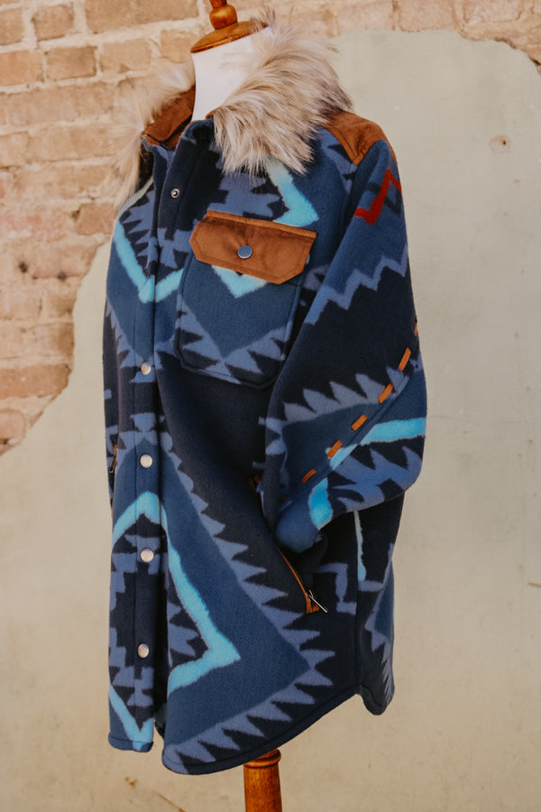 Blue Southwest Pattern Coat w/ Removable Fur Collar by Tasha Polizzi Faux Leather Buckstitch Pockets
