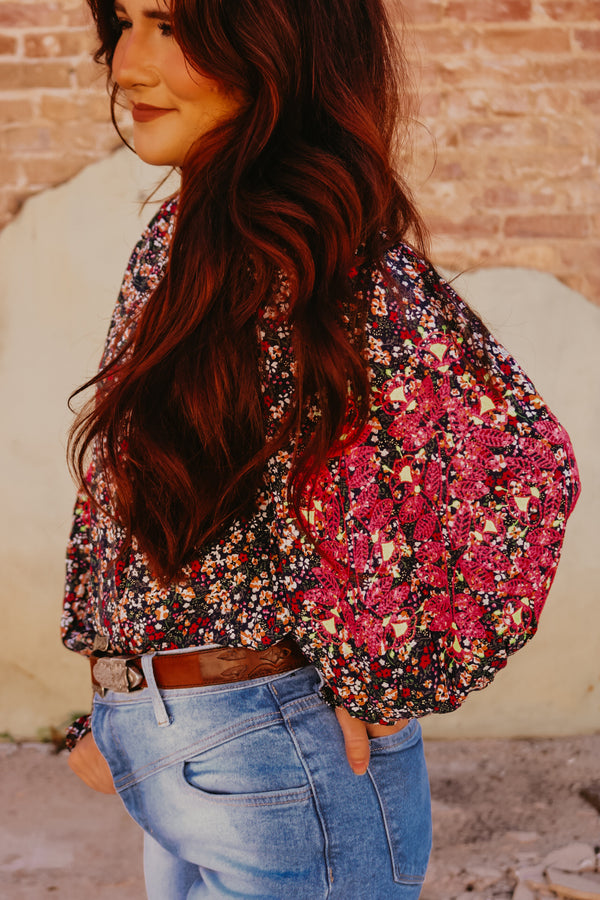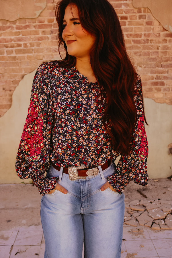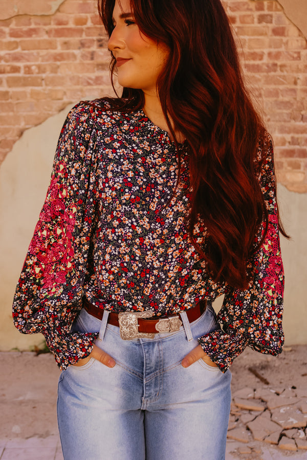 Navy Long Sleeve Multi Colored Floral Top with Neon Embroidered Details on Elbows Keyhole on back with button closure Elastic cuff on bottom of sleeve Ruffle neckline  Neon pink and yellow floral pattern embroidered