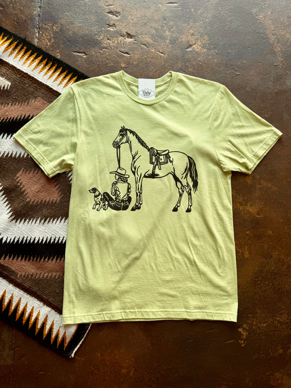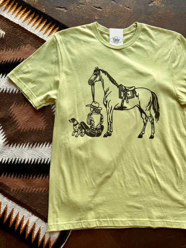 Pistachio Cowgirl with Dog & Horse Silhouette Graphic Tee 100% Cotton