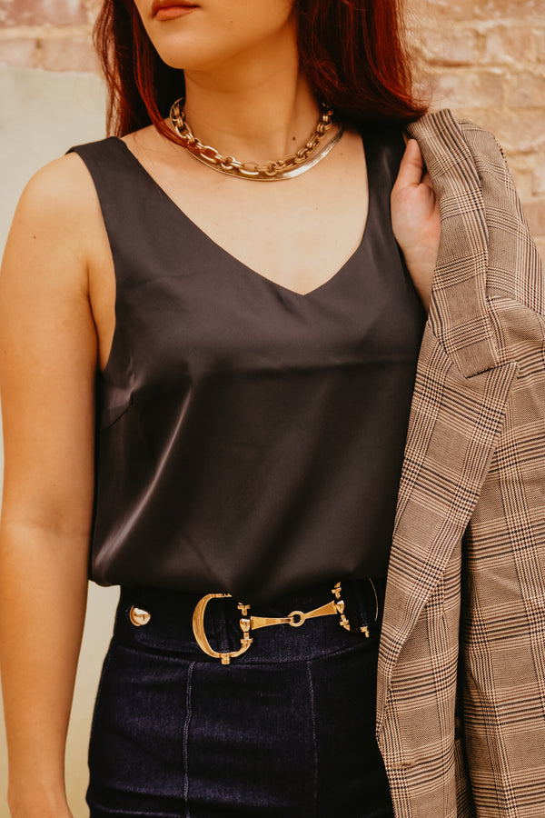 Black Satin Wide Strap V-Neck Cami Top 96% Polyester 4% Spandex