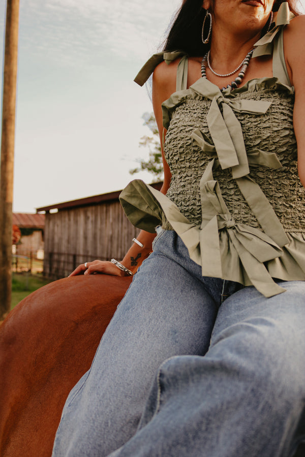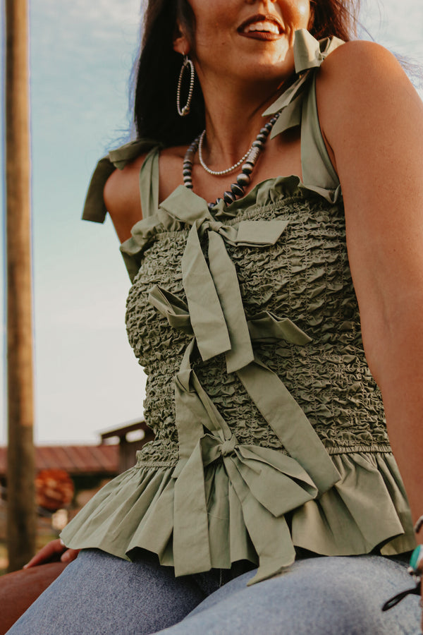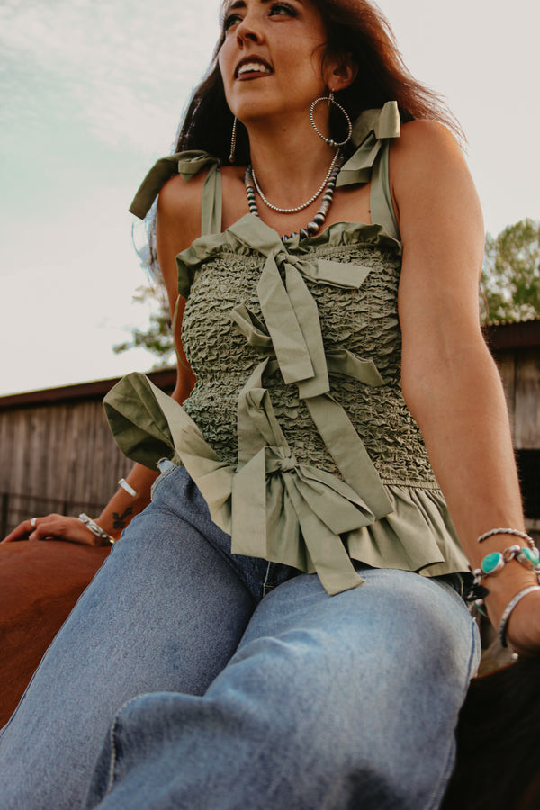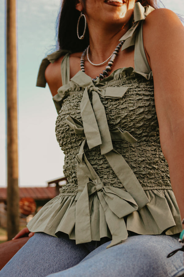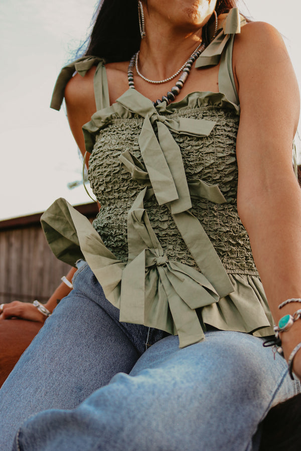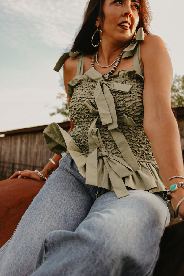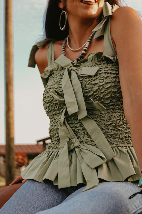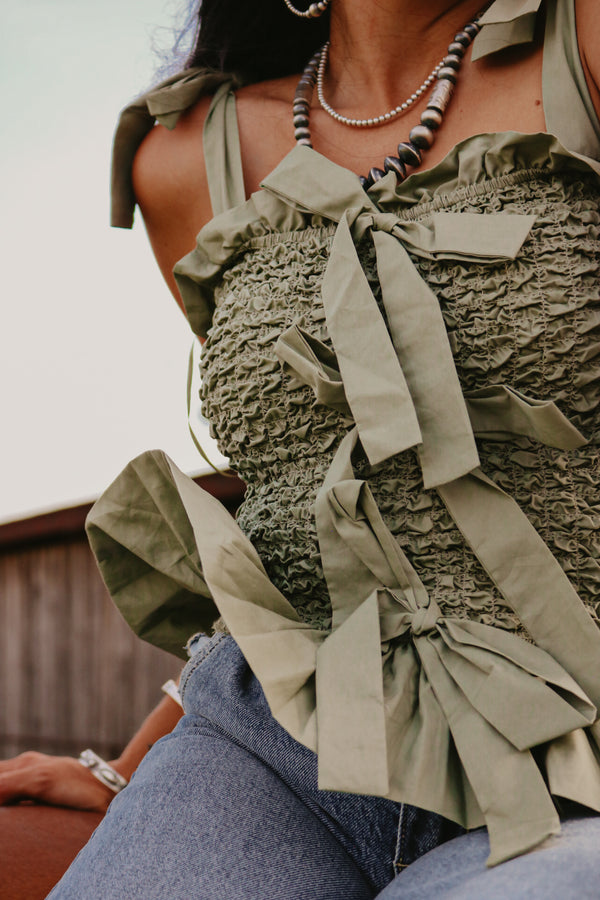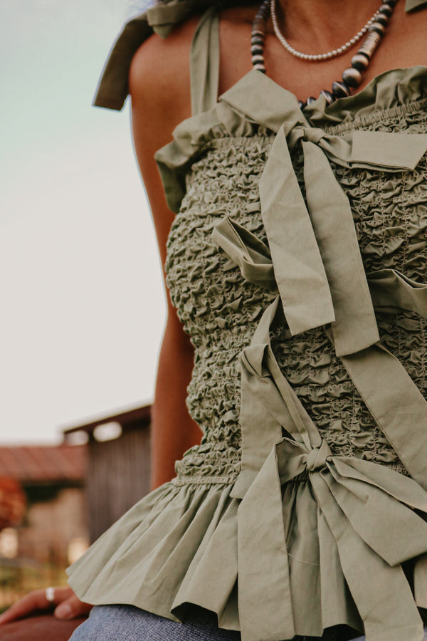 Olive Smocked Tie Sleeve Ruffle Top Front bow ties 100% Cotton