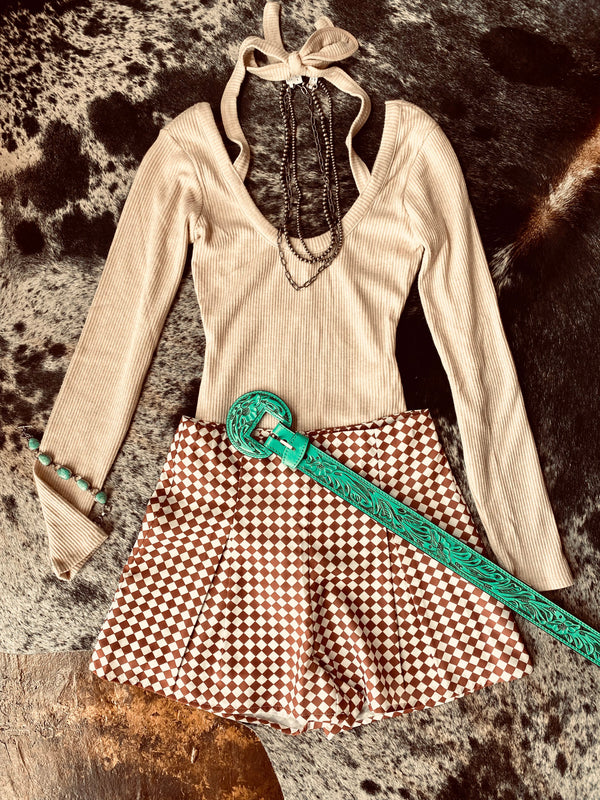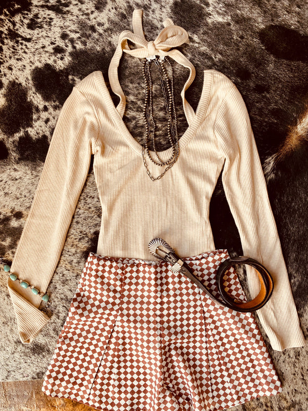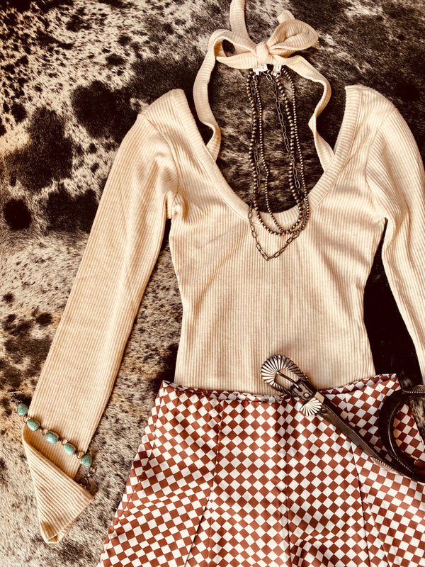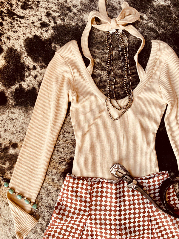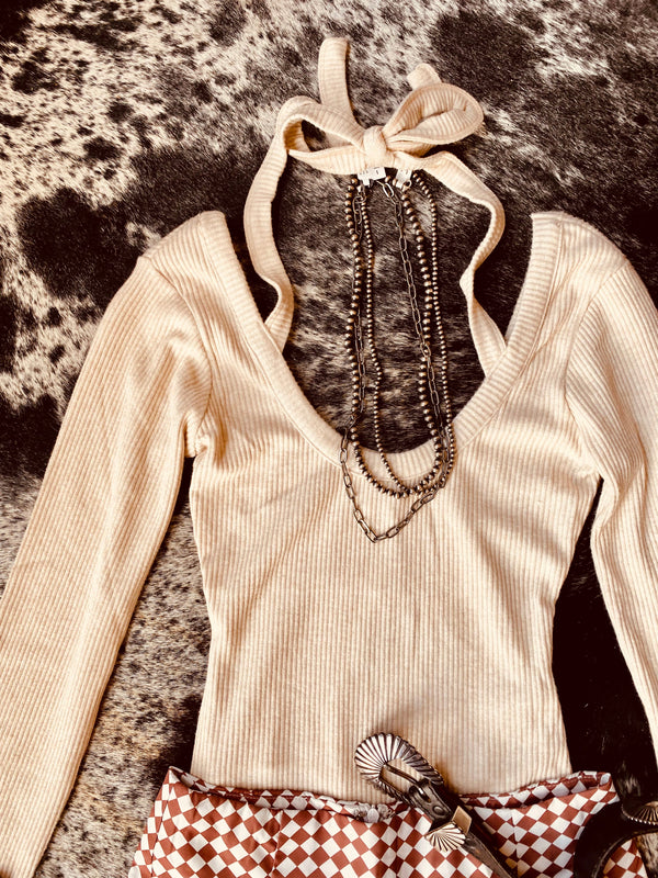 Oatmeal Ribbed Knit Bodysuit with Tie Strap Detail Snap button closure 48% Rayon 27% Polyester 20% Nylon 5% Spandex