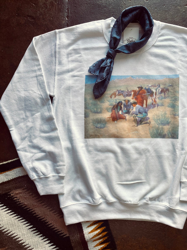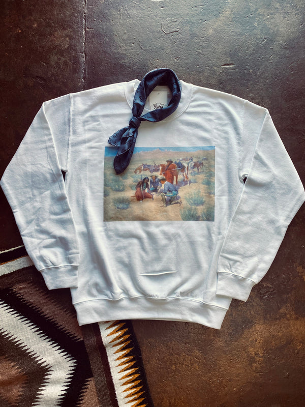 Licensed Graphic Cowboy & Indian Western Painting Scene Printed on White Sweatshirt  *FULLY LICENSED GRAPHIC* Heavy blend Gildan  50% Cotton 50% Polyester