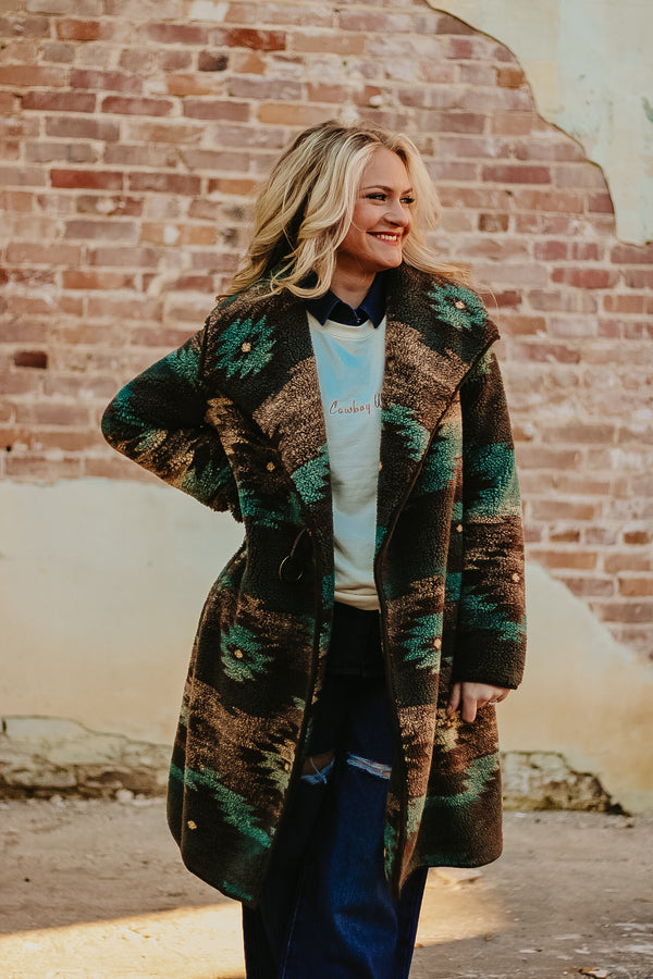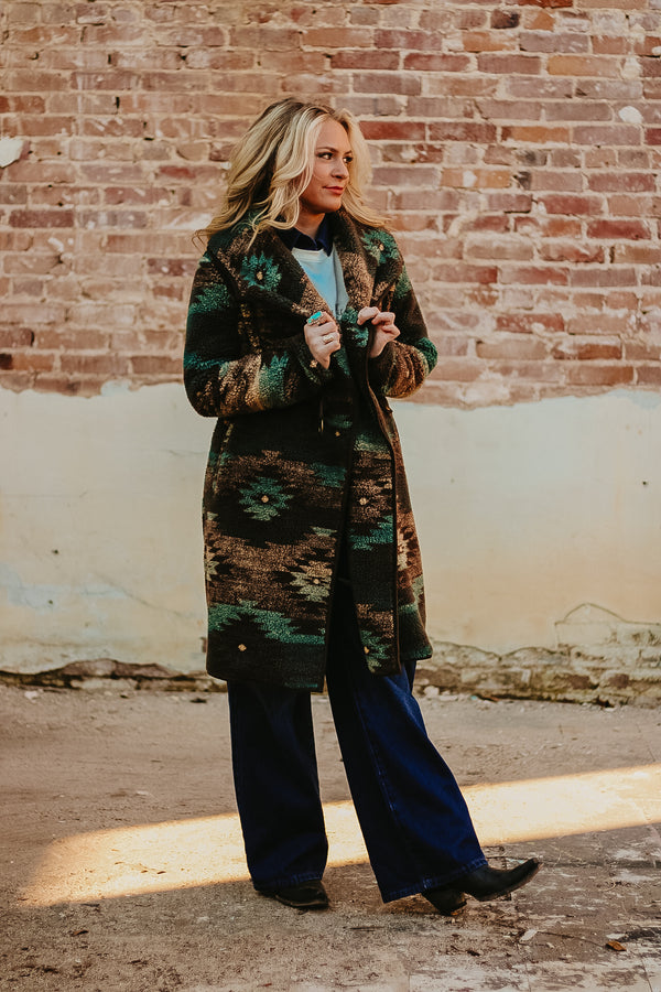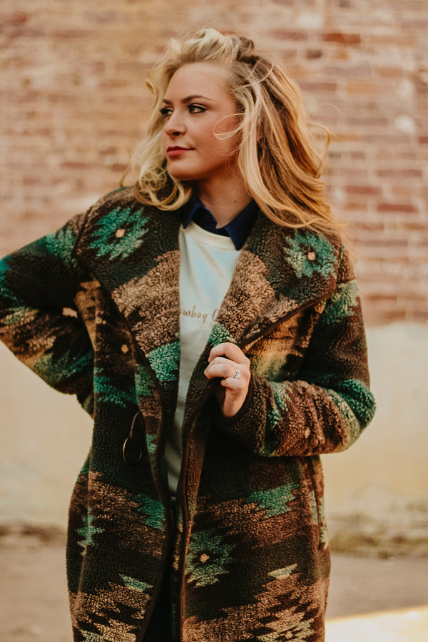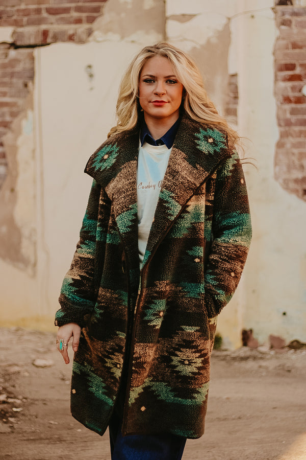 Dark Brown, Turquoise, & Tan Sherpa Coat w/ Button Closure by Tasha Polizzi  70% Polyester 30% Acrylic