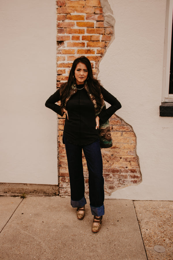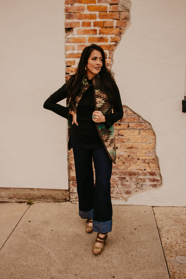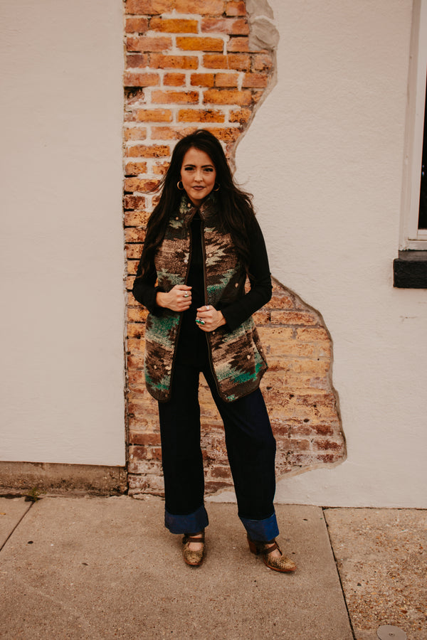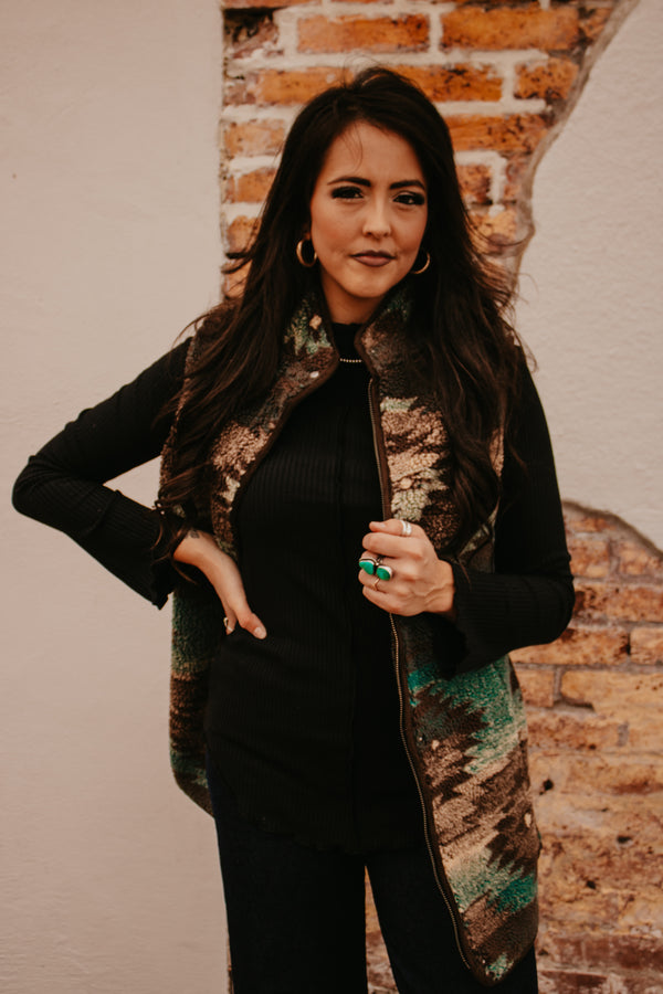 Dark Brown, Tan, & Turquoise Sherpa Vest w/  Zipper & Button Closure by Tasha Polizzi 70% Polyester 30% Acrylic