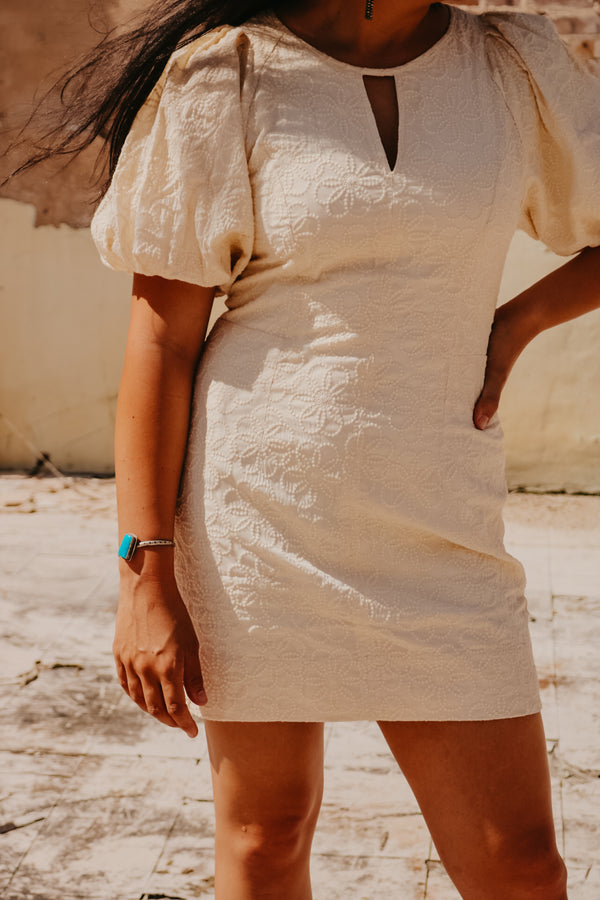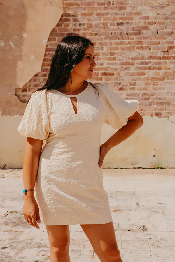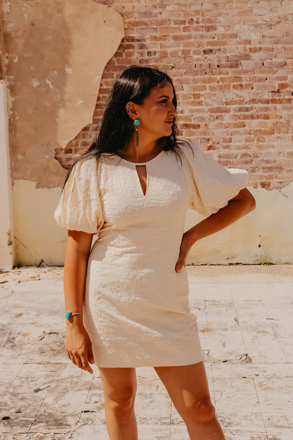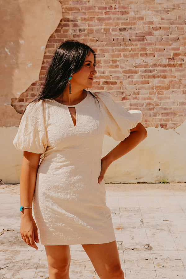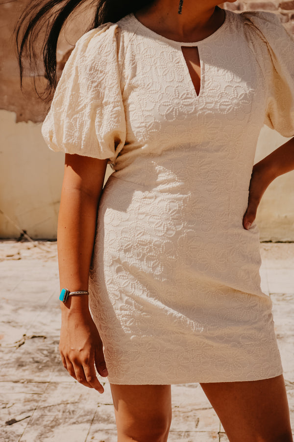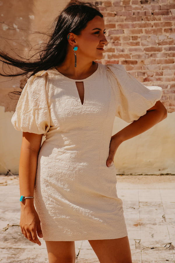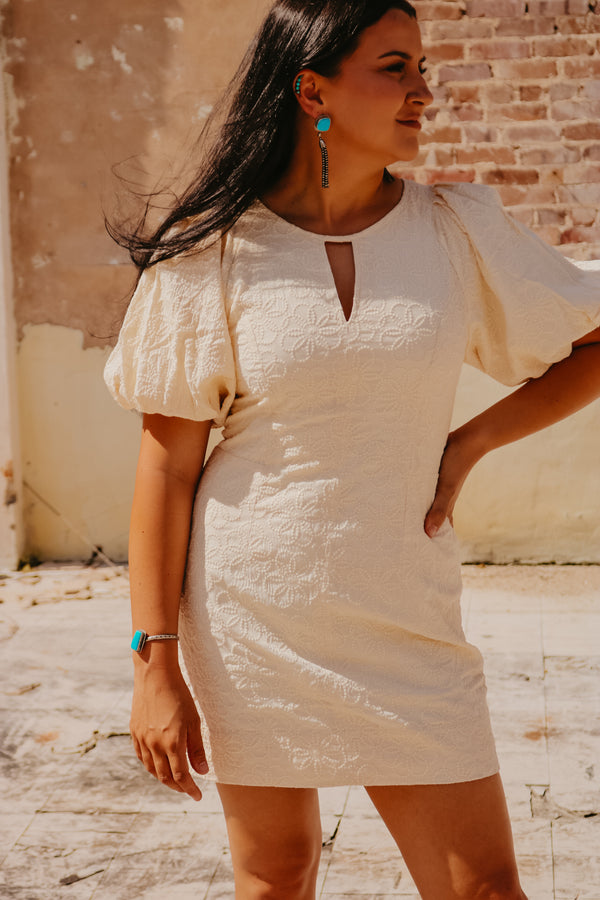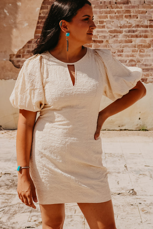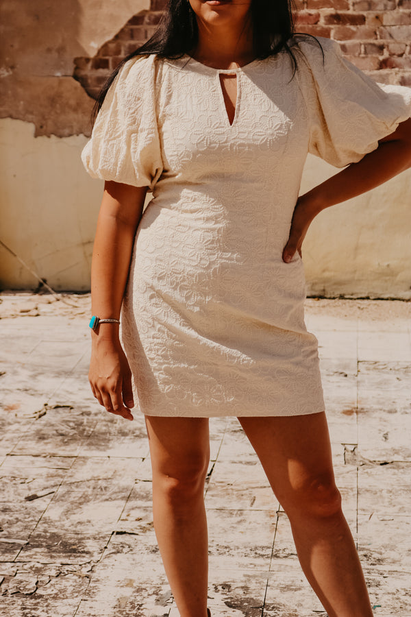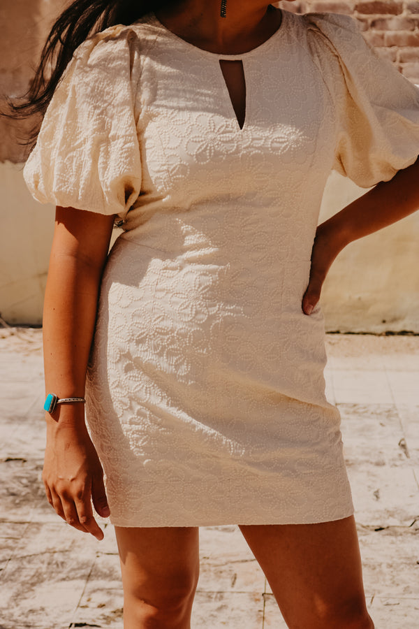 Cream Puff Sleeve Floral Textured Embroidered Dress