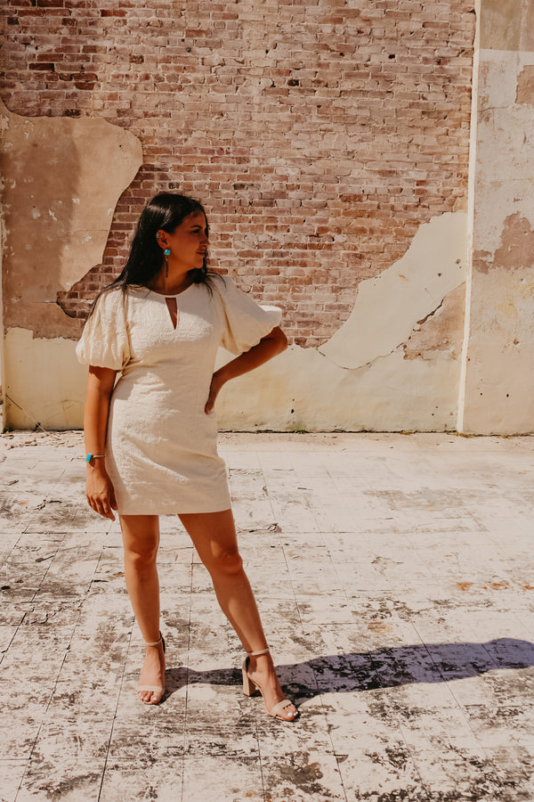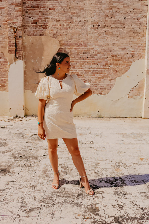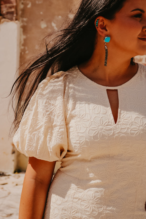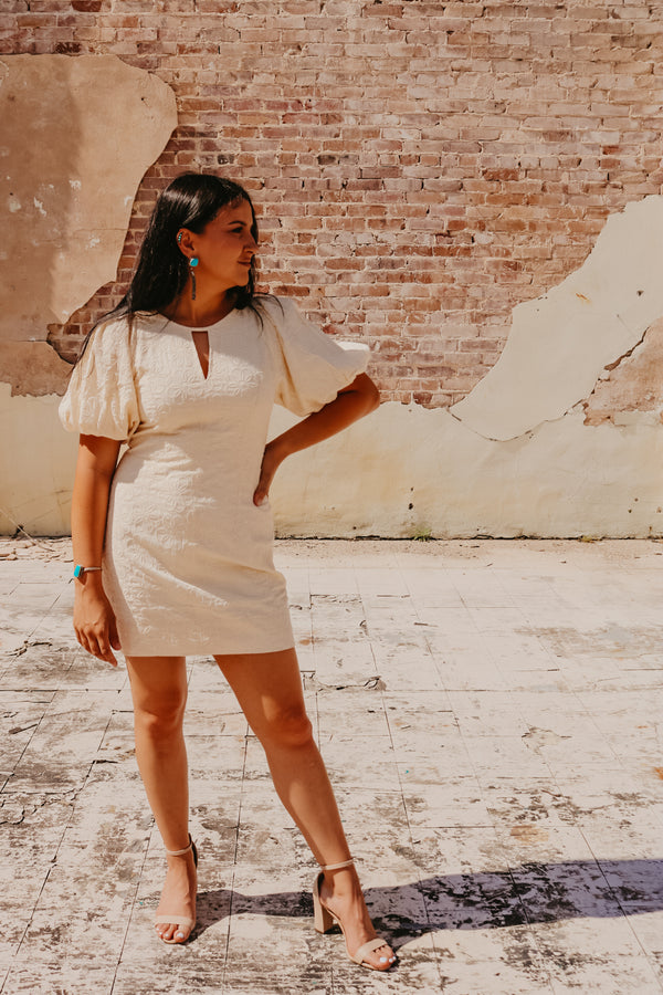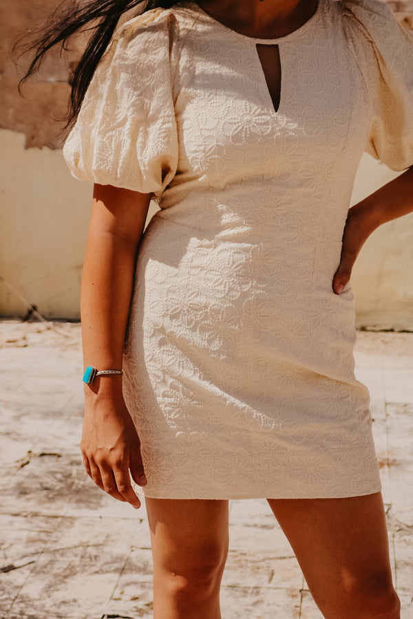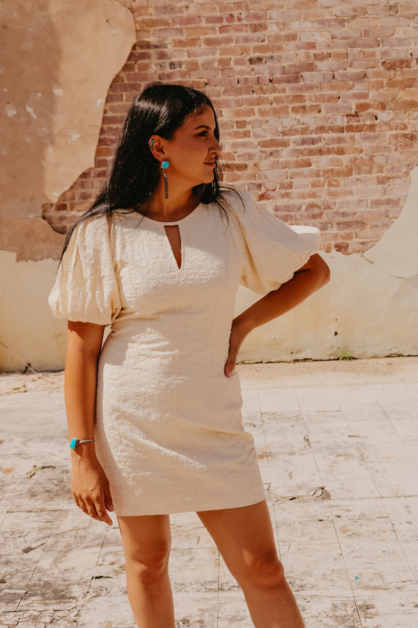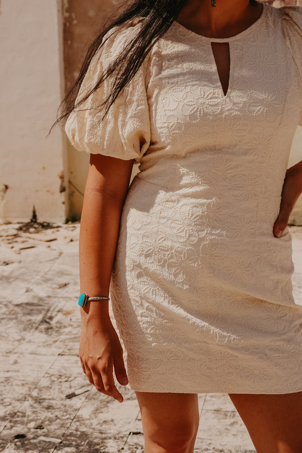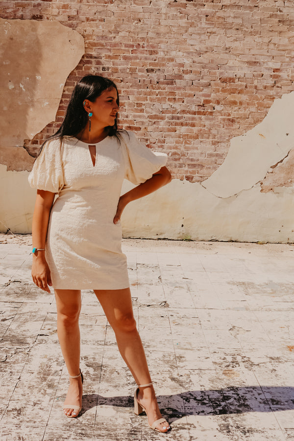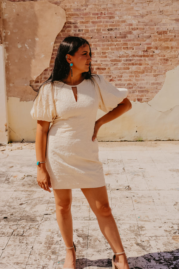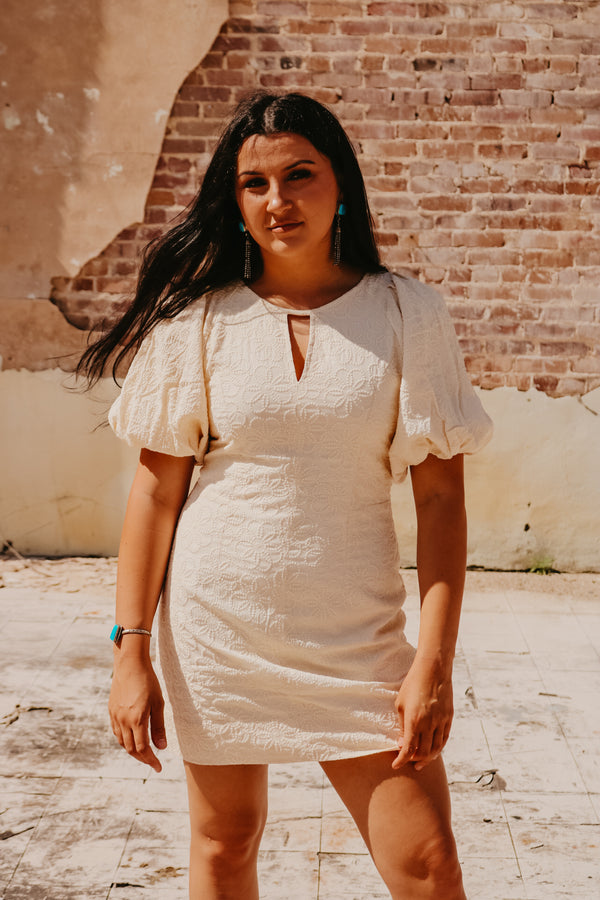 Cream Puff Sleeve Floral Textured Embroidered Dress