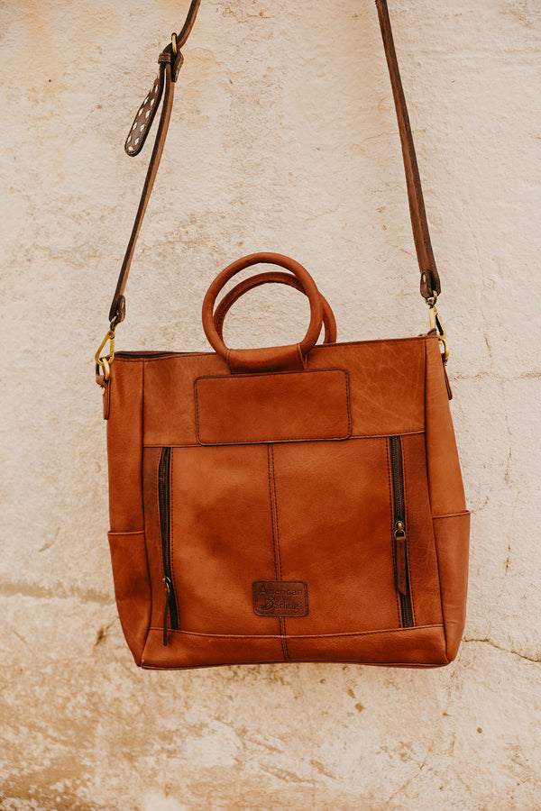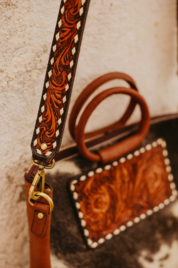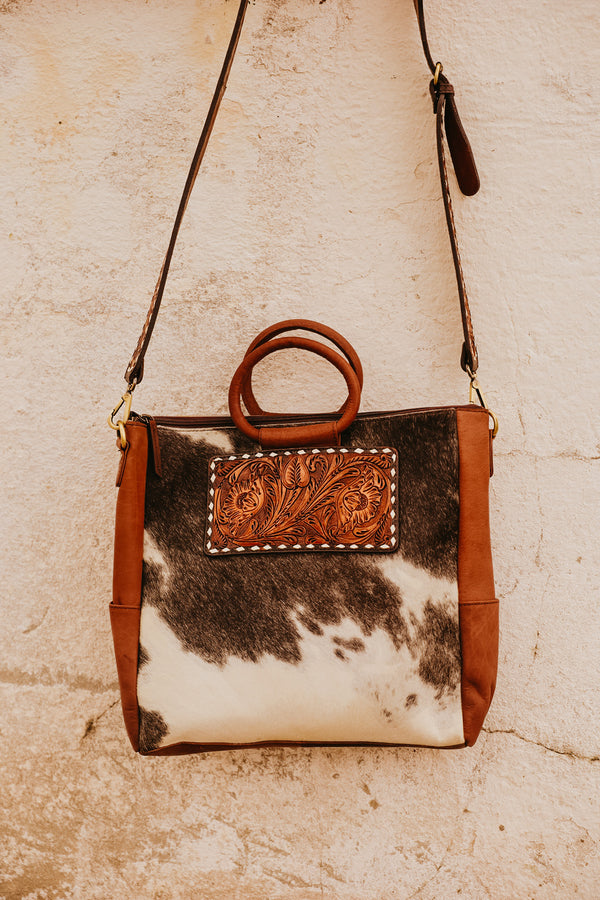 Cowhide & Leather Rolled Handle Tote with Tooled Leather Patch 15" x 14" x 4" Removable tooled leather strap Zipper closure