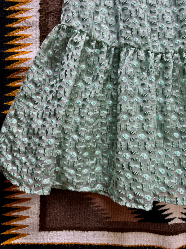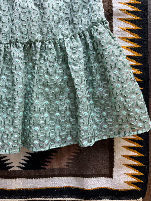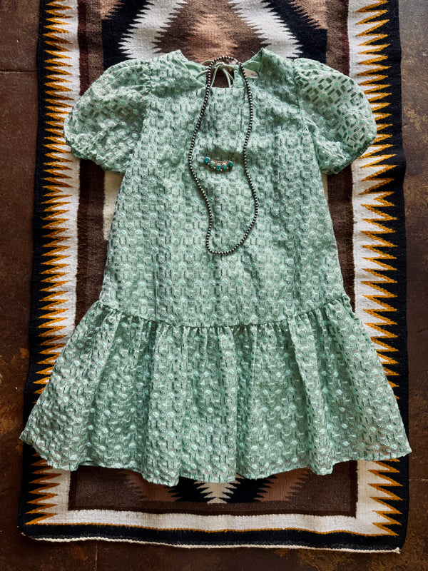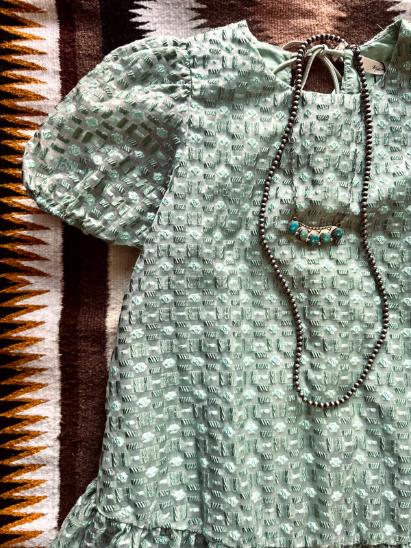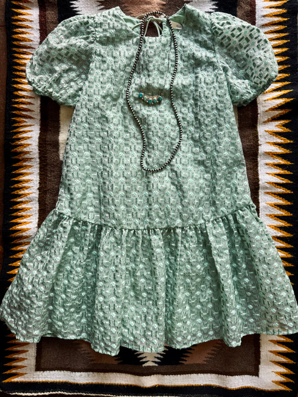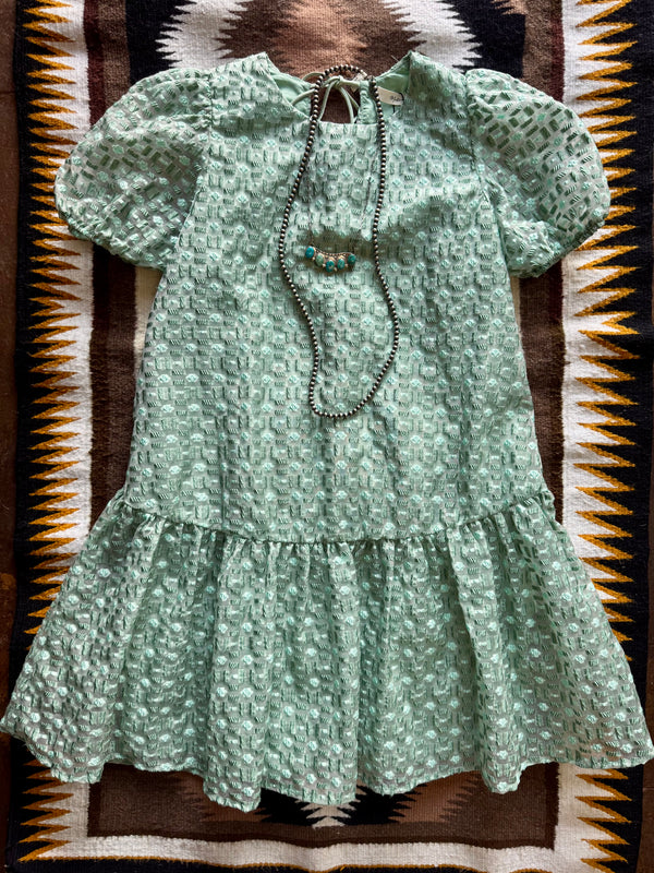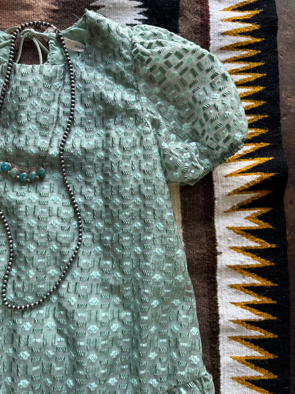 Mint Sage Puff Sleeve Textured Dress with Tie Back Ruffle hem 100% Polyester