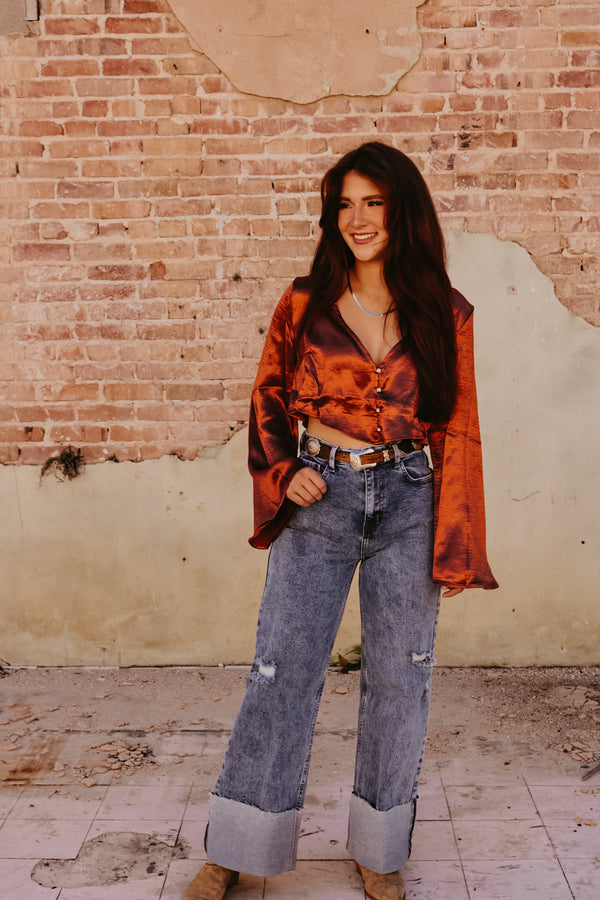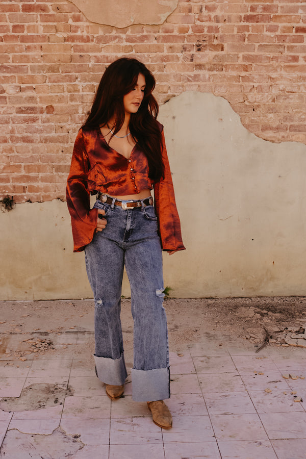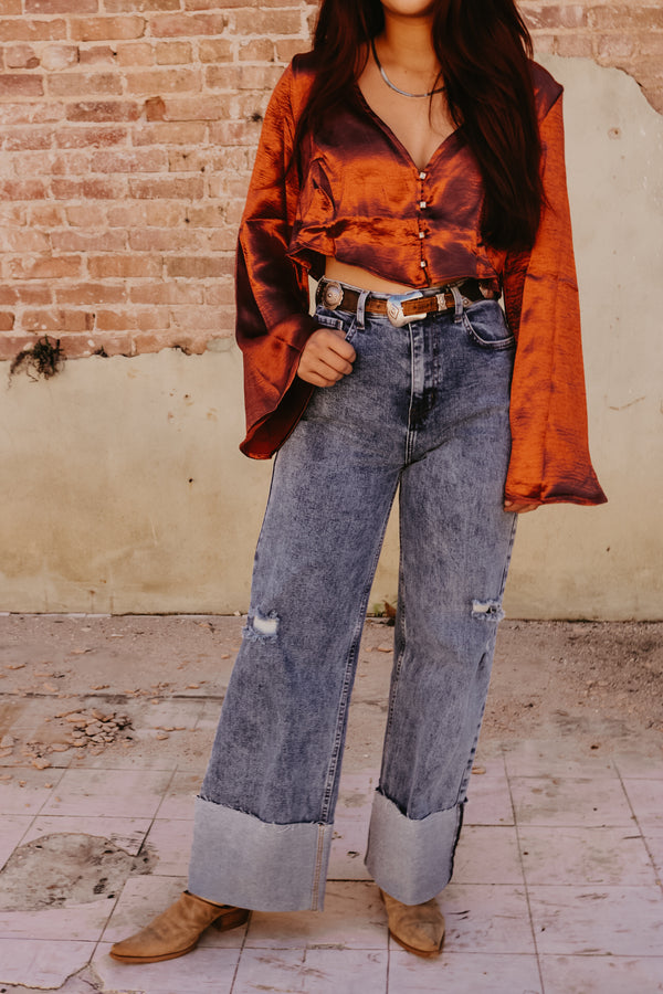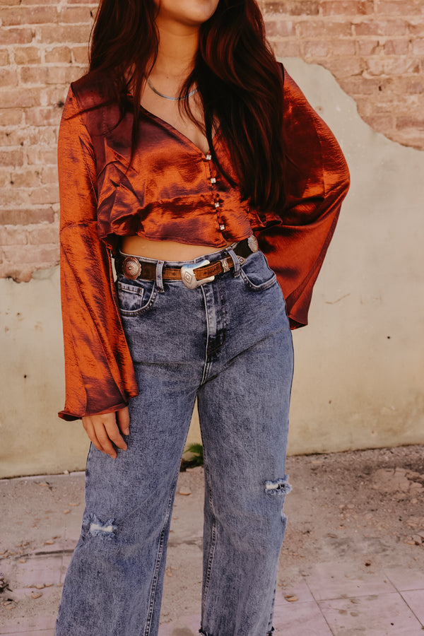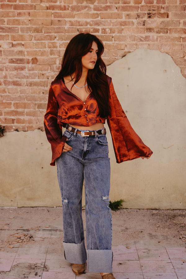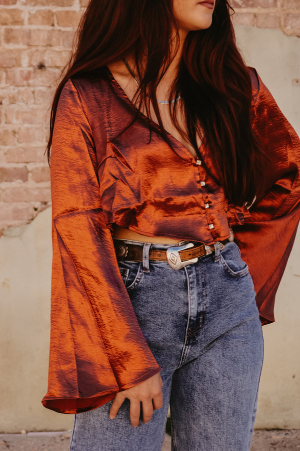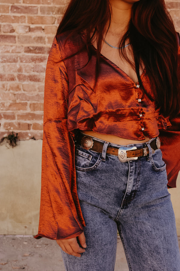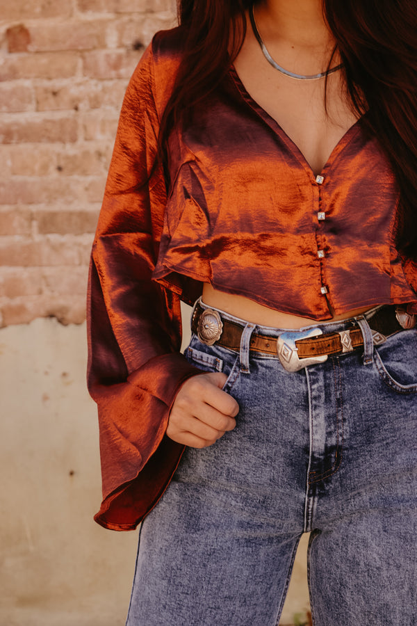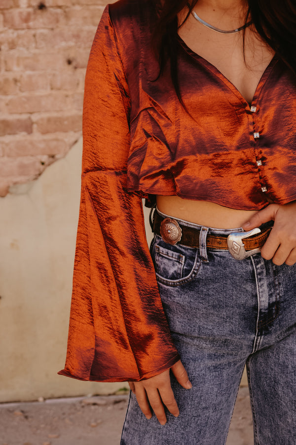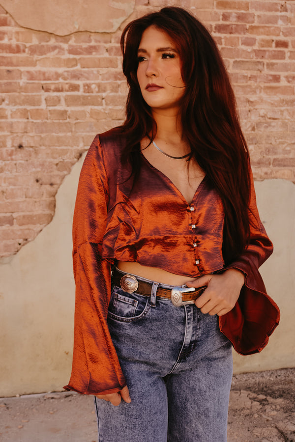 Rust Satin Bell Sleeve Button Down Top Crop fit Gold Rhinestone button accents 100% Polyester