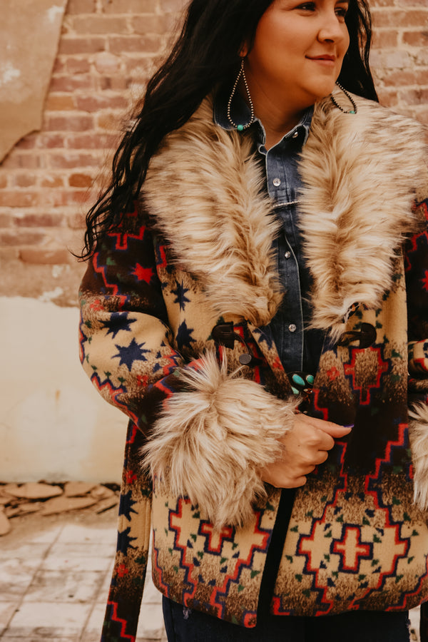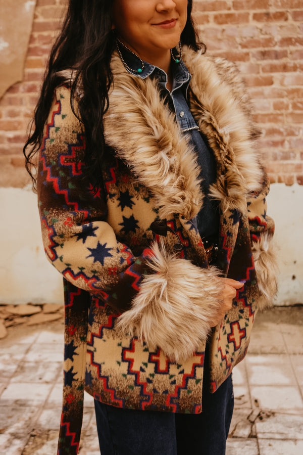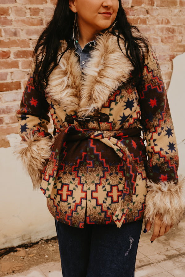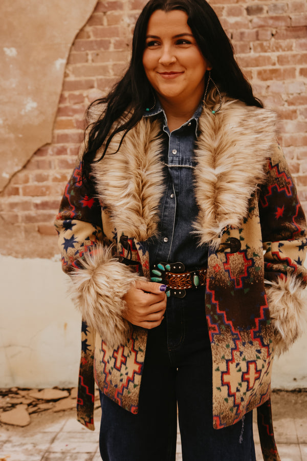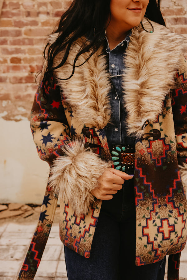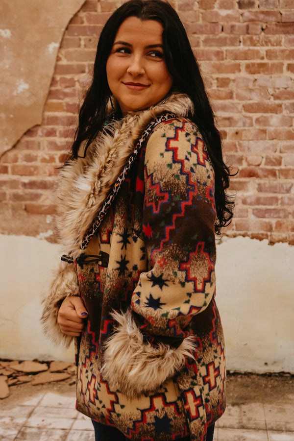 Brown & Tan Southwest Fur Collared Mountain Coat Jacket by Tasha Polizzi Leopard print pattern lining