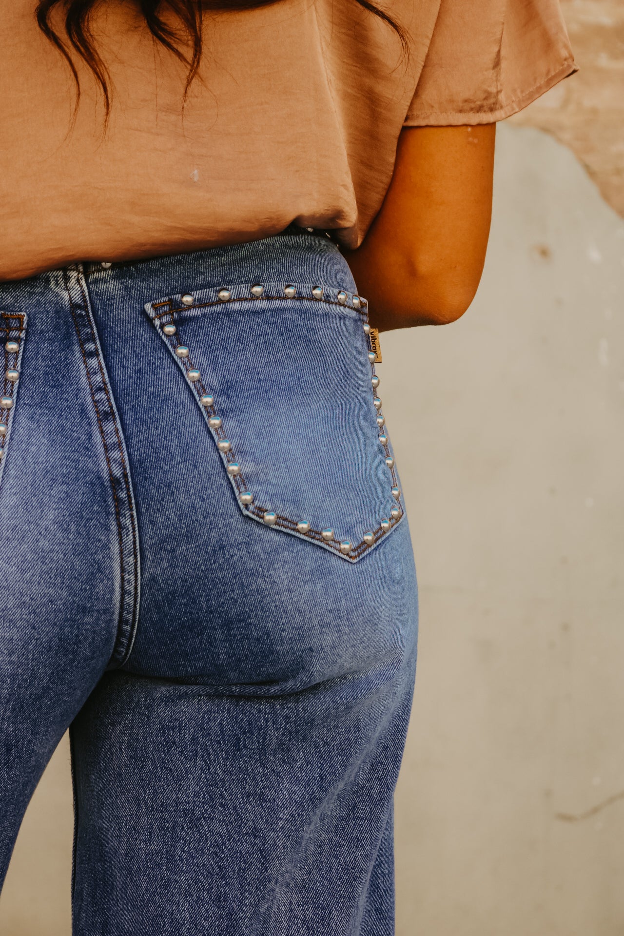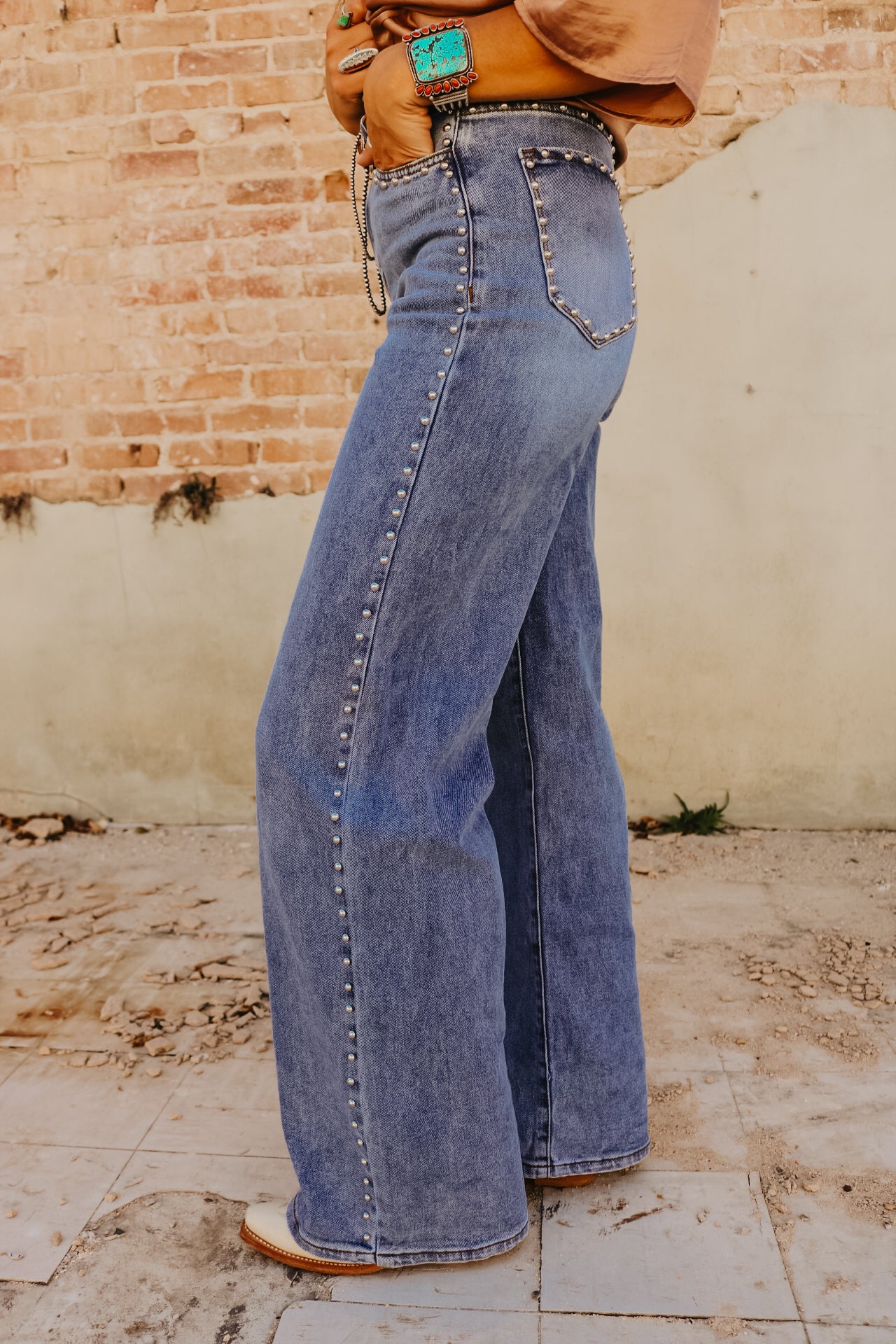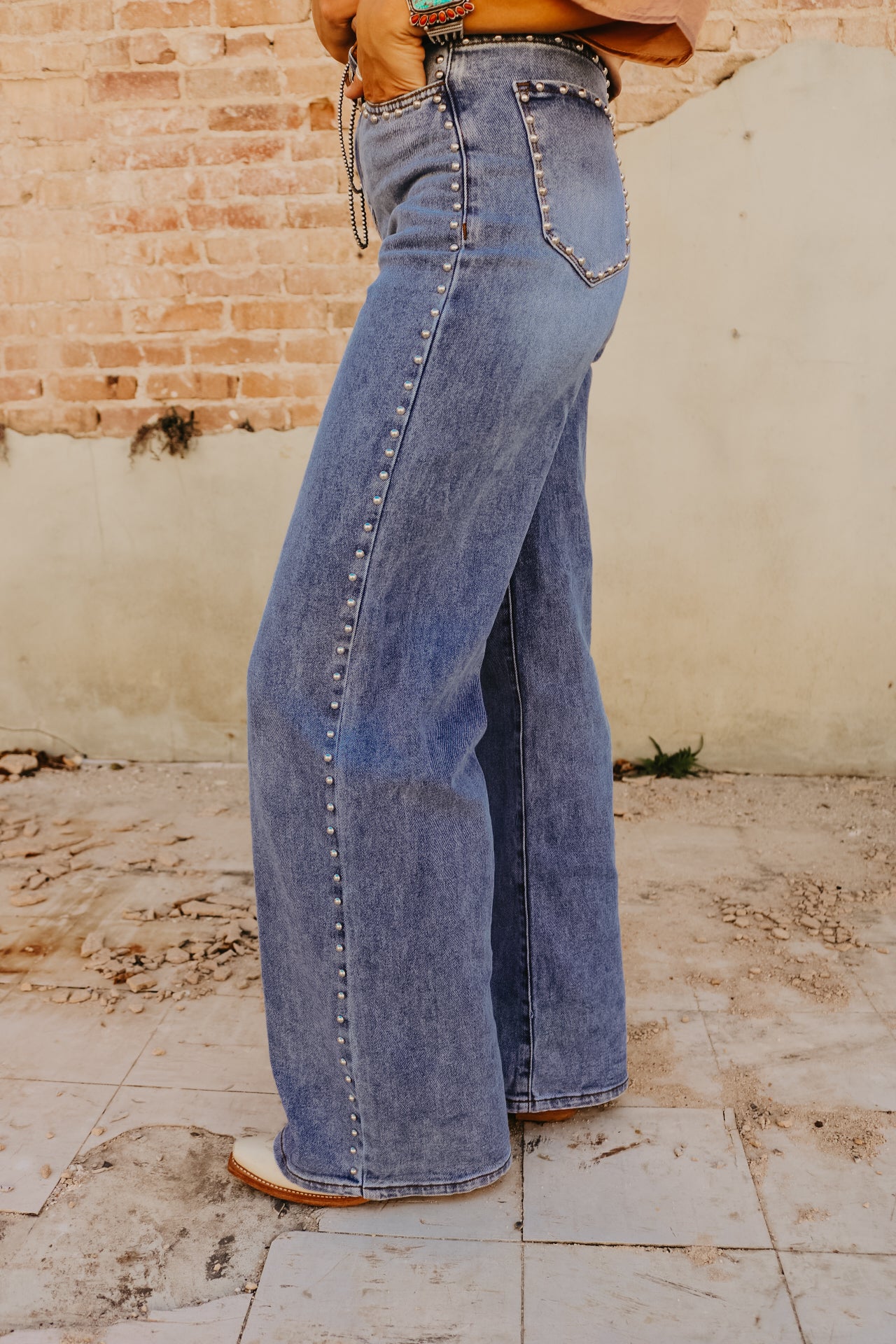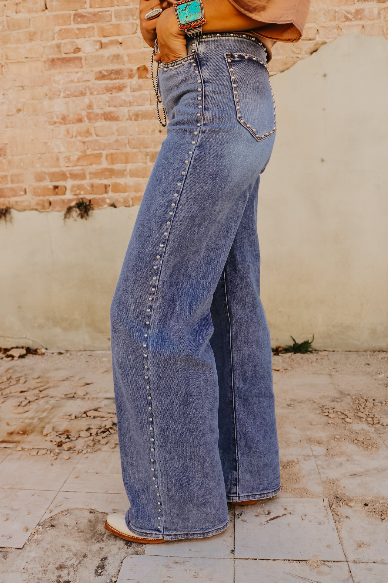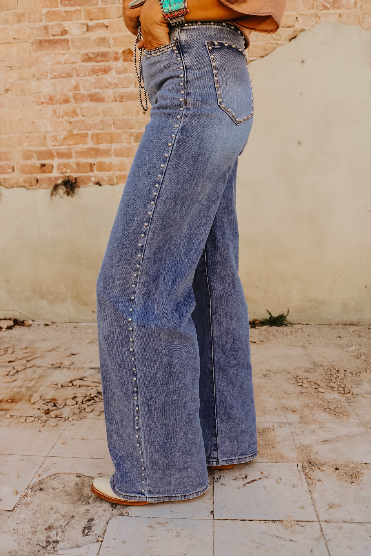 High Waisted Wide Leg Studded Trim Jean