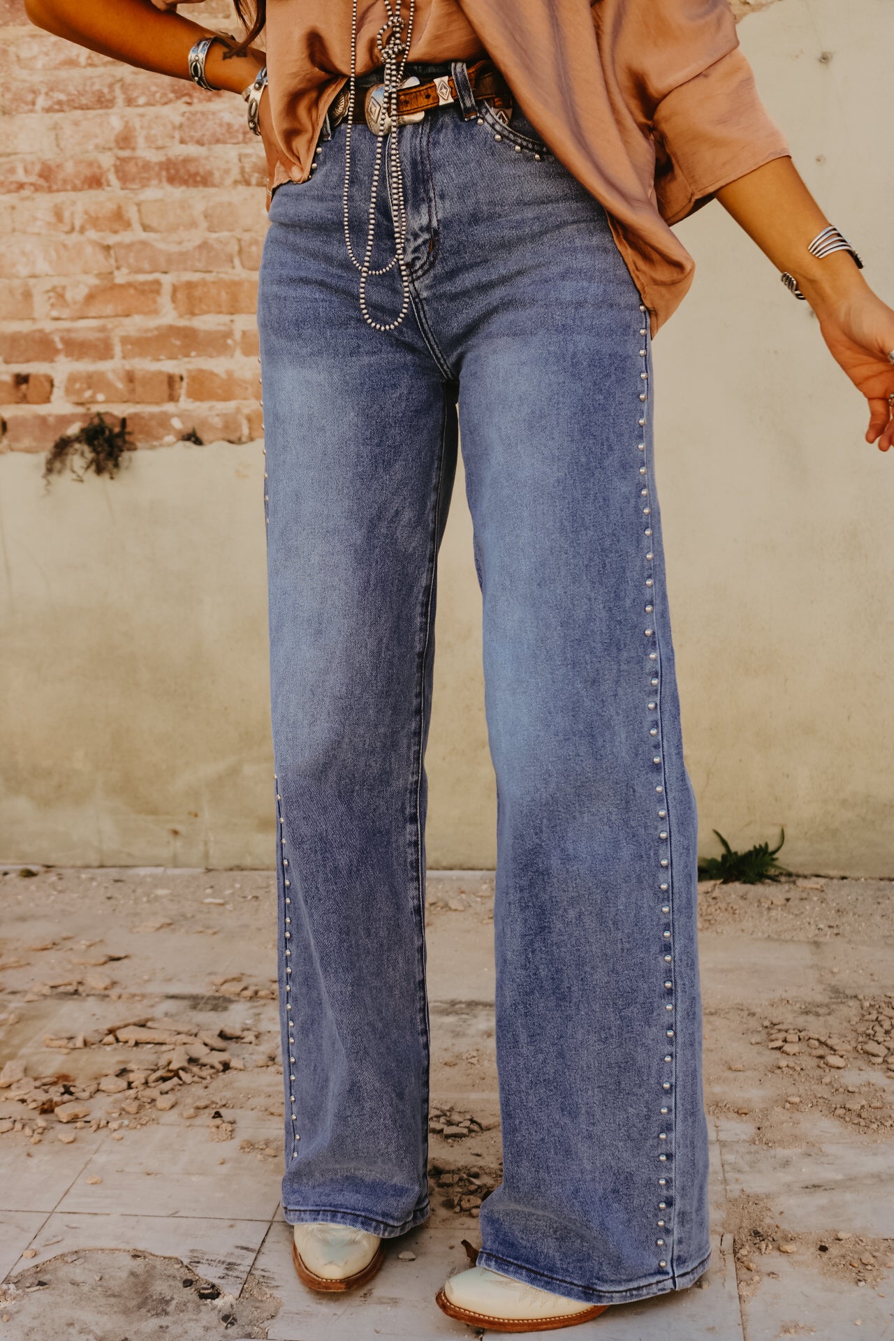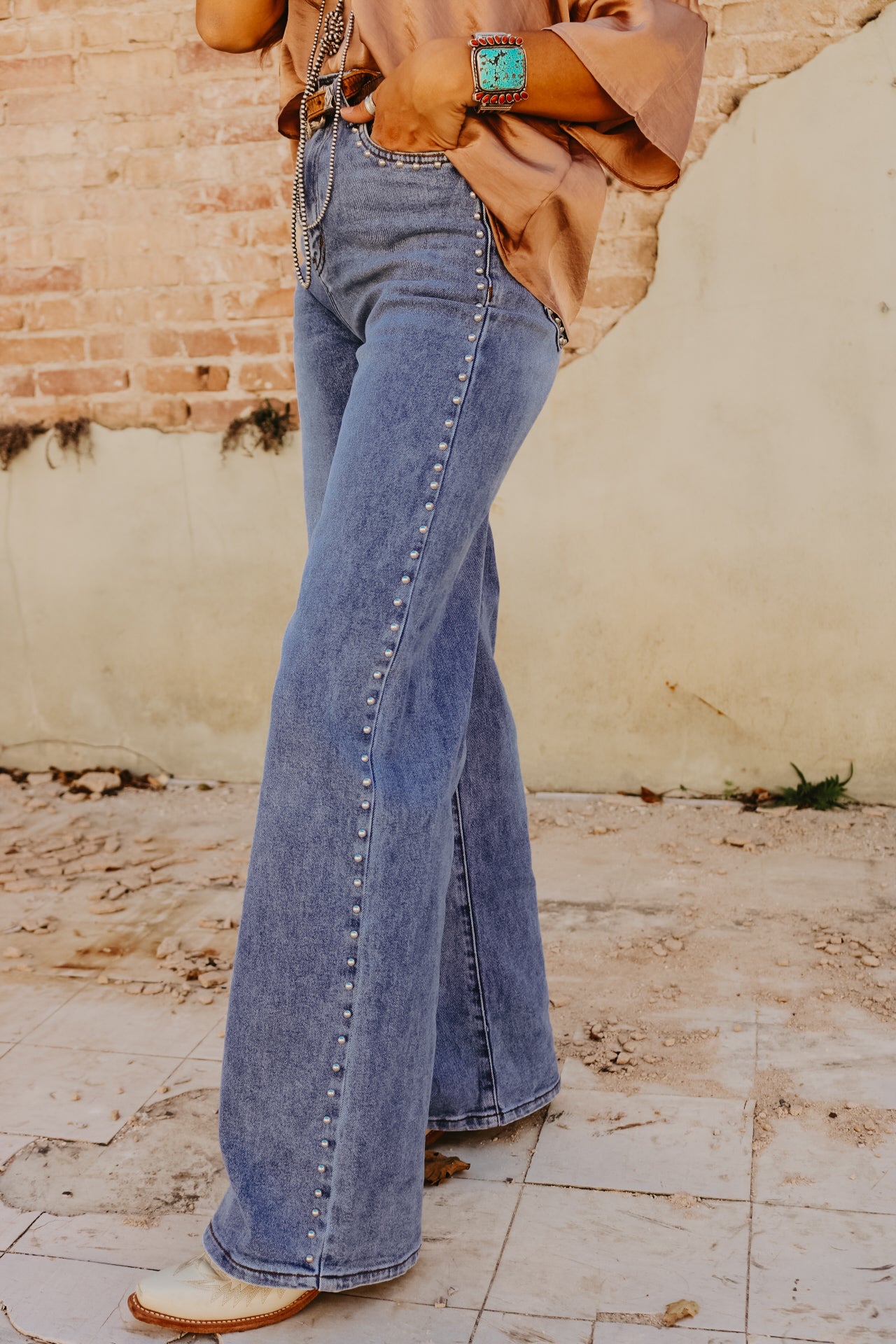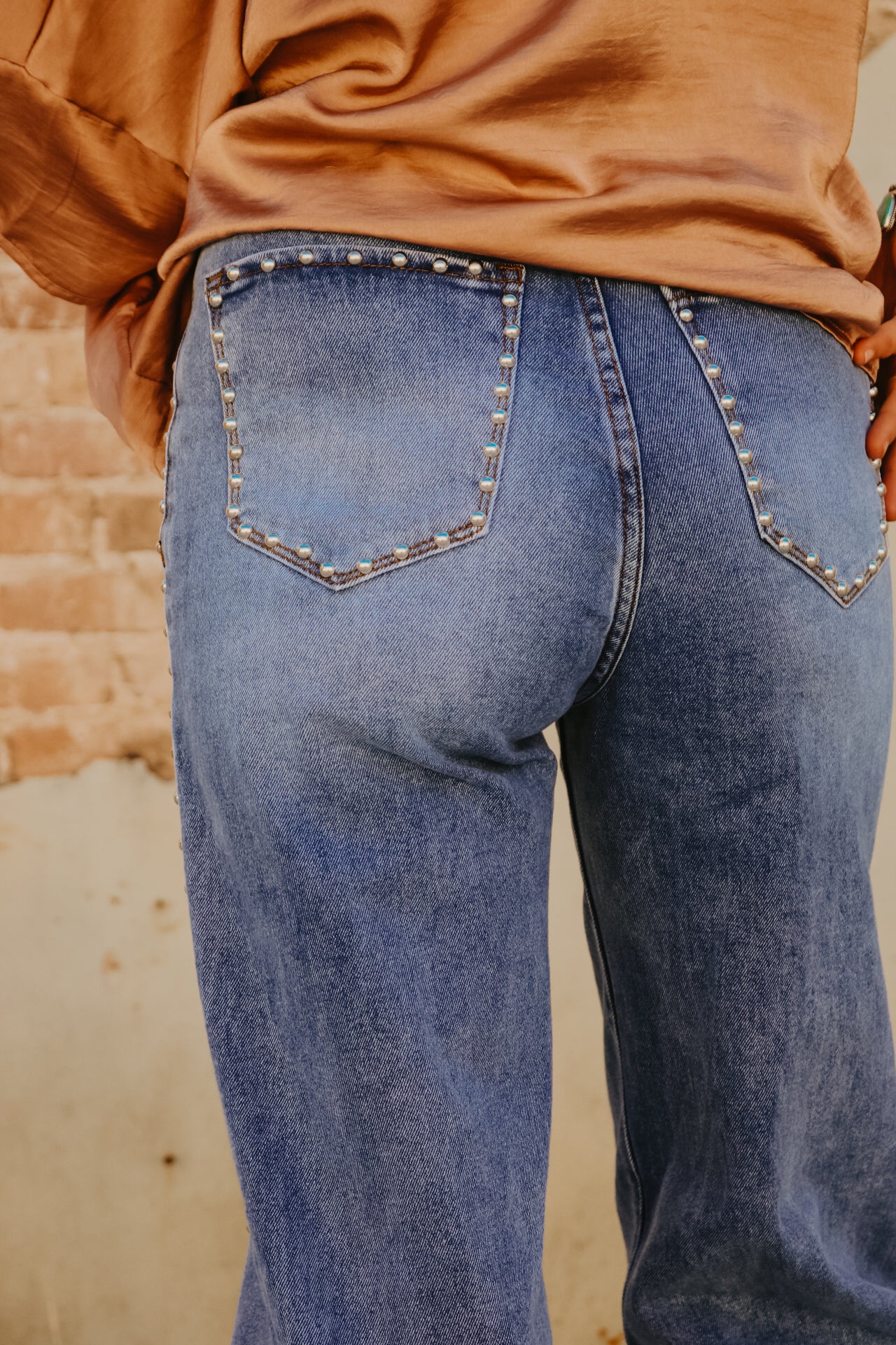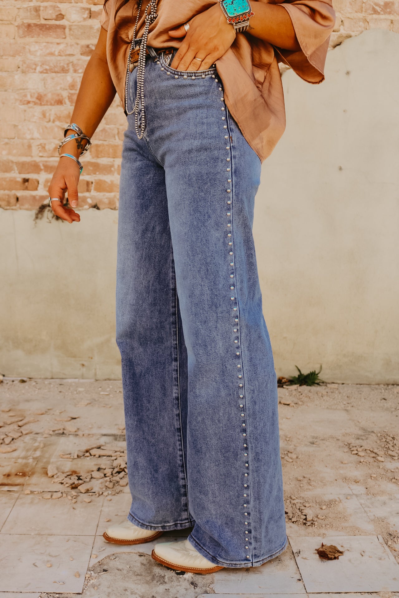 High Waisted Wide Leg Studded Trim Jean