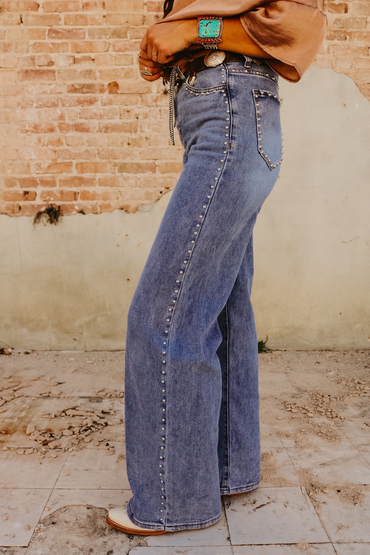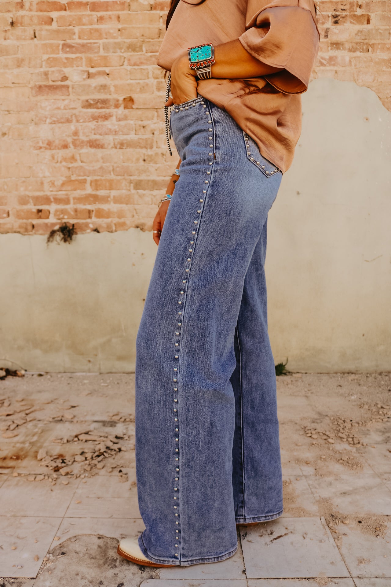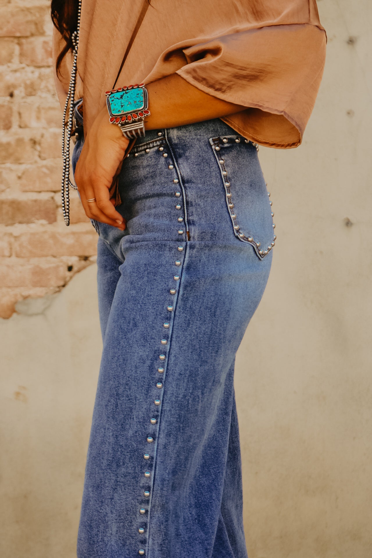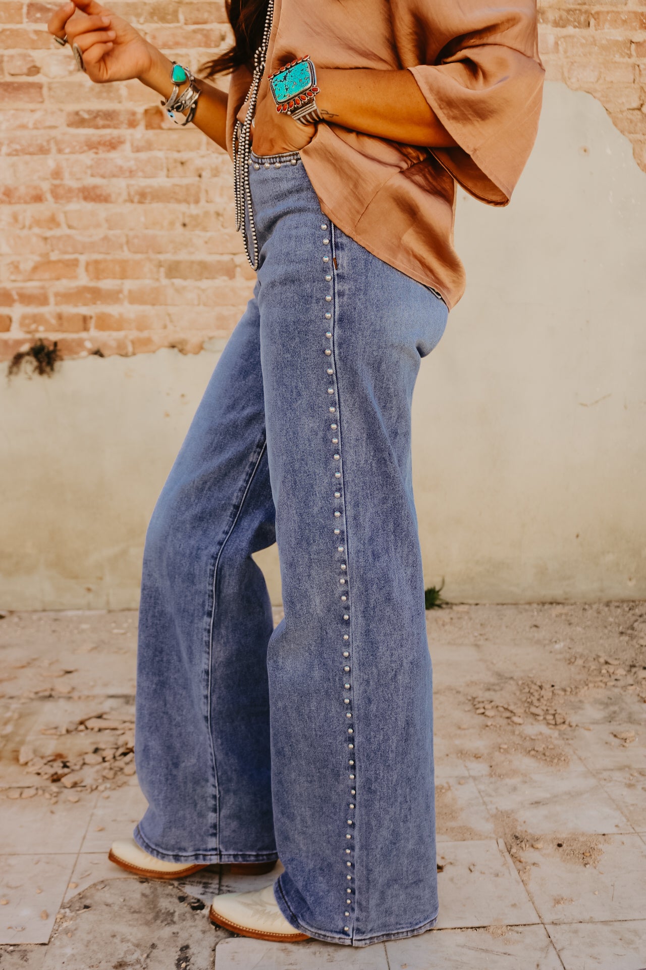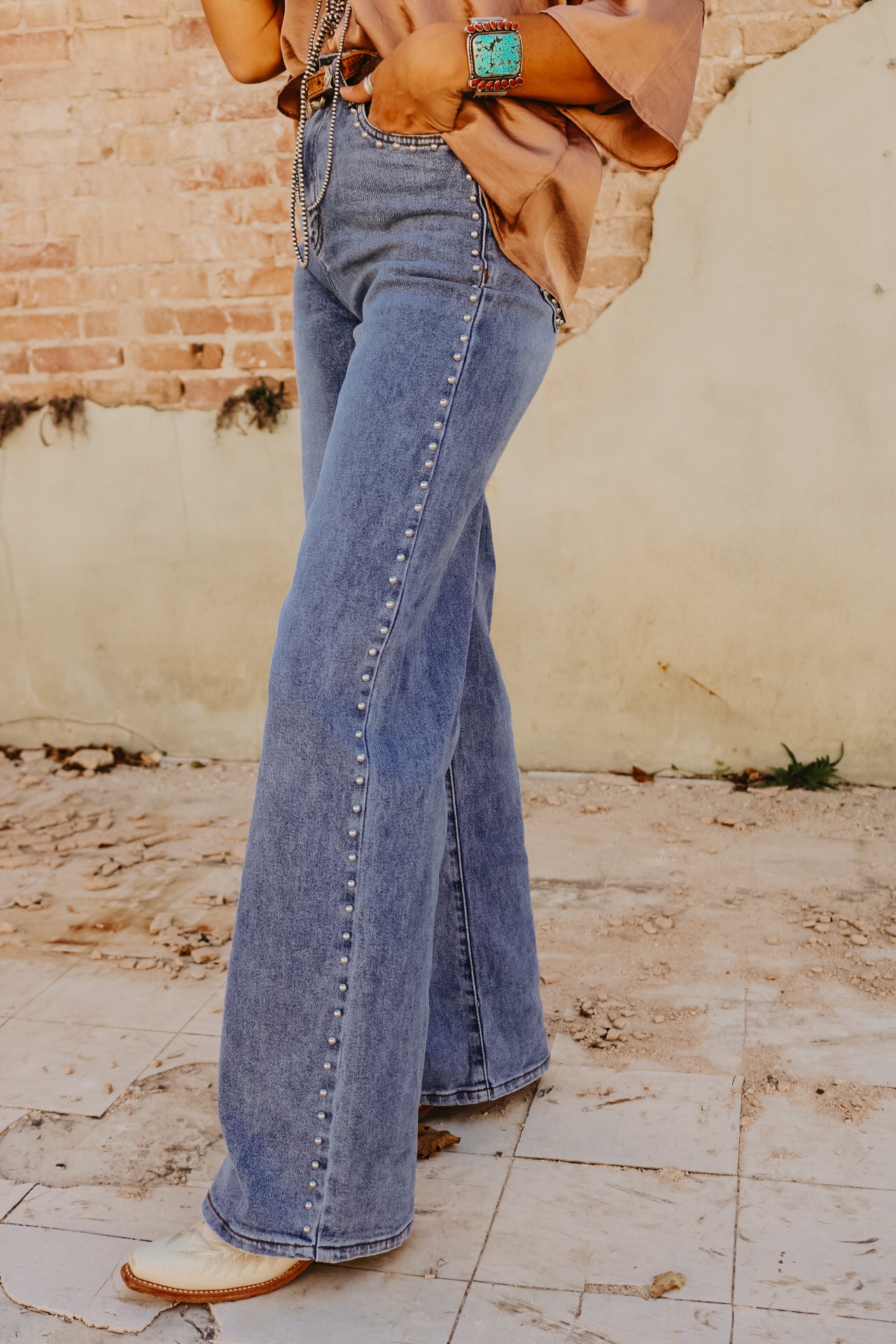 High Waisted Wide Leg Studded Trim Jean