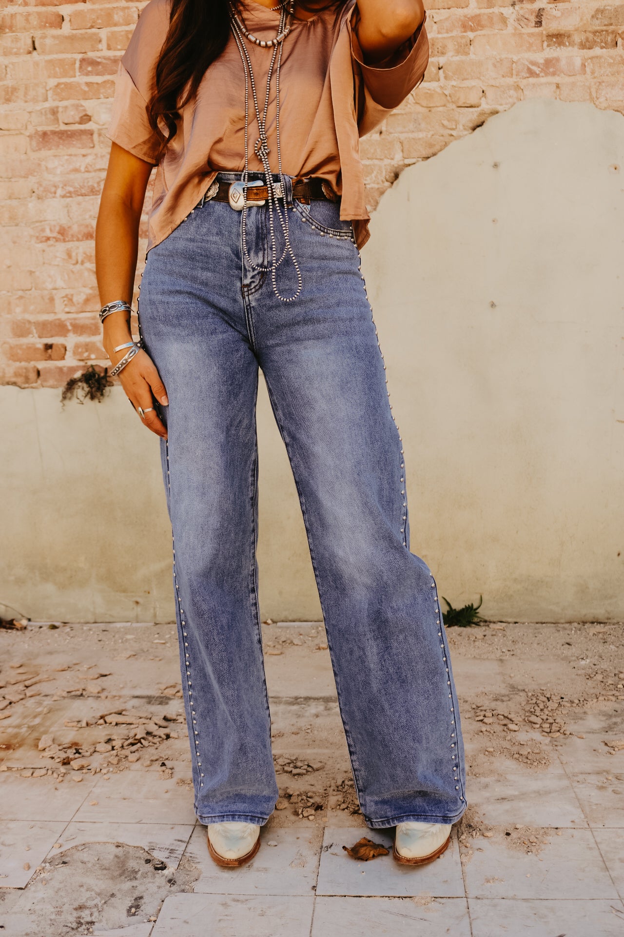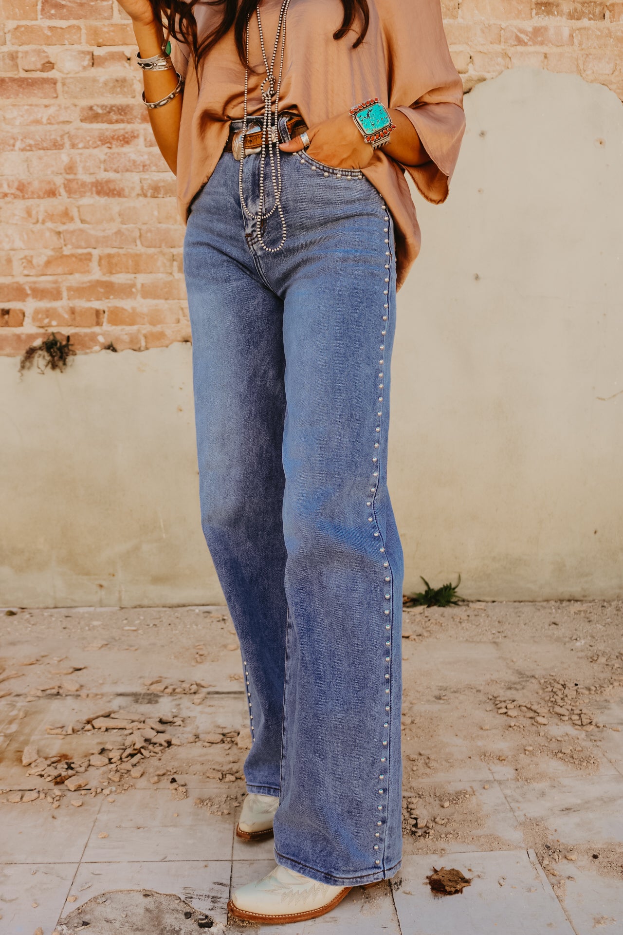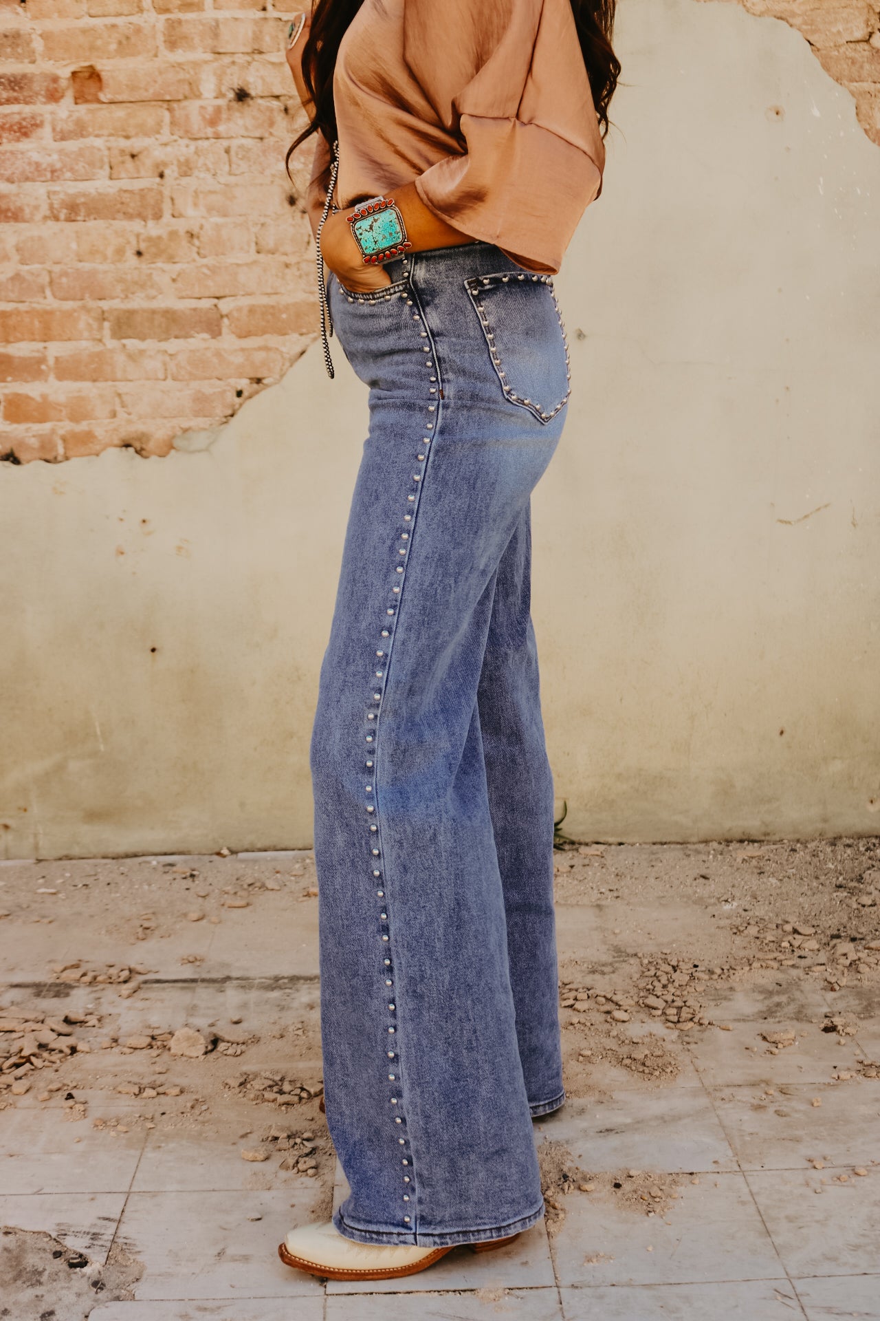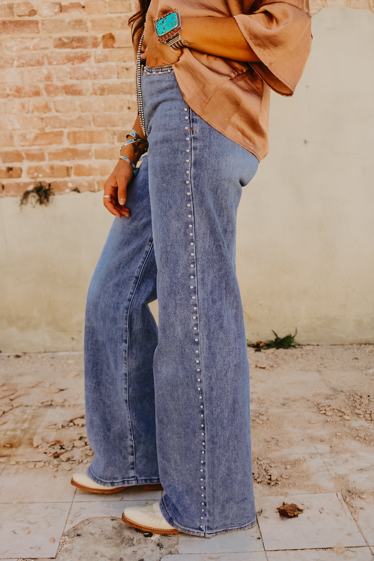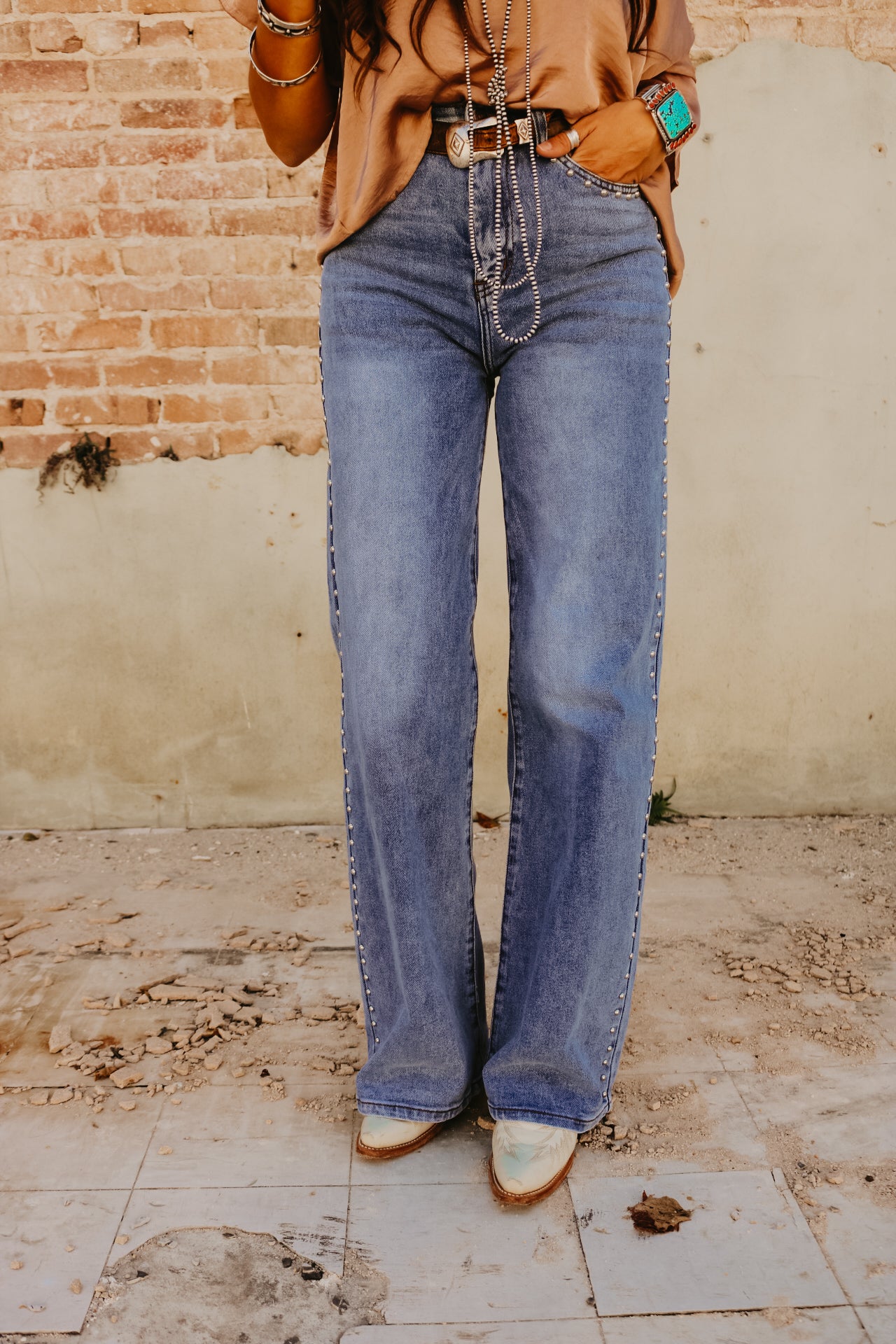 High Waisted Wide Leg Studded Trim Jean