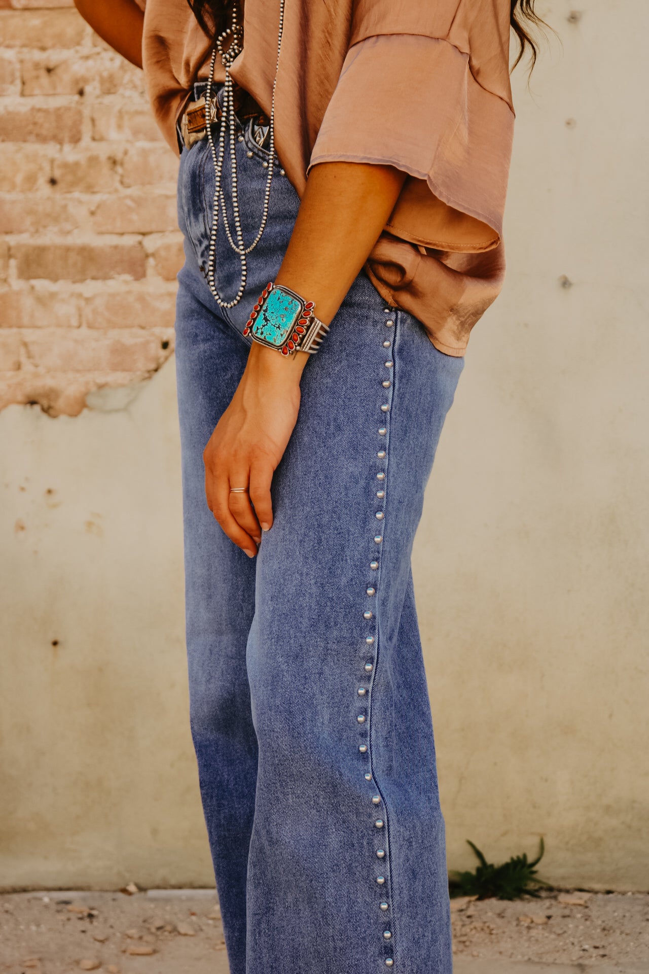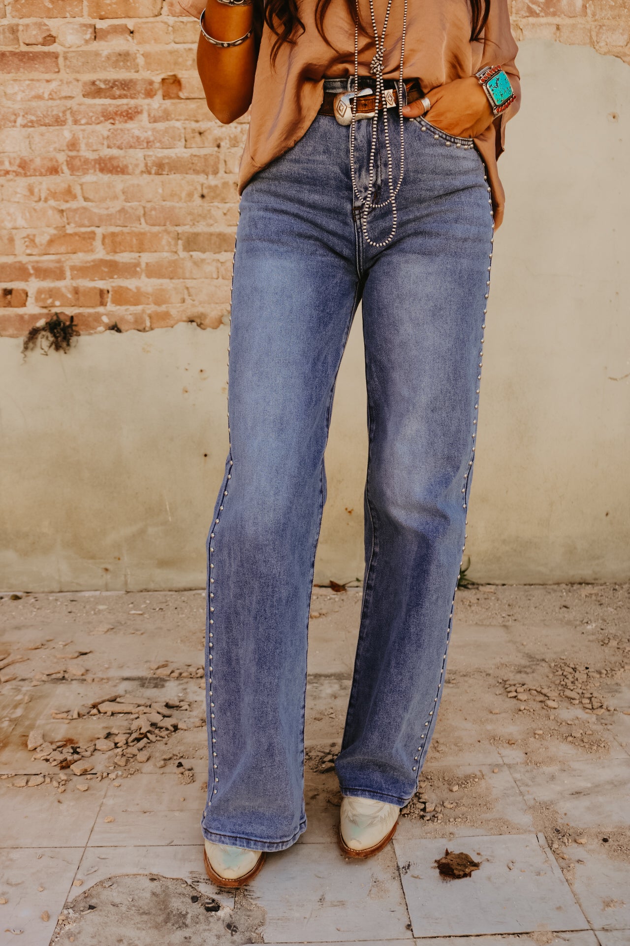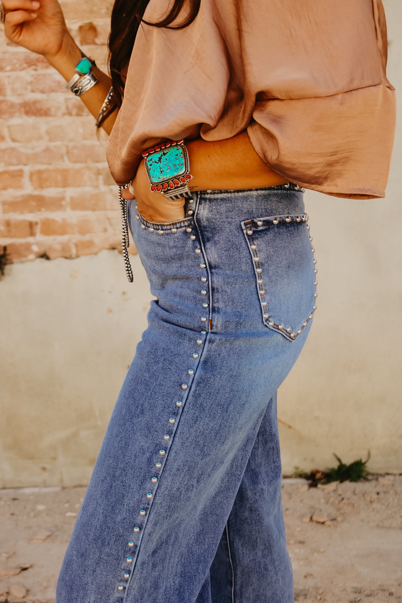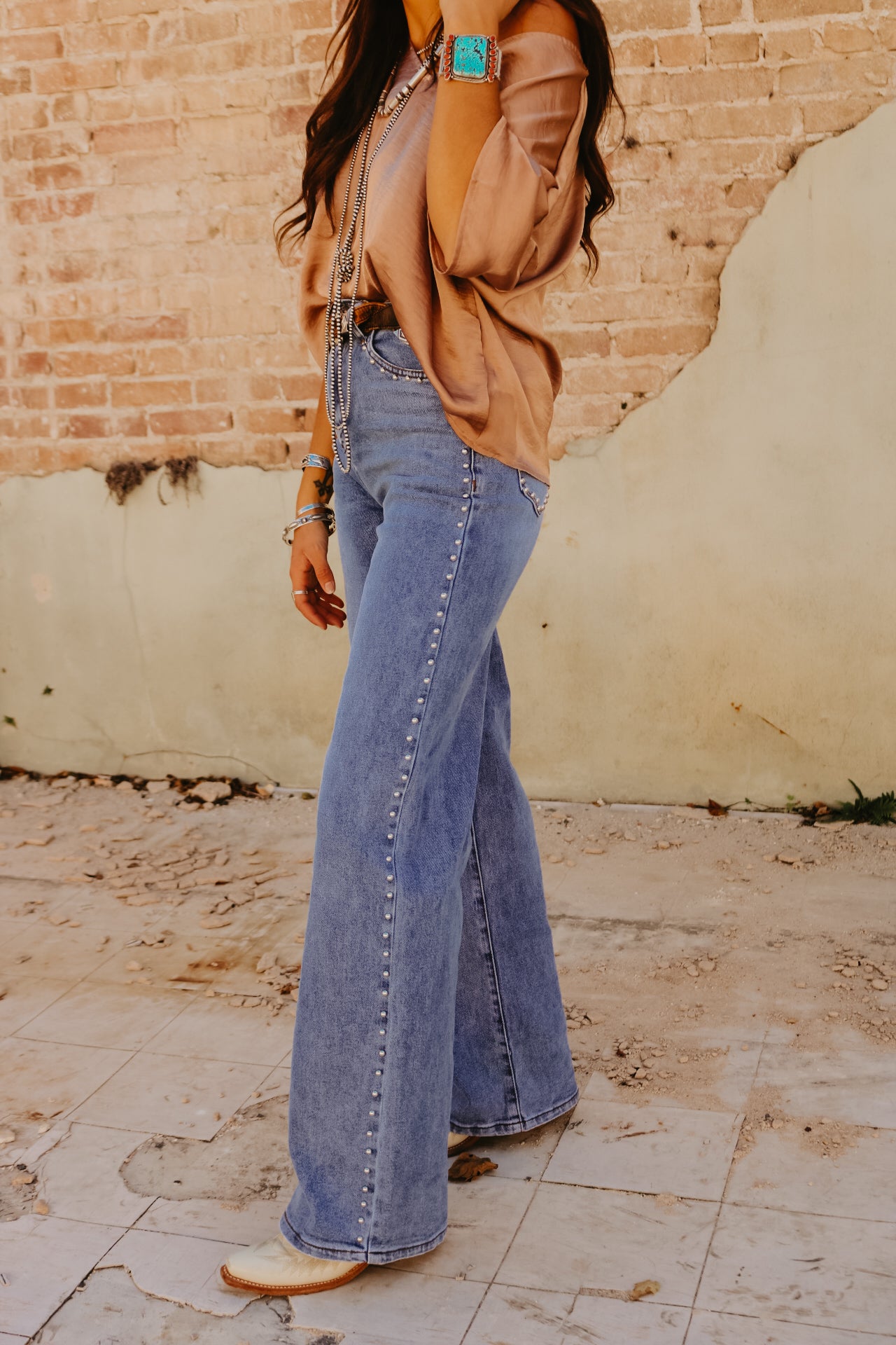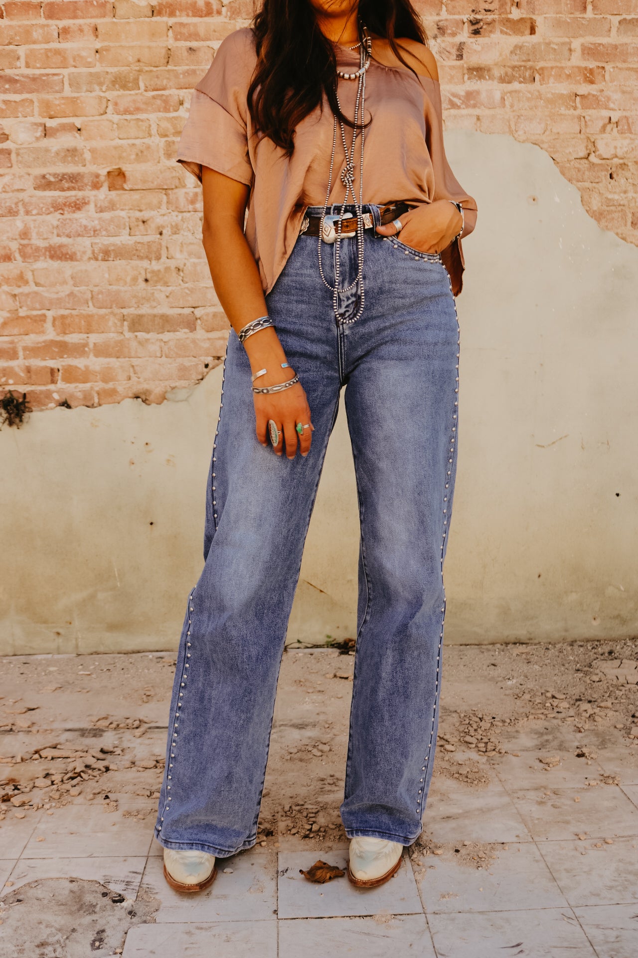 High Waisted Wide Leg Studded Trim Jean