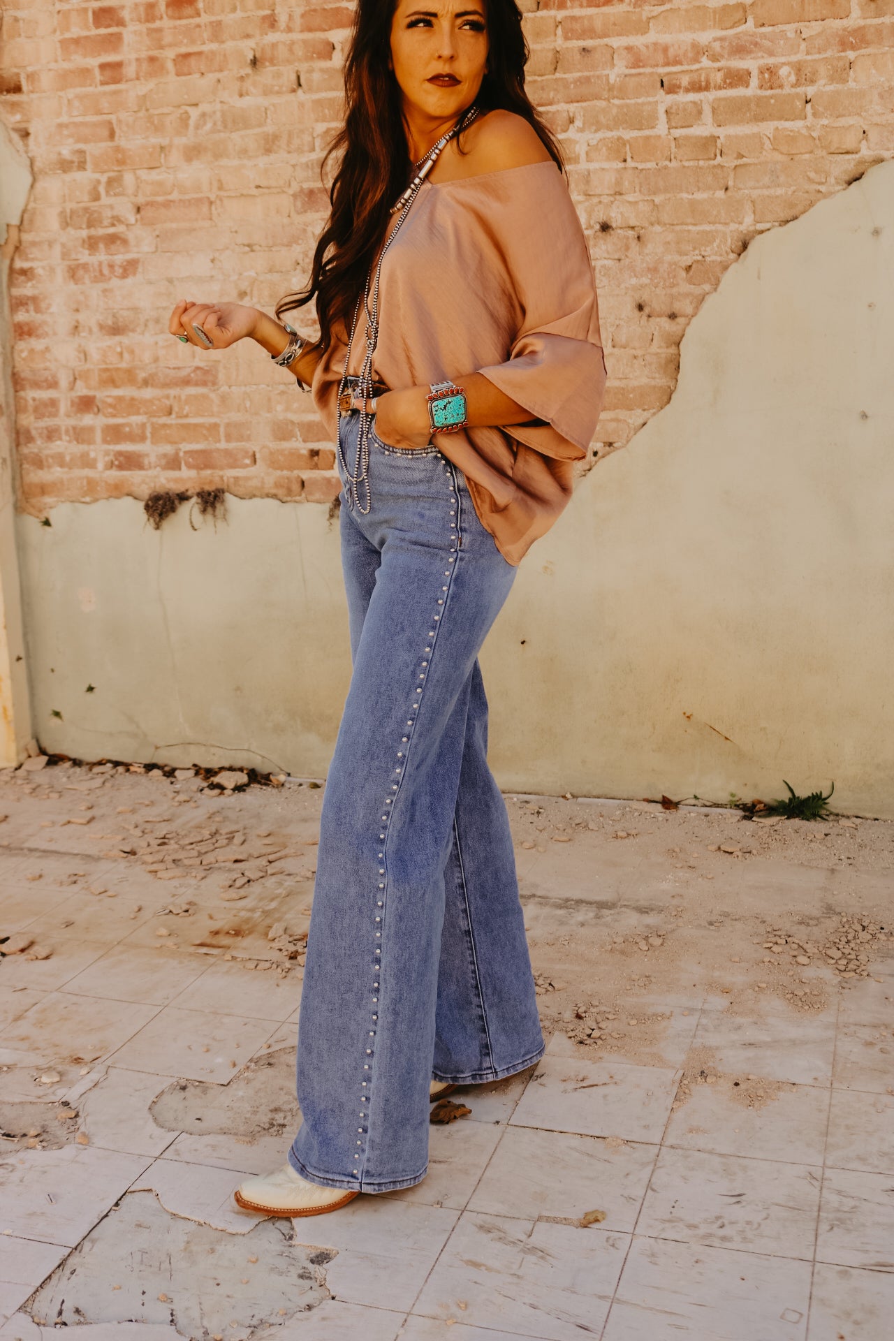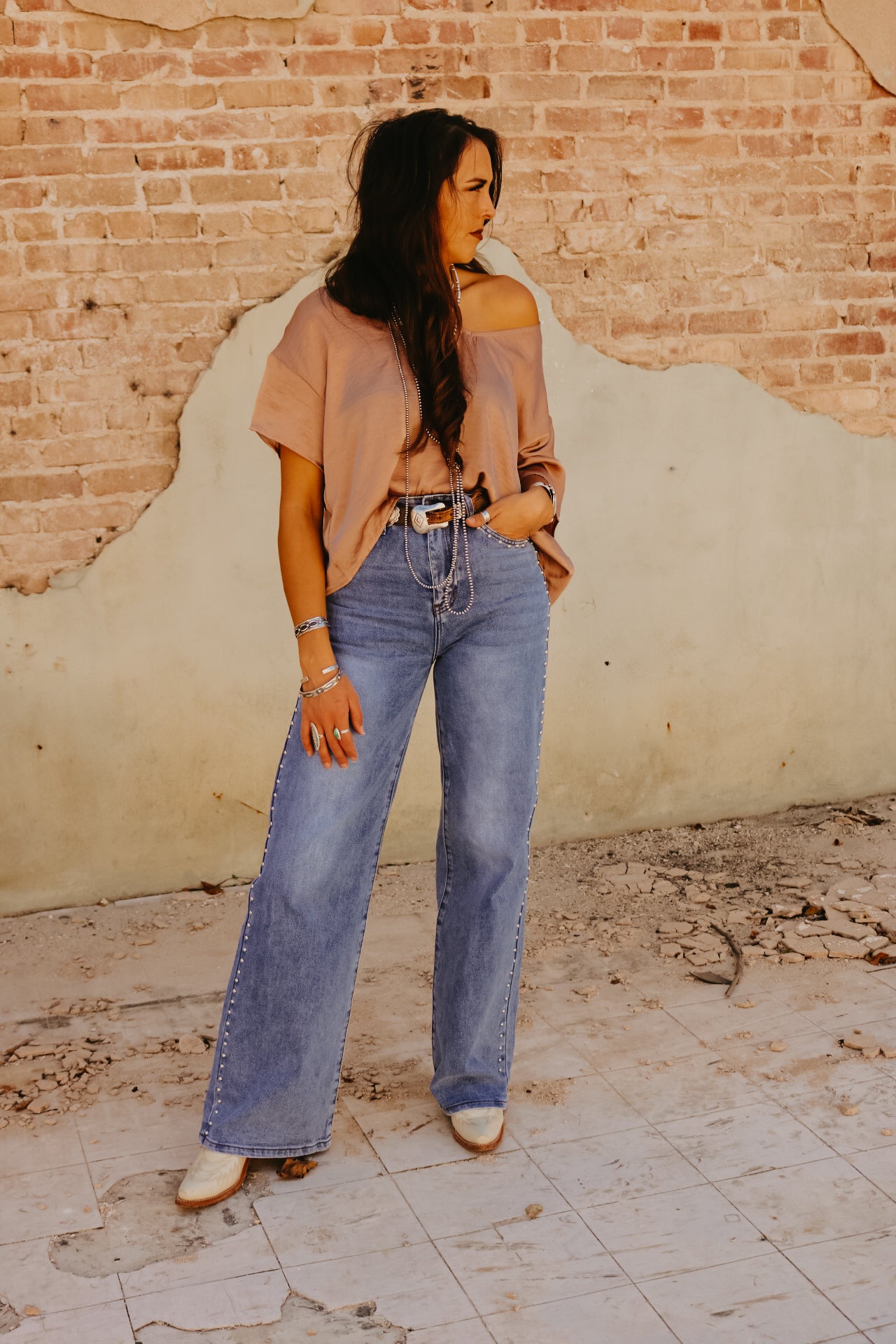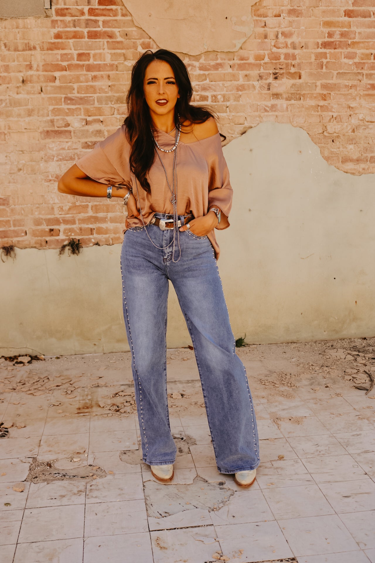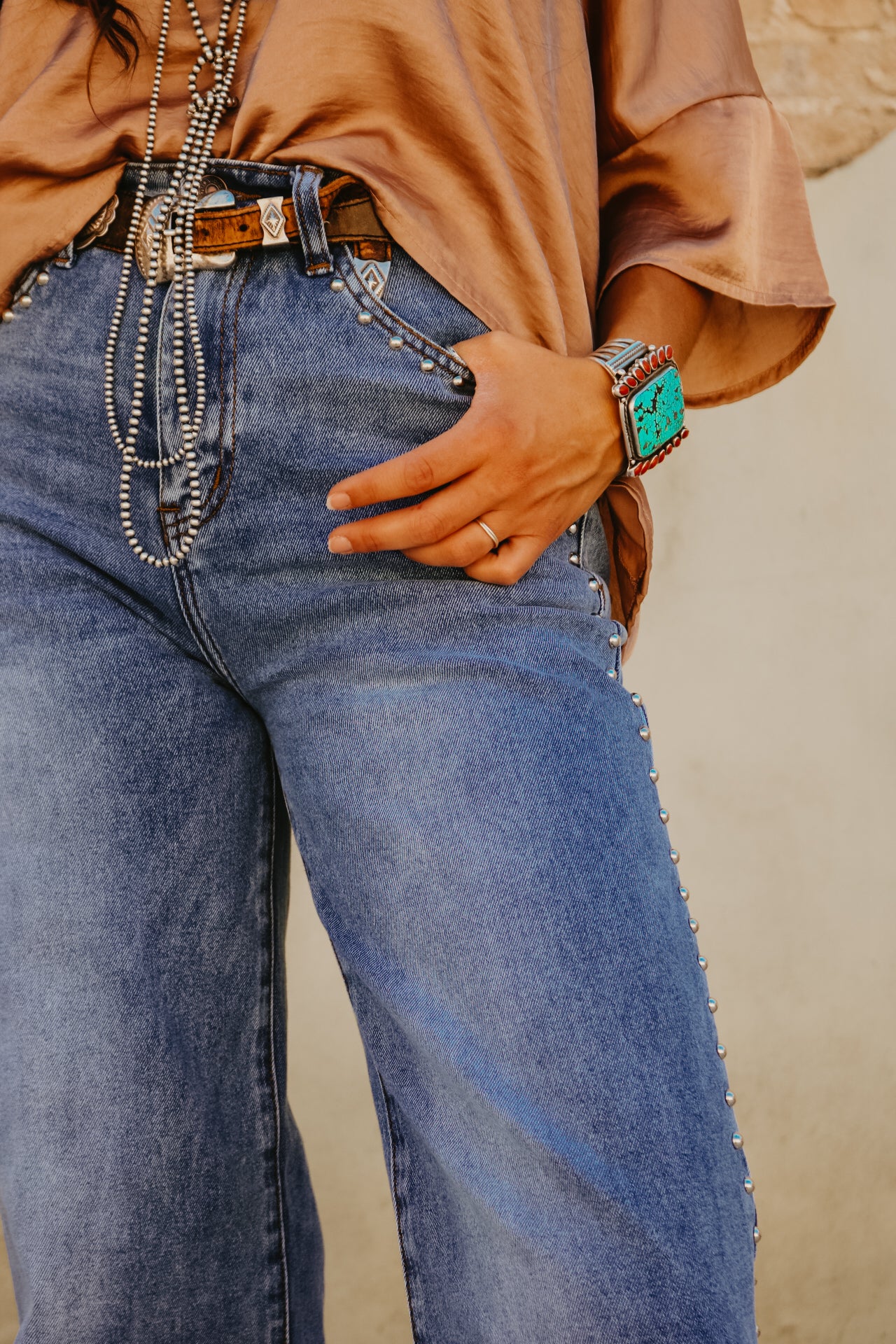 High Waisted Wide Leg Studded Trim Jean